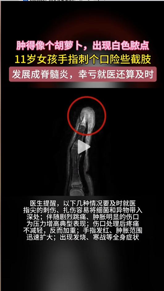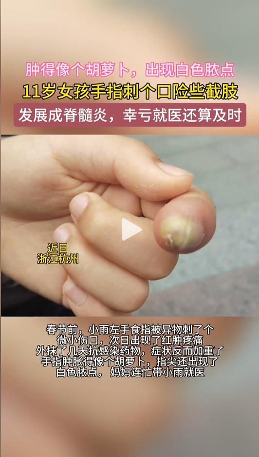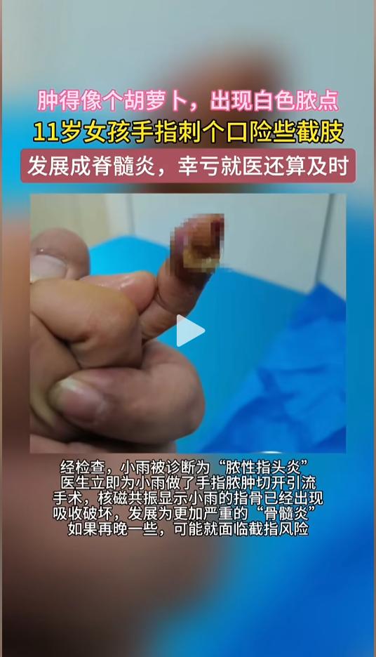 “万万没想到!”近日,浙江杭州,一小女孩手指被异物刺破了一个小伤口,到了第二天,受伤的手指头开始有些疼痛,涂抹了些抗感染的药物。没想到几天后,情况变得愈发严重,指尖甚至出现了白脓啊,这才赶紧去了医院。医生:再晚来几天可能就得截肢! 日常生活中,难免会有点磕磕碰碰,小伤小痛的,不太严重的自己忍忍就扛过去了。可有些小伤,千万得引起注意。 据媒体2月26日报道,小雨今年十一岁,不久前手指头被异物刺破了。她当时也没有在意,到了第二天,手指头开始红肿,还有点疼痛,她就涂抹了一些抗感染的药物。 一连抹了几天,没想到症状却越来越严重了。小雨手指头变得更肿了,像根小胡萝卜,指尖还出现了白色脓点。这可把她吓坏了,赶紧让妈妈把她带去了医院。 医生检查后,小雨被确诊为“脓性指头炎”,立即给她安排了手术,将手指脓肿切开并做了引流。检查时做的核磁共振显示,小雨的指骨出现了吸收破坏,已经向“骨髓炎”发展。来的再晚一些,可能就要面临截肢了。 网友看后表示,太吓人了,就这点小伤,结果怎么能这么严重呢?以后受伤都不敢自己处理了。 同时也提醒大家,指尖刺伤容易将细菌带往深处,一定要注意及时正确处理。如果涂抹药物后,症状没有减轻,或者出现发烧、寒战等着症状,务必立即前往医院就医! 信息来源:《11岁女孩手指刺个口险些截肢 发展成脊髓炎,幸亏就医还算及时(都市快报)》半岛晨报