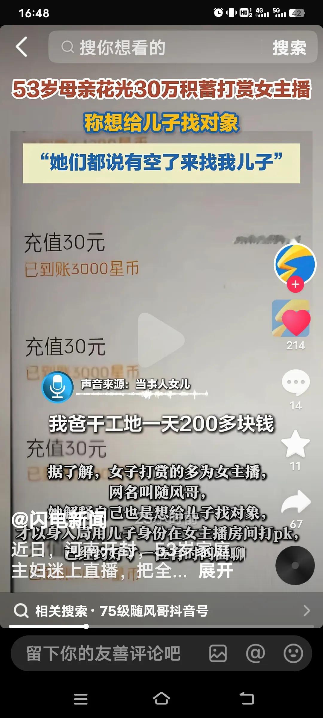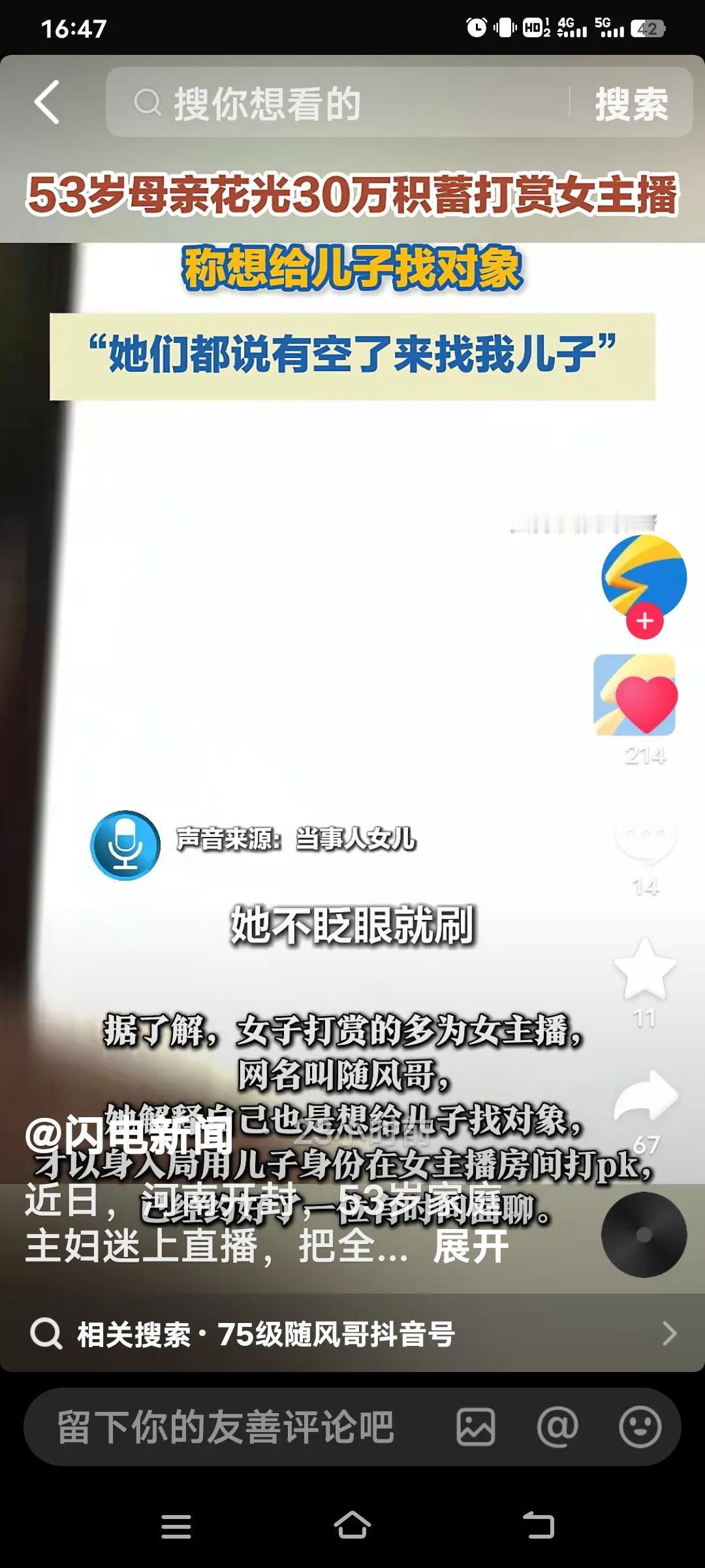 世界之大,真是无奇不有!河南开封有位53岁的家庭主妇,为了给儿子找对象,竟花光30万打赏女主播。 她不仅把丈夫在工地辛苦4年攒下的30万血汗钱全部打赏出去,还卖掉了丈夫给她买的金项链。女儿气愤地说,爸爸挣的钱都交给妈妈保管,妈妈怎么能这样呢?妈妈还说谁能没有错。更离谱的是,她竟以儿子的身份打赏女主播,试图给儿子找对象,实在是令人匪夷所思! 然而,那些女主播不过是把她当成提款机,所谓“有空找你儿子玩”不过是句空话。她丈夫一天才挣200多元,辛辛苦苦攒的钱就这样没了。 可想而知,这家庭矛盾肯定不小。这位母亲的做法实在是太不理智了,打赏女主播怎么可能解决儿子的婚姻问题呢?她显然是看直播上头了,也不知道这来之不易的血汗钱还有没有希望要回来。开封王女士 开封打赏事件