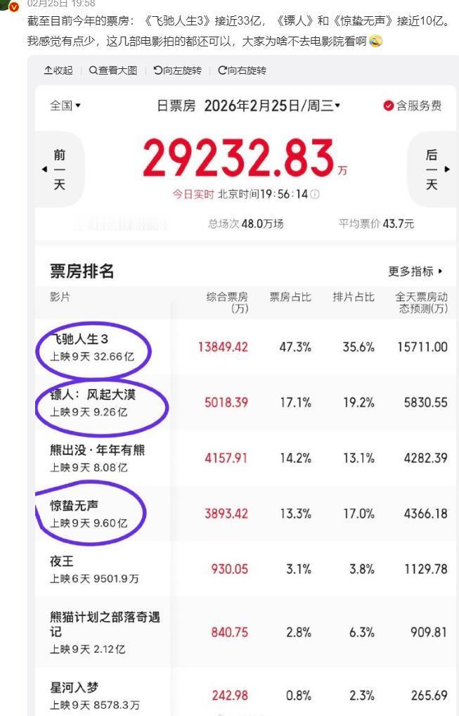 今年的春节档票房太有趣了! 《飞驰人生3》一家独大,票房已突破34亿, 《惊蛰无声》刚刚突破10亿, 《镖人》还在为突破10亿而努力, 《熊出没》上座率比惊蛰无声好,排片量却始终被它压着, 搭上春节档末班车的“小众电影”《夜王》,在没什么营销的情况下, 已经悄悄超过了顶流王鹤棣的电影,成为第五部破亿的春节档影片。 这部片子一开始只在两广上映,后面是观众呼声太大,才扩到了全国。 无论是上映时间,还是营销或者排片量,《夜王》都不如《星河入梦》, 但是它的票房却超了后者。 这是不是说明,在电影圈,普通流量的票房号召力,远不如有口碑的实力派演员。