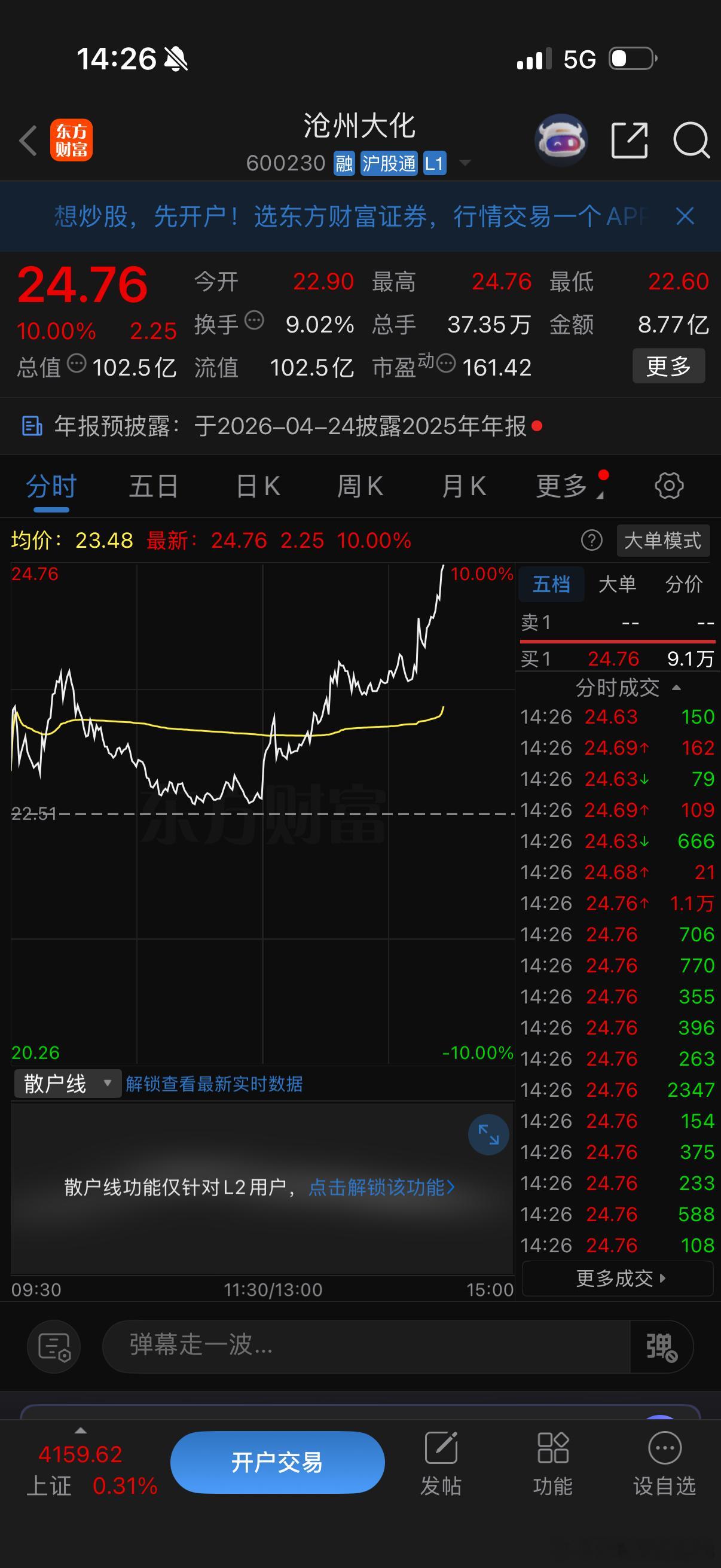 沧州大化强势涨停恭喜