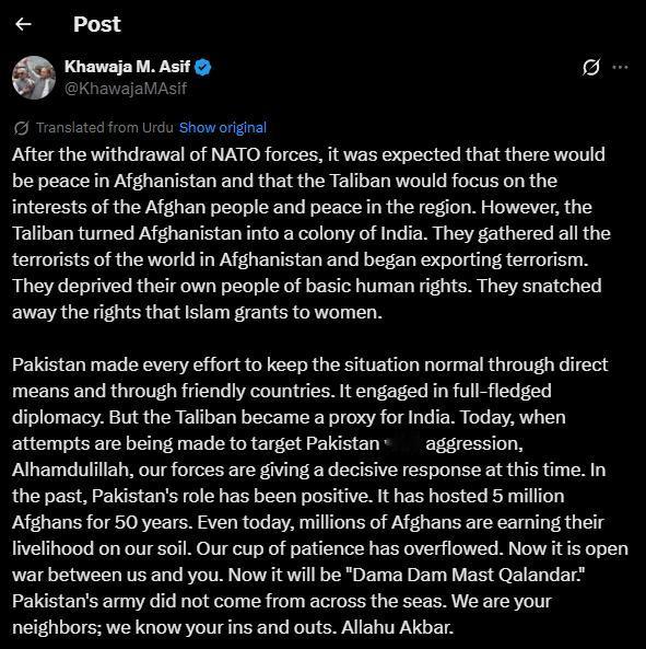 巴基斯坦国防部长刚刚向阿富汗宣战 霍贾·穆罕默德·阿西夫: “我们的耐心已经到了极限。现在要公开对抗了。” 现在将采取果断行动。 此前数日,暴力事件不断升级。 巴基斯坦上周对阿富汗领土发动空袭,塔利班今天对巴基斯坦边境哨所发动大规模进攻予以回应,据报道,战斗已经蔓延到喀布尔市。