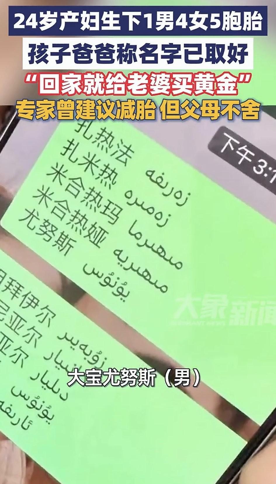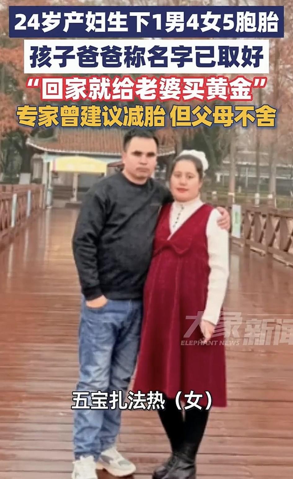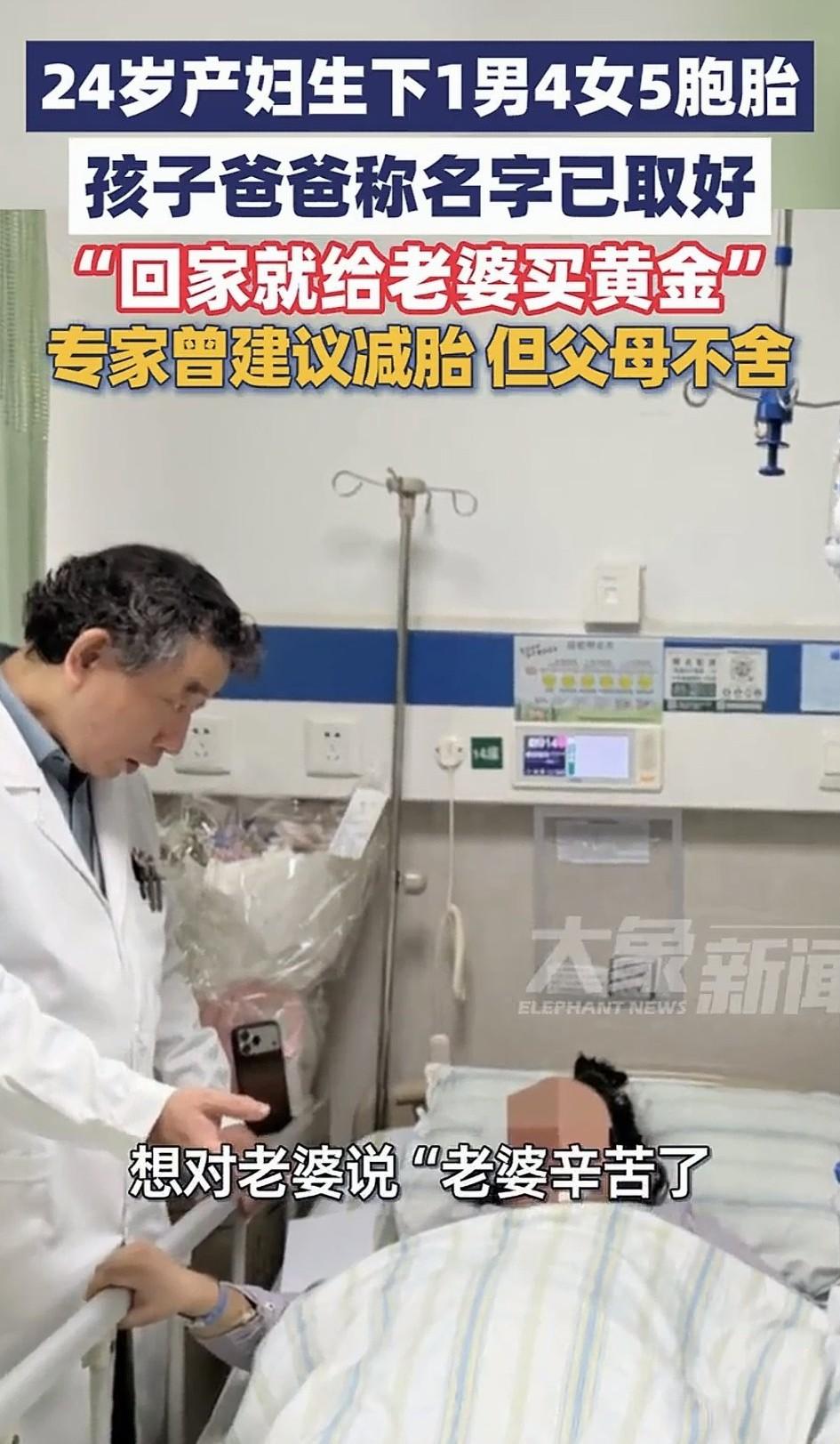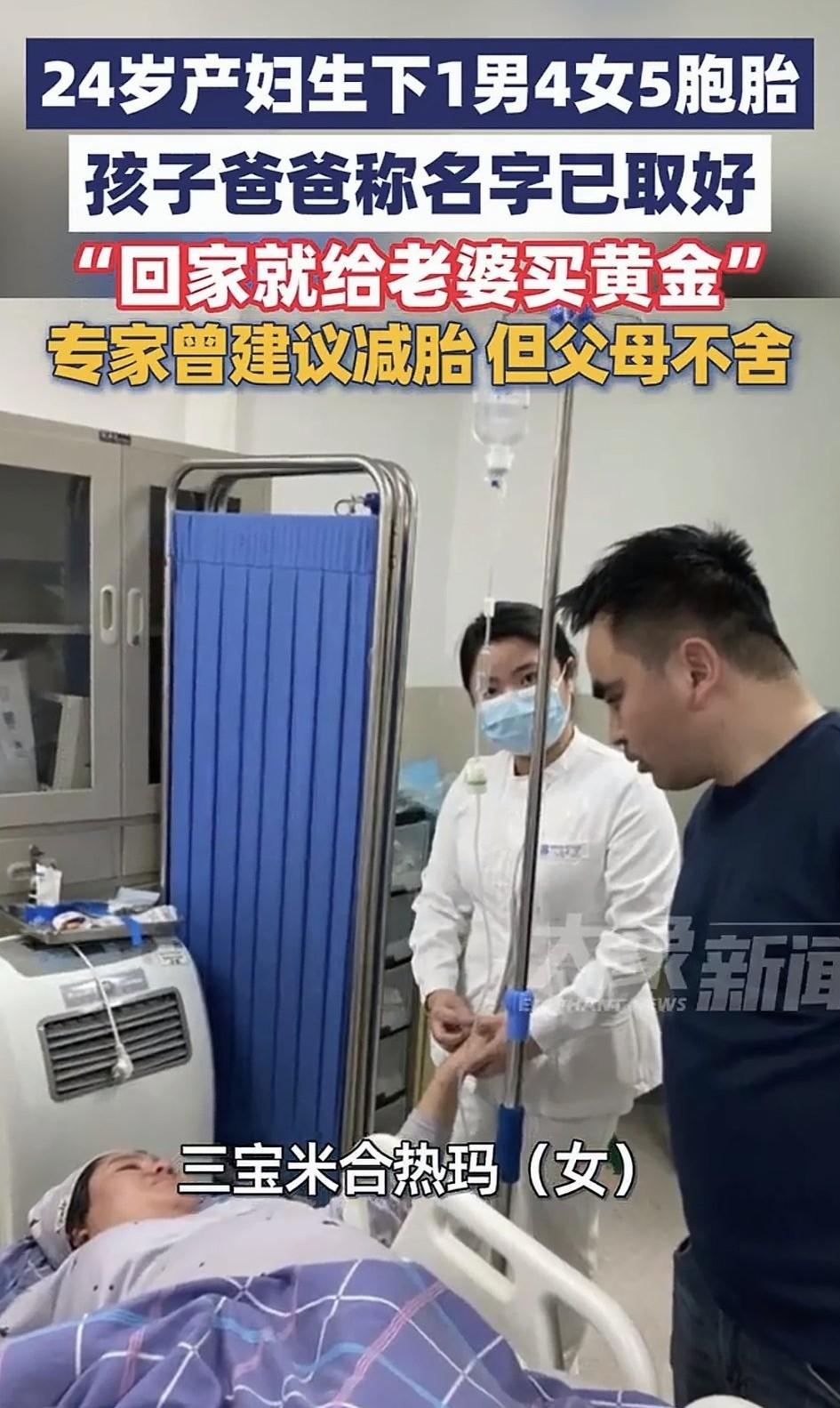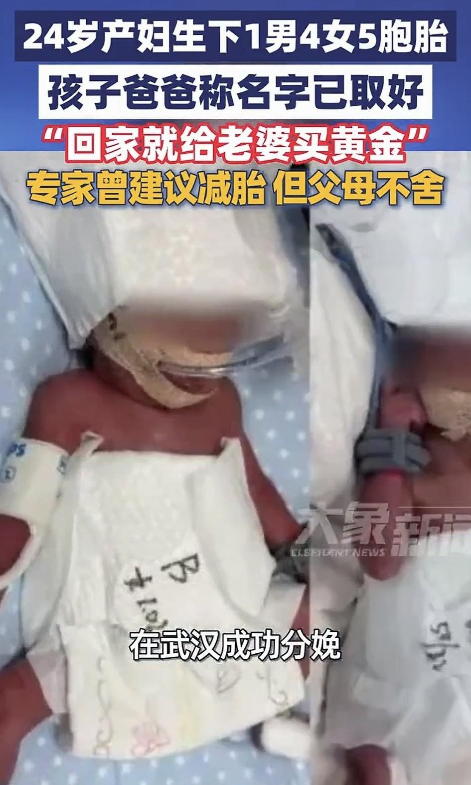 医学奇迹!新疆一24岁女子自然受孕五胞胎,怀胎十月后,成功在武汉大学中南医院顺利分娩了“一男四女”五胞胎! 据悉,当时产检查出是五胞胎时,因妊娠风险极高,医院专家就曾建议女子减胎,但夫妻俩都不舍,毕竟每一个孩子都是一条生命,于是他们决心五个孩子都要。 也正是他们的坚持,如今五个孩子都顺利出世了,虽然孕期女子也遭了不少的罪,但看着五个孩子顺利出世,女子也觉得一切努力都值了,而一大家子也都为此非常开心。 而老公也深知老婆的辛苦,他在镜头前真诚的对老婆说道:老婆辛苦了!回家给你送黄金!做你爱吃的抓饭、烤包子! 不得不说,这不仅是医学奇迹,更是生命奇迹!要知道,五胞胎属于极高风险的多胎妊娠,对母婴健康构成严重威胁,其风险远超单胎妊娠,医学界都将其称为:生命的极致奇迹! 医生也科普到,全球自然受孕诞生五胞胎的概率仅为约六千万分之一,而且五胞胎几乎100%会早产,多数在孕28-32周之间出生,远未达到足月(37周)。 这也导致早产儿器官发育不成熟,面临严峻的生存挑战,这种情况下,存活率和远期健康风险都是严峻的考验。除此之外,孕期母婴并发症风险更是极高及其危险。 首先对母亲的影响就包括,产后大出血、并发妊娠期高血压、妊娠期糖尿病、胎盘早剥等严重风险。 再就是对胎儿,因五个胎儿在一个宫腔里,不但会导致宫内发育受限,还可能面临胎位异常、染色体异常等等严重问题。 总之,多胎妊娠的围产期死亡率是单胎的数倍,而这年轻妈妈不但创造了奇迹,更是体现了母爱的伟大!倘若不是她的坚持和义无反顾,恐怕就没有五条鲜活生命的诞生了吧!这么伟大的母亲(妻子)必须好好奖励!必须好好爱惜了!