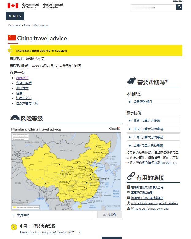 我们好心好意给加拿大开通了免签,欢迎加拿大人来旅游,但是加拿大却在他们官方网站把中国标为黄色区域,提醒加拿大居民慎重选择中国旅游。 加拿大这操作,简直是好心当成驴肝肺!咱们国家2月17号刚出台政策,对加拿大持普通护照的人,实施30天免签入境,就是想欢迎加拿大人来中国旅游、交流,一片真心实意。 谁能想到,这份善意刚送出去没几天,加拿大就反手给了咱们一记“闷棍”,他们政府官网2月24号更新页面,把中国标注成黄色旅行提示区域,还提醒本国公民,去中国要保持高度谨慎,说白了就是不建议去。 说句实在的,这操作真的让人火大,咱们敞开心扉欢迎他们,免签政策一出台,不少加拿大游客都表示想来中国看看,结果加拿大官方倒好,直接泼冷水、唱反调,把咱们的善意当成空气,甚至还暗戳戳诋毁。 大家都知道,咱们国家这些年的治安、环境,那都是有目共睹的,不管是城市还是乡村,环境干净整洁,人与人之间也和睦友善,走到哪儿都让人放心,加拿大凭啥把咱们划为黄色区域,说什么要保持高度谨慎? 咱们国家的免签政策,本来就是互利共赢的好事,加拿大人来中国,能看看咱们的大好河山,体验不同的文化,咱们也能带动旅游、消费,双方都能受益,可加拿大偏偏不领情,非要搞这种伤人伤己的操作。 有网友翻了加拿大政府官网的其他提示,发现不少比咱们国家安全风险高的国家,都没被标成黄色区域,反而咱们这个治安良好、环境优美的国家,被他们刻意针对,这种双重标准,简直让人无法接受。 其实熟悉国际旅游提示的人都知道,黄色区域一般是指存在一定风险、需要谨慎前往的地方,咱们国家这么安全,别说什么风险,就连游客丢个东西,都能很快找回来,怎么就成了需要“谨慎”的地方? 加拿大一边提醒本国公民别来中国,一边还希望咱们国家对他们免签,让他们的人能自由进出中国,天下哪有这么好的事,只想占便宜、不想付出,还想诋毁别人,真把咱们当软柿子捏? 咱们国家向来友善,对待任何国家都抱着平等互利的态度,开通免签也是出于善意,希望促进两国之间的交流,可友善不代表软弱,加拿大这种忘恩负义、颠倒黑白的做法,咱们绝对不能忍。 不少网友都在吐槽,加拿大这是搬起石头砸自己的脚,咱们国家的旅游市场那么大,加拿大人不来,有的是其他国家的游客来,反而加拿大的做法,会让中国游客也不愿意去加拿大,最后损失的还是他们自己。 还有不少经常去中国的加拿大人站出来说话,说中国特别安全,环境也特别好,加拿大官方的提示太离谱,完全不符合实际情况,他们还说,自己每次来中国,都过得特别安心、特别开心。 咱们国家也不是没给加拿大留面子,免签政策照常实施,没有因为他们的不合理操作就报复,可这份包容,不是让他们得寸进尺的理由,希望加拿大能赶紧醒悟,撤销这种不合理的提示,拿出应有的诚意。 国与国之间相处,最讲究的就是相互尊重、互利共赢,咱们拿出真心对待加拿大,也希望他们能以同样的态度对待咱们,而不是一边享受咱们的善意,一边暗中诋毁、刻意针对。 这件事也让大家看清,不是所有国家都懂得感恩,也不是所有善意都能得到回应,但咱们国家不会因为别人的不合理做法,就改变自己的友善态度,依旧会敞开大门,欢迎那些真心愿意和咱们交流的国家和人民。 随着咱们国家越来越强大,咱们的包容和善意,也应该被尊重,那些刻意针对、诋毁咱们的国家,早晚都会明白,互利共赢才是正道,搞偏见、耍小动作,最后只会得不偿失,被时代淘汰。 大家对此有什么看法呢?欢迎各位在评论区留言!