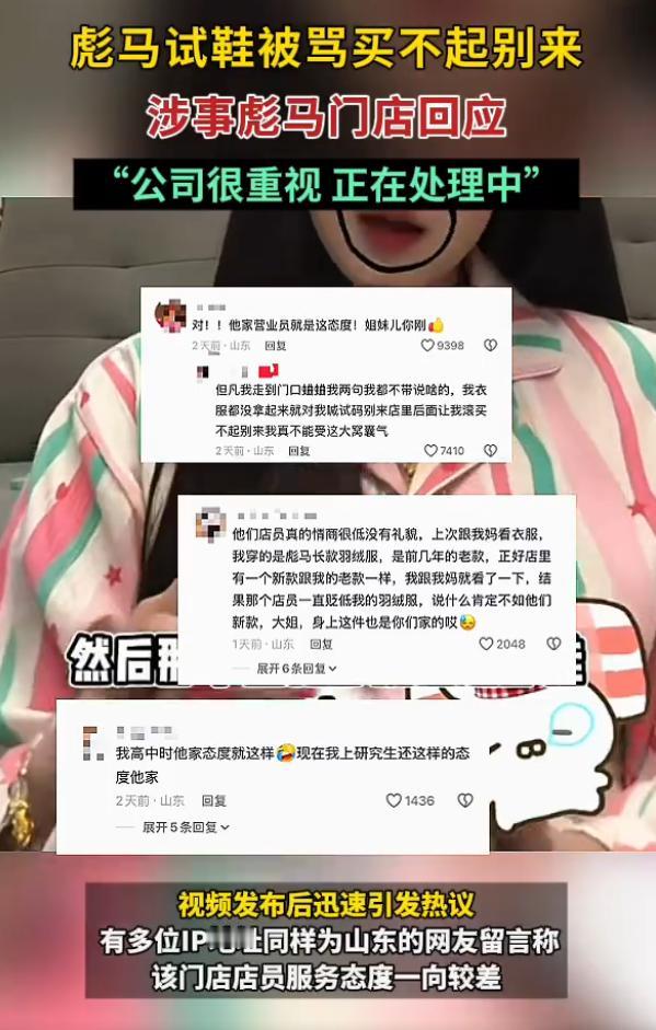 好傲慢!品牌店店员对着顾客说 “买不起别试” 山东滨州一彪马门店闹大了!顾客连续两天到店试鞋,只是想多对比再决定,竟被店员当众嘲讽 “买不起别试”“试码别来”,态度嚣张至极。 这要怎样的一种心态才能说出这种话?先不说这个彪马的品牌现在还有没有号召力,一个服务业的从业人员怎么就可以高高在上地这样指责顾客? 试穿比价本就是消费者的正常权利,线下店本来就包含体验成本,连试穿都不能接受,还开什么实体店?做服务行业,尊重顾客是基本,不是凭一件品牌店工服就高人一等。