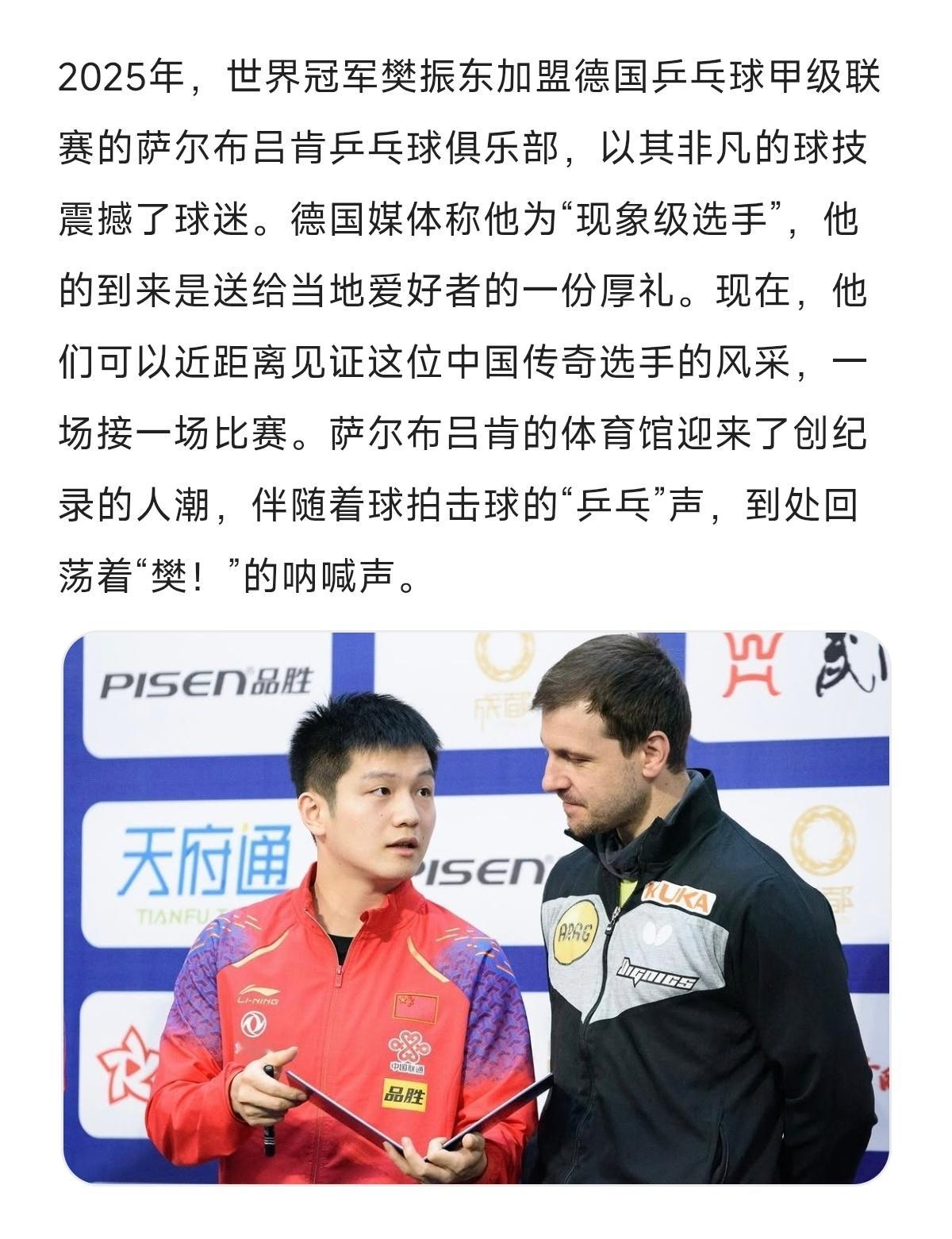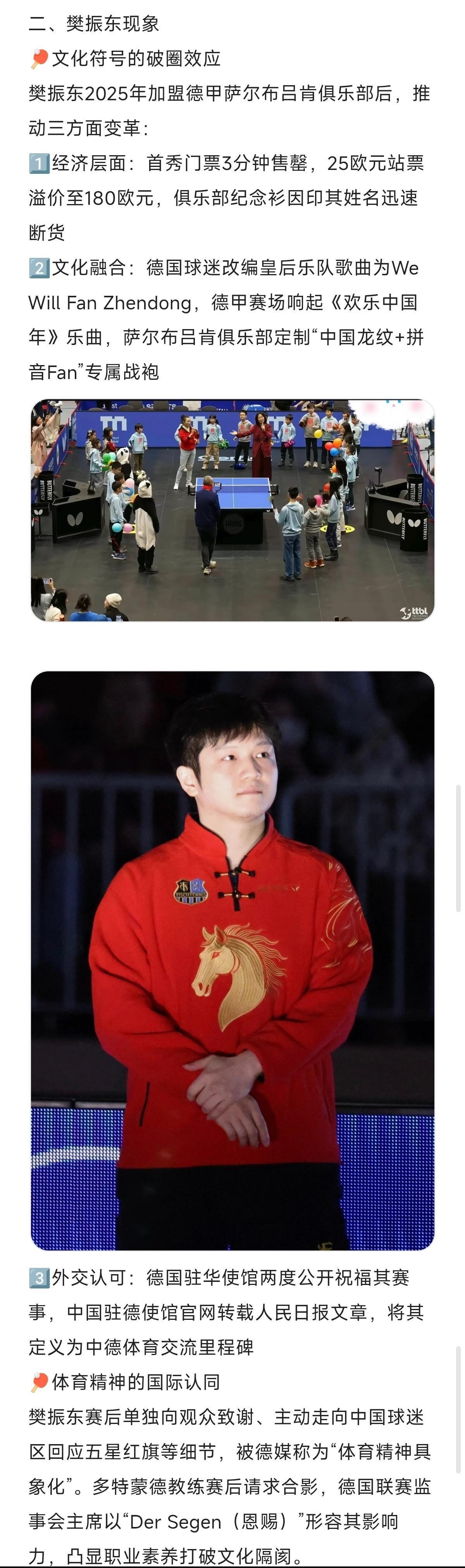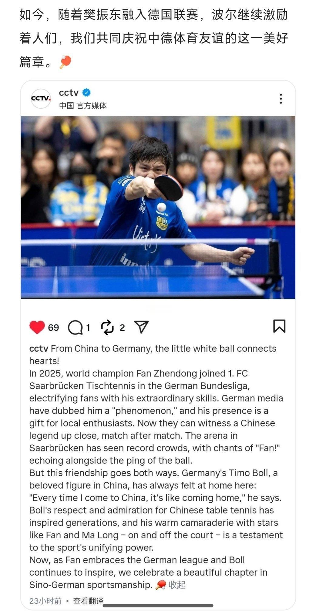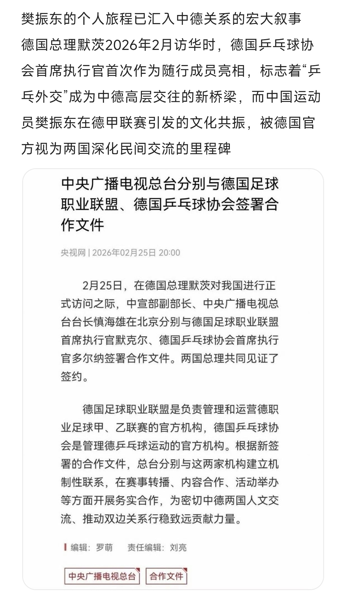 樊振东的个人旅程已汇入中德关系的宏大叙事,前期虽无名但人人都知道是因他而起,也恰是他低调沉稳的风格。但这今日总台一发入魂,如当时总台发文认证樊振东是乒坛首位超级金满贯一样。 不必喧哗,自有权威为他正名; 不必争抢,时光自会给他最踏实的答案。