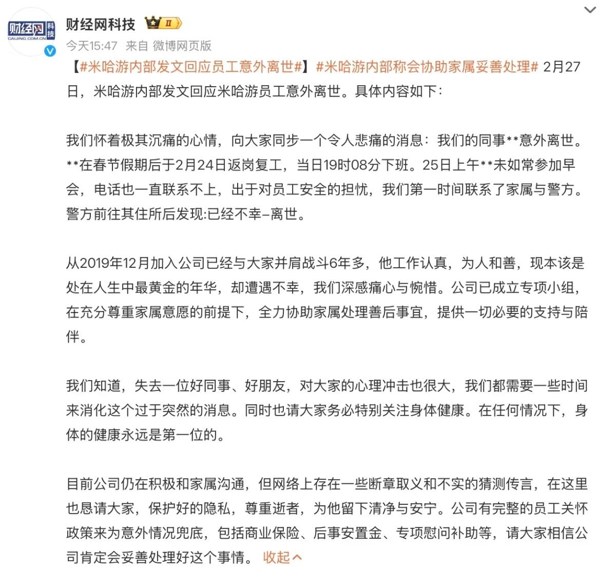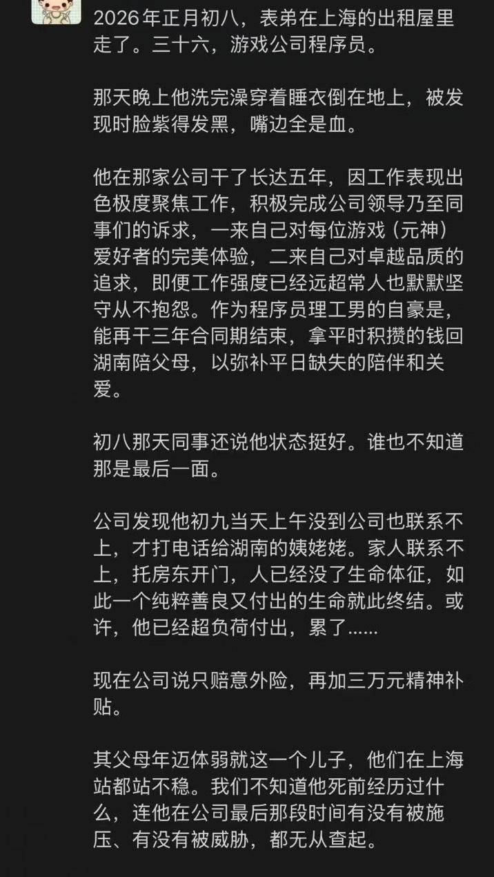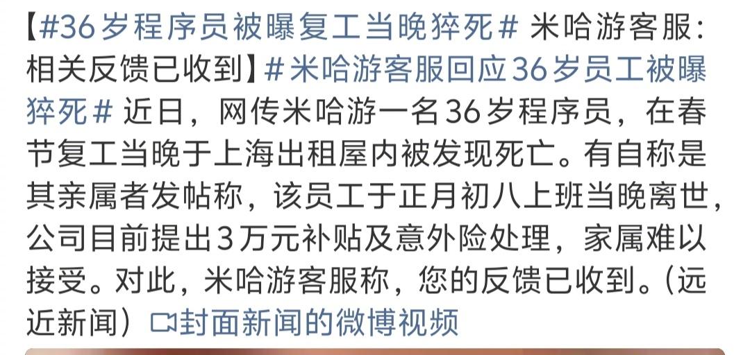 36岁米哈游程序员复工当晚猝死,家属只拿到3万补偿? 36岁,正是上有老下有小的年纪,却在复工当晚猝然离世,这事儿听着就让人揪心。 据家属爆料,这位在米哈游干了6年的程序员,正月初八复工当天晚上,在上海的出租屋里没了。家人说,他洗完澡穿着睡衣倒在地上,被发现时脸紫得发黑,嘴边全是血。 更让人心寒的是,家属称公司只愿意赔付意外险,再加3万元精神补贴。对于白发人送黑发人的父母来说,这3万块钱,连个念想都算不上。 米哈游随后在内部发文回应,确认了员工离世的消息,称其2月24日19:08下班,次日未参加早会,公司联系不上后才报警,最终发现其不幸离世。公司表示已成立专项小组,会协助家属处理后事,并称有商业保险、后事安置金等完整的员工关怀政策。 一边是家属的悲痛和不满,一边是公司的官方回应,真相究竟如何,我们不得而知。但这件事再次给所有打工人敲响了警钟:身体才是革命的本钱。 在这个快节奏的时代,我们总被“奋斗”“拼搏”裹挟着向前,却常常忽略了自己的身体。36岁,人生最黄金的年华,本应是为家庭遮风挡雨的顶梁柱,却突然倒下,留下无尽的遗憾。 希望公司能真正拿出诚意,妥善处理好这件事,给逝者和家属一个交代。也希望所有打工人都能警醒,再忙再累,也要记得好好吃饭,好好睡觉,别让“拼命”变成“没命”。中年猝死 工作 打工 程序员 中年猝死