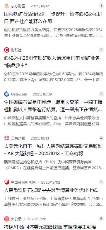 中国买矿石坚持用人民币,不玩美元那一套了。美国让澳大利亚必须用美元卖,结果自己又不用矿石,没法接盘。澳大利亚夹中间没办法,只能听中国的。现在越来越多国家愿意收人民币,毕竟被美元卡过脖子的都懂,手里有选择才踏实。 麻烦看官老爷们右上角点击一下“关注”,方便您进行讨论和分享,感谢您的支持! 2025年国庆节前夕,国际铁矿石市场爆出了一条大新闻。中国矿产资源集团给国内各大钢厂和贸易商下了死命令:立即暂停采购澳大利亚必和必拓公司所有以美元计价的铁矿石,连已经装船、正在海上漂着的12艘货轮也一并叫停。这可不是小打小闹的摩擦,消息一出,必和必拓在澳洲股市的股价当天就栽了跟头,市场一下子就炸了锅。 这事儿说白了,就是买卖双方在价钱和规矩上谈崩了。咱们这边觉得,现在钢材市场不好做,铁矿石现货价也就80美元出头,你卖矿的得按行情来。可必和必拓不干,仗着自己矿好,非得把2025年的长协价往上提15%,报到109.5美元一吨,还死活要用美元结账。这哪是做生意,这不明摆着趁火打劫吗? 中矿集团这次之所以敢掀桌子,底气足得很。这几年咱们国内的钢铁产能调整,对铁矿石的需求不像以前那么饥渴了,港口堆着的库存够钢厂用一个多月,根本不急着买。再说了,买矿的地方也多起来了,除了澳大利亚,还有巴西、南非,过两年几内亚的西芒杜大矿也要投产,澳大利亚的矿不再是独一份。 这一招釜底抽薪,直接把必和必拓逼到了墙角。他们本以为挺一挺,中国买家就得低头,毕竟这么多年都是这么过来的。可没想到这回咱们是真较真了,货船滞留在海上,一天就是天价的损失。更让他们慌的是,另外两家澳洲巨头力拓和FMG,还有巴西的淡水河谷,一看风向不对,麻溜地宣布可以用人民币结算,留下必和必拓一家在那傻眼。 这时候,最尴尬的其实是美国人。虽然他们嘴上喊着要盟友必须守住美元结算这条红线,给澳大利亚施压,可问题是,美国的钢铁厂早就不行了,自己根本不买几吨澳矿,光耍嘴皮子撑腰有个屁用。澳大利亚夹在中间才明白,远亲不如近邻,更不如一个实实在在的大客户,真金白银的交易比啥空洞的承诺都管用。 熬了不到十天,必和必拓彻底扛不住了。到了10月9日,路透社等媒体证实,他们不仅恢复了发货,还答应了咱们的核心条件:从第四季度开始,至少三成的现货交易改用人民币结算,并且同意把长协价跟现货市场挂钩。这一下,不仅价格打下来了,连交易货币也换了,全球矿业巨头第一次在正式协议里给人民币让出了位置。 对咱们国内的钢厂来说,用人民币买矿,好处是实实在在的。以前用美元,得看汇率脸色,万一美元一涨,成本就嗖嗖往上窜,纯属白干。现在直接用人民币,再也不用担心汇率过山车,财务成本降下来,利润也能算得更清楚。这等于给一直在微利中挣扎的中国钢铁业,卸下了一个大包袱。 必和必拓低头,其实也是没办法的办法。他们刚发布的2025财年年报,铁矿石这块的利润跌了快四分之一,要是再丢了中国市场这个饭碗,后面真没地方哭去。答应人民币结算,虽然面子上有点挂不住,但至少保住了每年几亿吨的出货量。而且收到人民币也不是废纸,可以投资中国股市,或者买中国的高端设备,路子宽着呢。 这次事件,表面上是一次商业谈判的胜利,实际上敲响了美元霸权在资源领域的丧钟。过去那些年被美元潮汐收割过、被华尔街金融大鳄用普氏指数割过韭菜的国家,眼睛都盯着呢。大家算是看明白了,把鸡蛋全放在美元一个篮子里,哪天美国自己出问题,你就得跟着倒霉。手里多一种选择,多一条路,心里才踏实。 除了货币结算的突破,咱们背后还有更深远的布局。几内亚的西芒杜铁矿项目进展神速,配套的铁路已经通车,预计2026年首船矿就能拉回国内。这个矿品质极高,年产目标1.2亿吨,一旦量产,咱们对澳大利亚和巴西的进口依赖度就能从八成降到六成五。手里有了稳定的海外权益矿,以后再谈判,腰杆子就更硬了。 为了配合人民币结算的大趋势,国内的金融基础设施也早就准备好了。上海清算所在12月初升级了人民币铁矿石掉期业务,交易很活跃。这意味着,以后不仅买矿可以用人民币,还可以用人民币金融工具来对冲价格波动的风险,形成一个完整的闭环。买卖双方都能找到适合自己的避险工具,这个人民币结算的生态才算真正立住了。 回过头来看,这场发生在2025年秋天的博弈,虽然前后不过十来天,但它撬动的是全球大宗商品贸易几十年的老规矩。它告诉世界:当最大的买家开始用自己的货币买东西,并且有足够的实力和耐心去推动这件事的时候,美元那座看起来坚固无比的堡垒,也并不是坚不可摧的。
