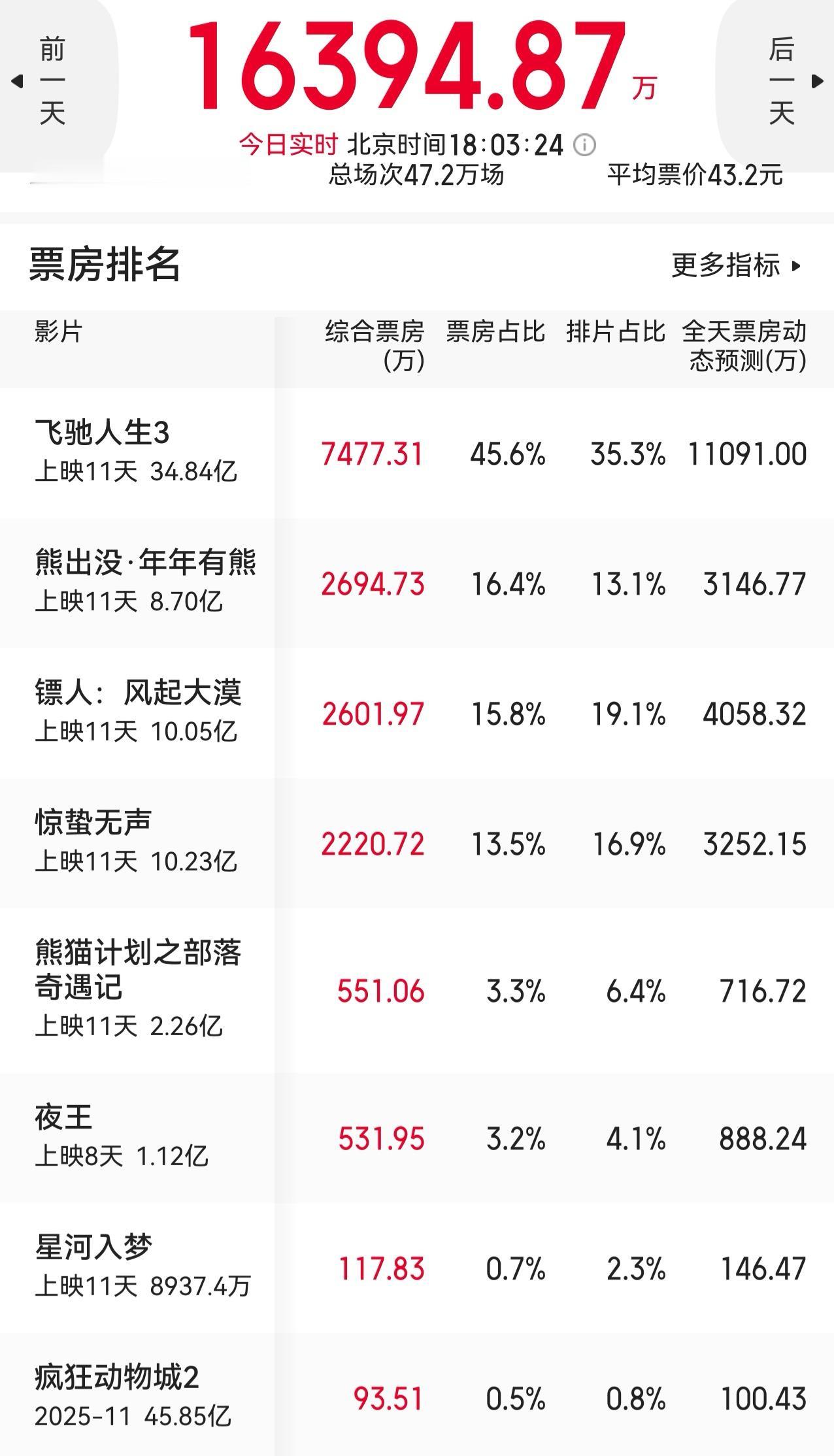 《镖人》票房终于过10亿,但是票房还是没有超过《惊蛰无声》! 这几天春节档电影院数据没太大变化,《镖人》票房在三天前就接近10亿,我以为昨天能够破10亿,但是直到今天,才真正破10亿,达到10.06亿。这么缓慢地突破10亿也说明,《镖人》观影刚需群体基本上已经都看过这部片子了,后面提升难度越来越大! 尽管过了10亿,但是到今天,春节档总票房数据还是没有超过《惊蛰无声》的总票房是10.24亿,依然排在第三位!要想超过《惊蛰无声》占据榜眼位置,估计还要等一两天! 不过现在有一个新的变化,就是《熊出没》的单日票房数据,也已经连续两天超过《镖人》,排在第二,而且它的排片比只有13.1%,远低于《镖人》的19.1%。这说明,看《熊出没》的人数要远多于《镖人》! 前有堵截,后来围追,《镖人》最终票房过15亿已经完全不可能了!这是吴京付出精力最多的一部电影,也很有可能是让他最郁闷的一部电影!