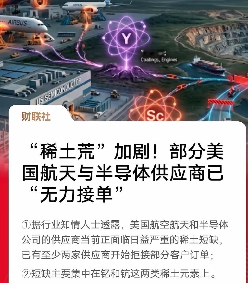 稀土荒直击美国高端制造!全球高端制造迎来关键考验,美国航天与半导体领域稀土短缺持续加剧,已有供应商因原料告急,直接暂停部分订单,产业链紧绷信号明显。本轮紧缺集中在钇、钪两种关键稀土,是航空发动机涂层、先进芯片制程的必需材料,几乎不可替代。受供给收紧影响,钇价同比暴涨数十倍,行业进入严格配给模式,优先保障头部企业,中小客户订单被直接砍掉。面对危机,美国密集出招:加大本土产能投入、联合盟友构建供应链、动用战略储备、加速替代技术研发。但现实很清晰,美国本土缺少成熟的稀土分离与深加工体系,成本高、周期长,即便全力追赶,完整产业链也需多年才能成型。中国稀土管控并非限制贸易,而是依法依规、有序供给,守护资源与产业安全。这场风波也点明一个道理:科技竞争的底气,来自全产业链自主可控,不是短期补贴与联盟就能弥补的短板。稀土早已不是普通资源,而是大国高端制造的战略支点。谁掌握核心材料与加工技术,谁就在全球产业竞争中占据主动。