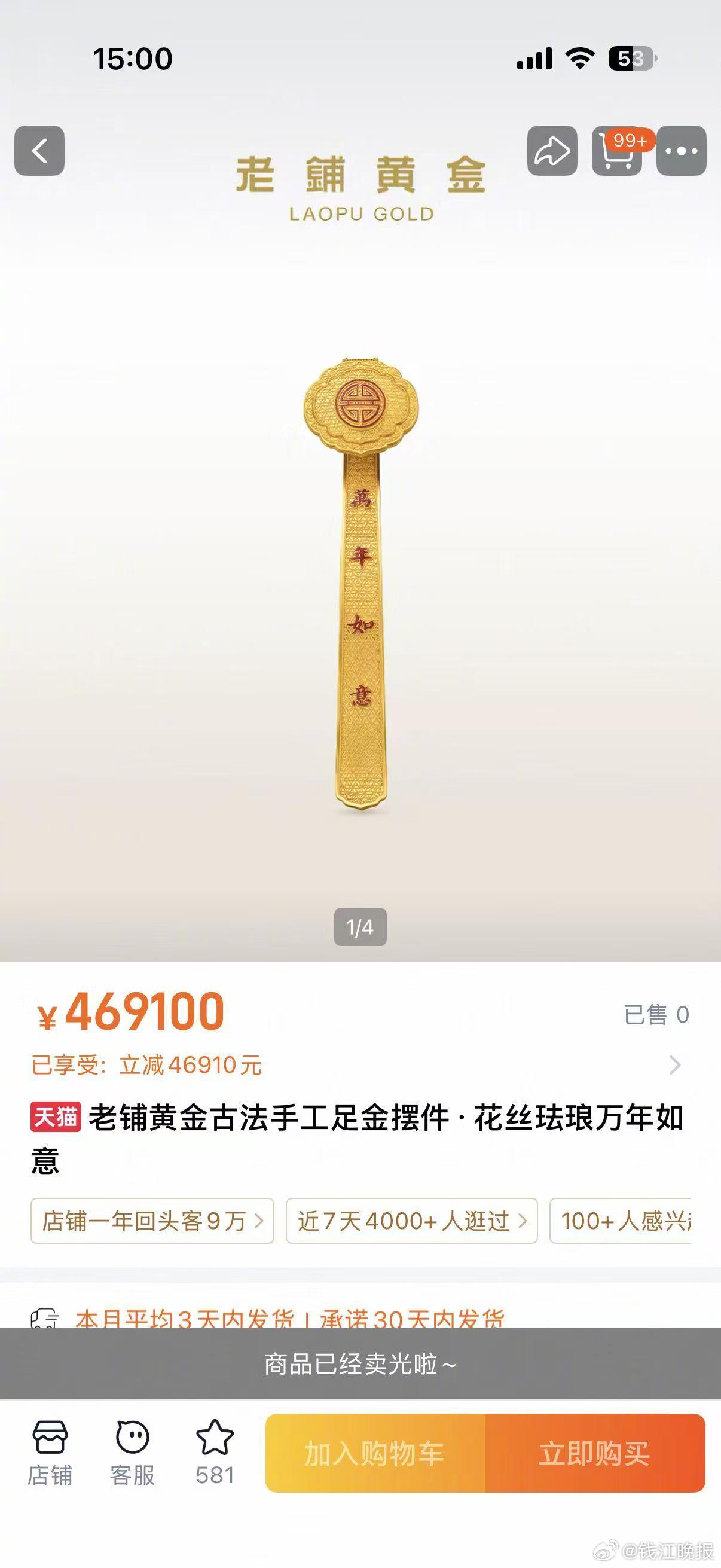 值得一提的是,当天14点开卖后,不足10分钟,售价62.75万元的花丝真言金碗、50万元的鸳鸯和合摆件、30万元的金蟾等足金摆件商品即显示售罄,同时有超30款单品上架即被秒空。热门单品供不应求,其中,古法手工足金项链十字金刚杵钻饰吊坠两款货品单日成交均近亿;八宝随身金佛、葫芦钻饰及七子葫芦吊坠等5款单品单日成交破5000万;另有近30款单品单日成交破1000万。