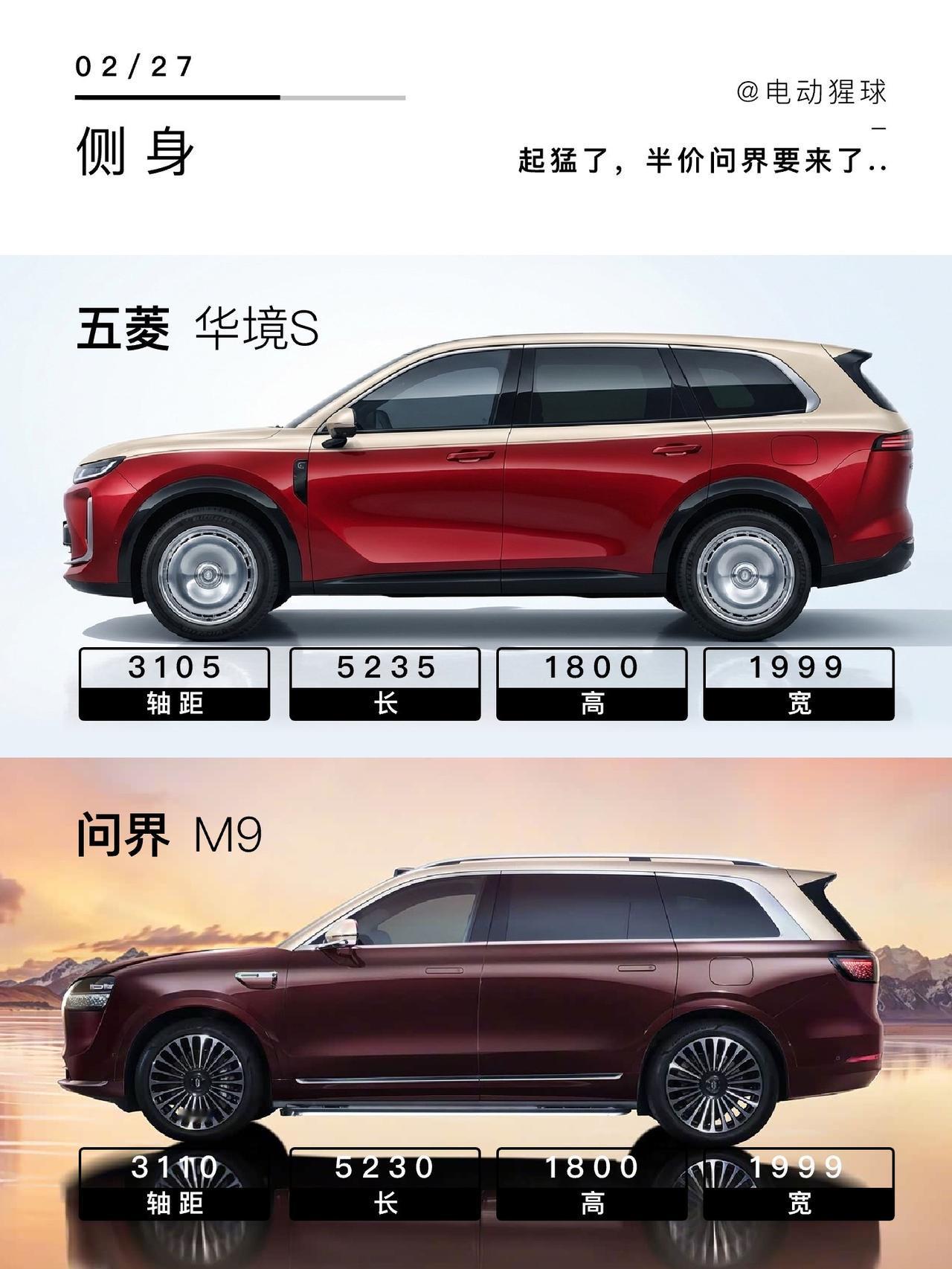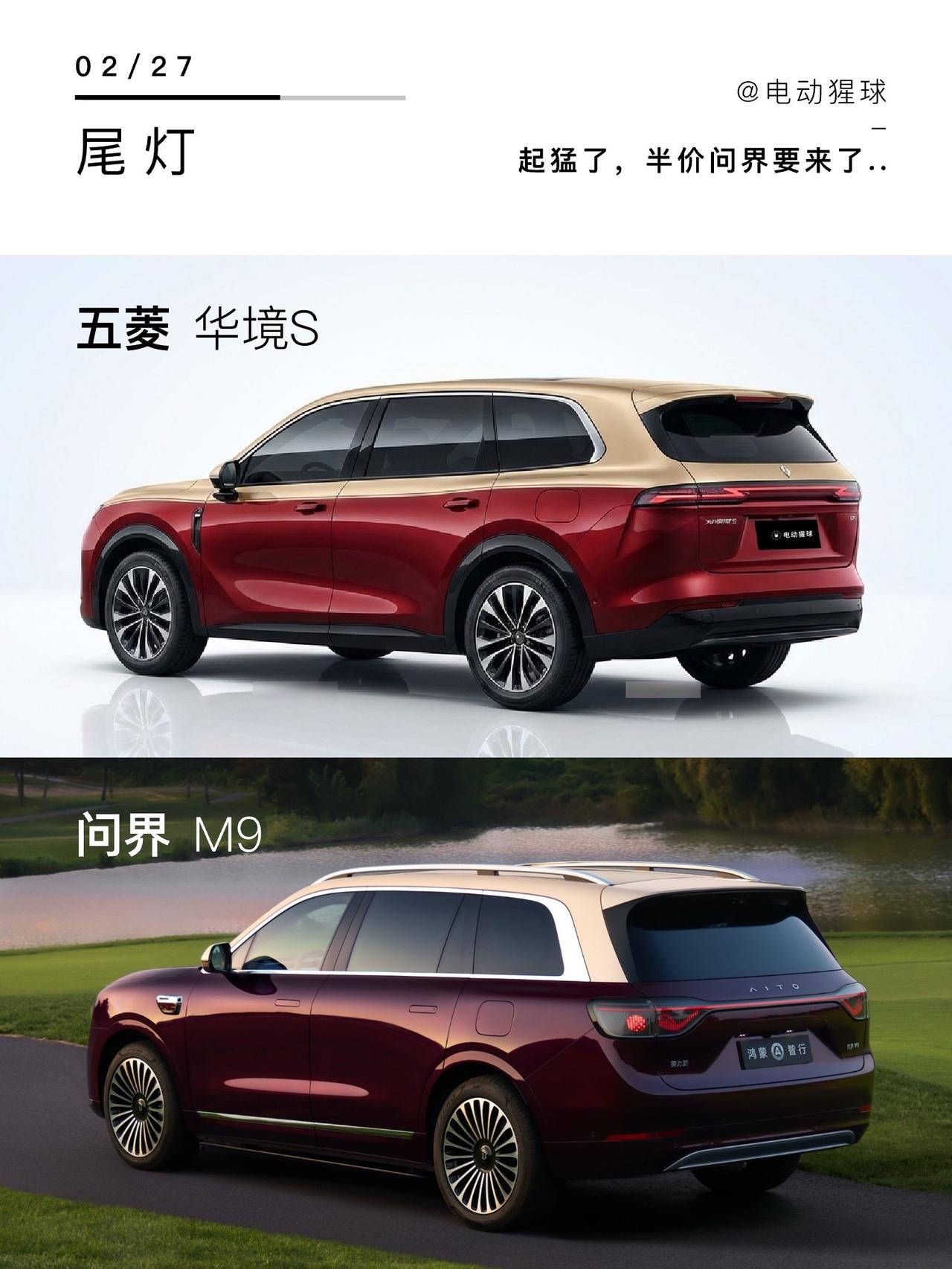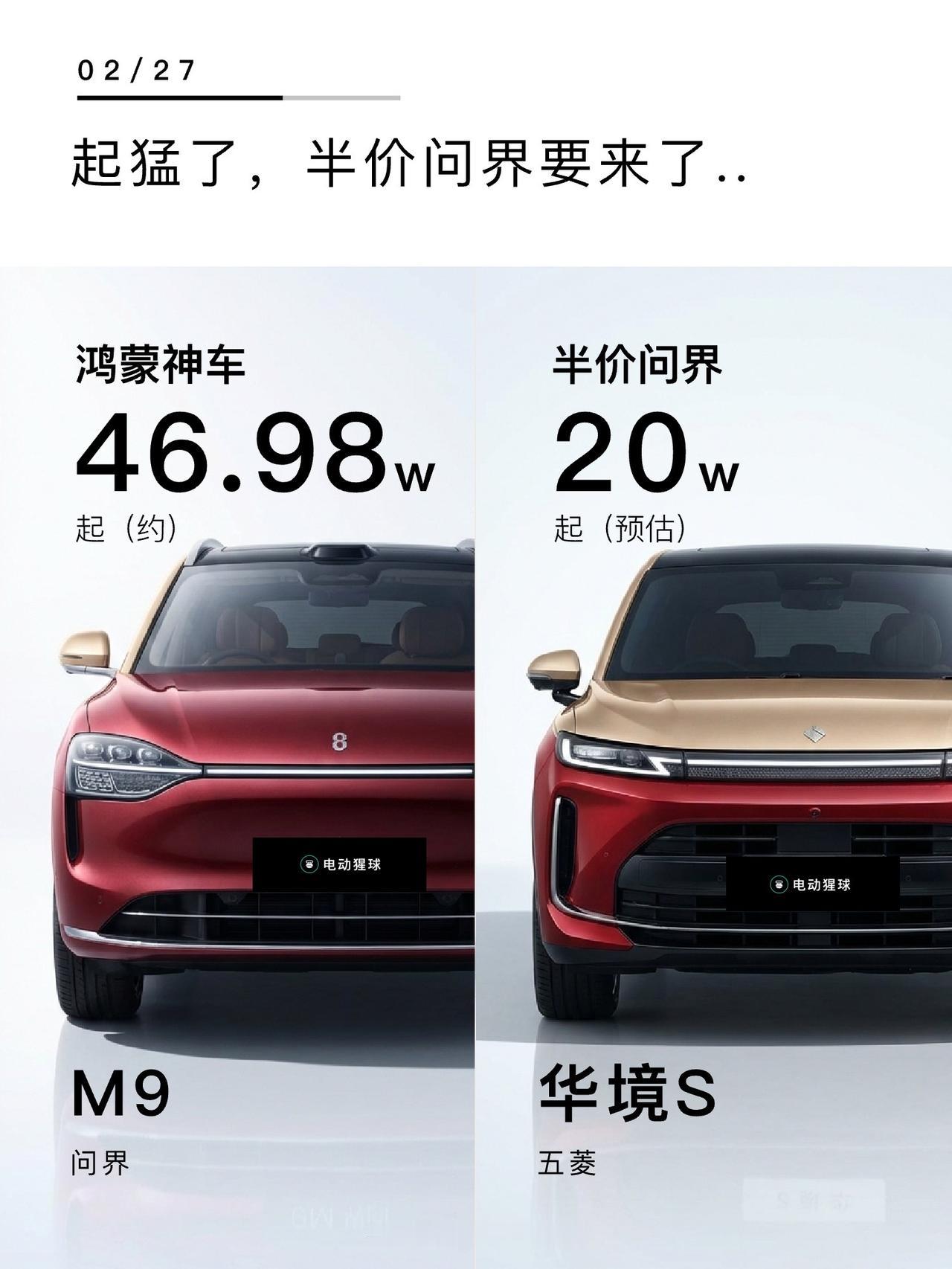 起猛了,半价问界要来了..五菱和华为合作的华境S要来了,熟悉的红金双拼色,连尺寸都和大哥M9基本一样,半价问界会迟到,但不会缺席,手握60个W,你会怎么选?华境S 问界M9