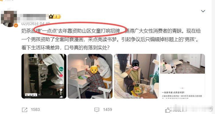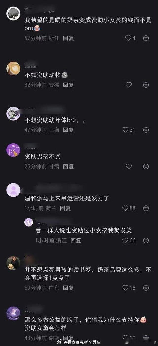 一点点 资助这些人冲一点点,其实就是用“舆论”胁迫社会资源去无条件倾斜她们的共同体,甚至于说,哪怕在助学资源已经极端倾斜女童的情况下,稍稍资助下男童都成了不可饶恕的。一点点是企业,不是慈善机构,它进入大陆这么多年,品牌也不需要靠“资助山区女童”这个噱头来打响。捐赠是回馈社会,根本轮不到这些精神股东说三道四。以前网友骂慈善组织把资助女童的钱给男童,而现在她们甚至要对企业的自主行为进行指手画脚。贫困是不分性别的,但你在这些人身上可以看到什么?对贫困男童冠以她们一贯的侮辱性称呼“br0”,并且扬言捐给小动物也不捐给男童。这是相当一部分“人”的真实想法,并且还有更多人是没说出来的,是打着冠冕堂皇的旗号“资助山区女童”“做慈善”来把资源无限向她们的赛博共同体倾斜。这个男童是不是贫困户,重要吗,也不重要。用“两千元电话手表”“漫画书”“明亮的房间”这些因素来混淆视听无非是给她们攻击男童增添一丝合理性罢了。