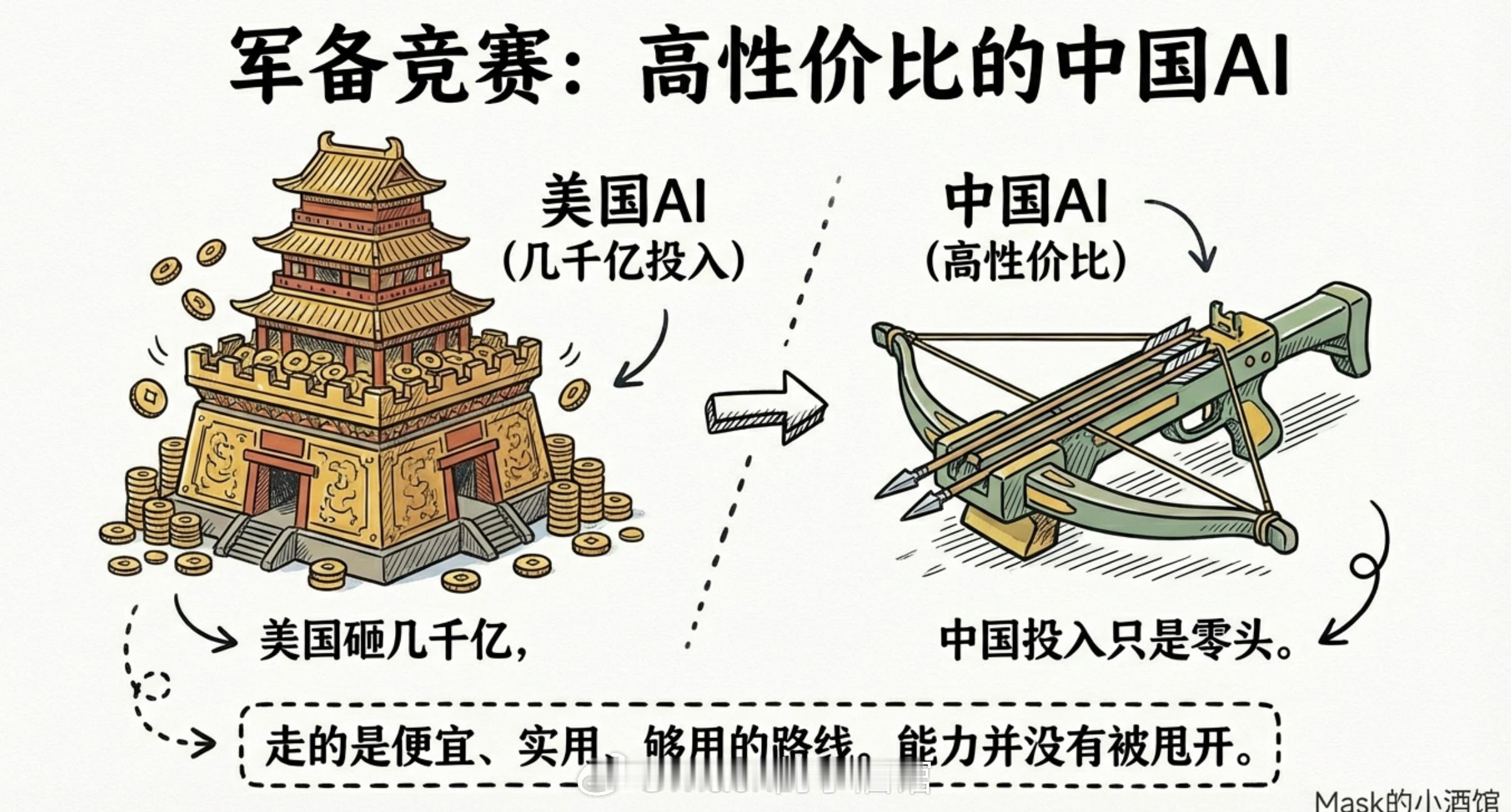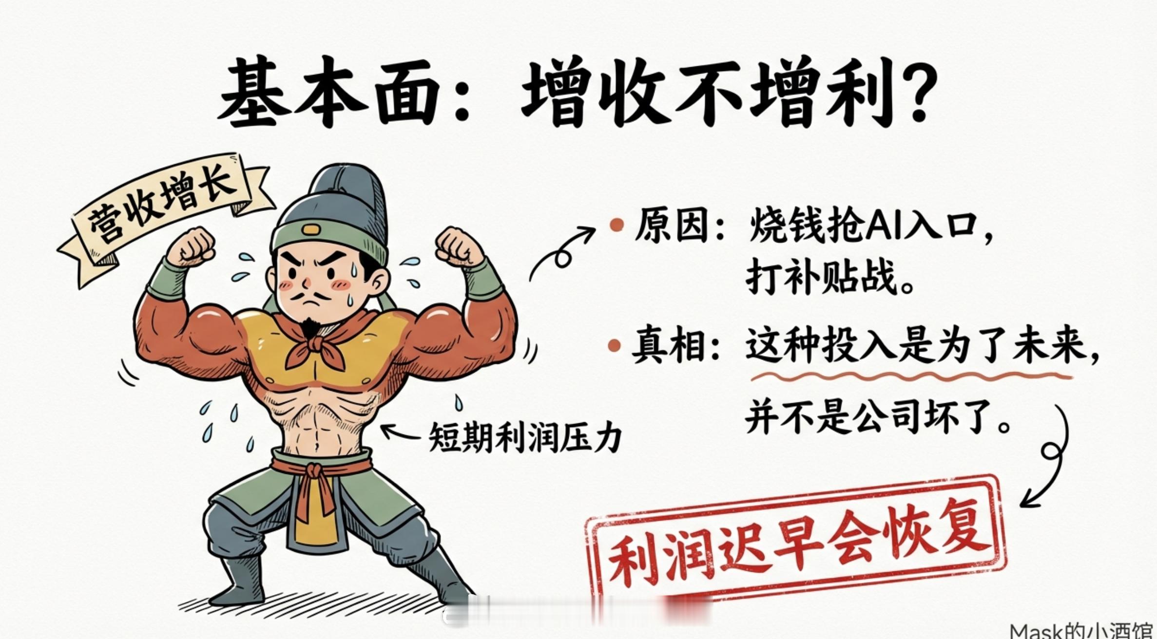 这些互联网巨头的营收,还在增长。利润这块确实受到了一些影响,原因是各家都在烧钱抢AI入口,打补贴大战,短期把利润给压下来了。但这种烧钱战不会永远持续,等这场仗打完,该赚的利润迟早会恢复。有一个数据很能说明问题:美国2026年准备砸几千亿搞AI,中国的投入只是美国的零头。但就算这样,中国AI的创新依然能追得上,走的是便宜、实用、够用的路线。