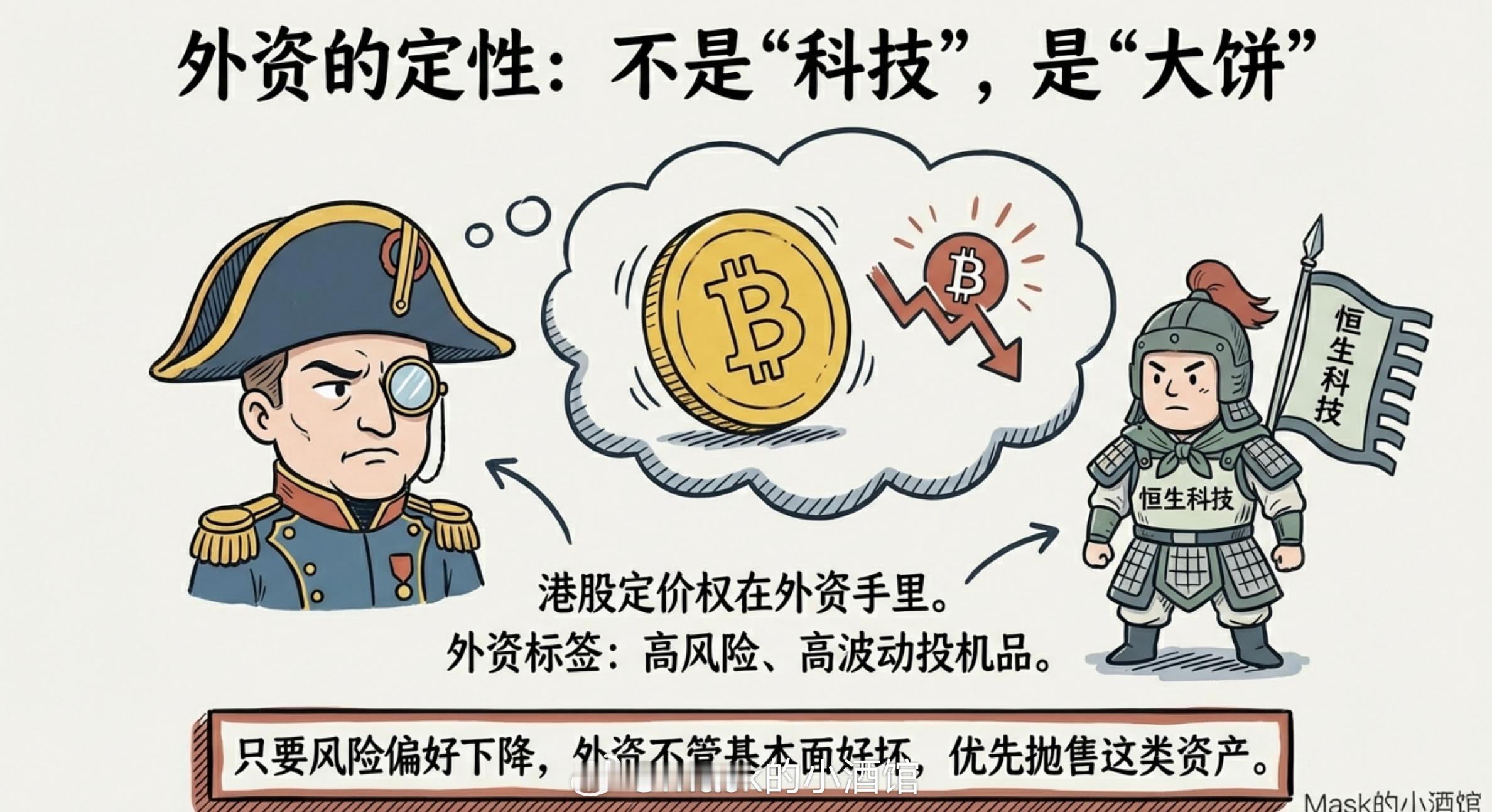 这两件事加在一起,直接导致全球投资者的风险偏好急速降温——简单说,就是全球资金突然变得很胆小,开始集体往安全的方向跑。但你可能会问:美股软件跌,跟港股互联网有什么直接关系?业务上好像搭不上边。这就涉及到一个很关键的问题——外资是怎么给恒生科技定性的。外资眼里,恒生科技不是"科技股",更像"大饼"港股这个市场,长期以来定价权在外资手里。在外资的认知框架里,恒生科技从来不被当成稳健的科技股来对待。他们给这类资产贴的标签,更接近高风险、高波动的投机品——就像大饼一样。