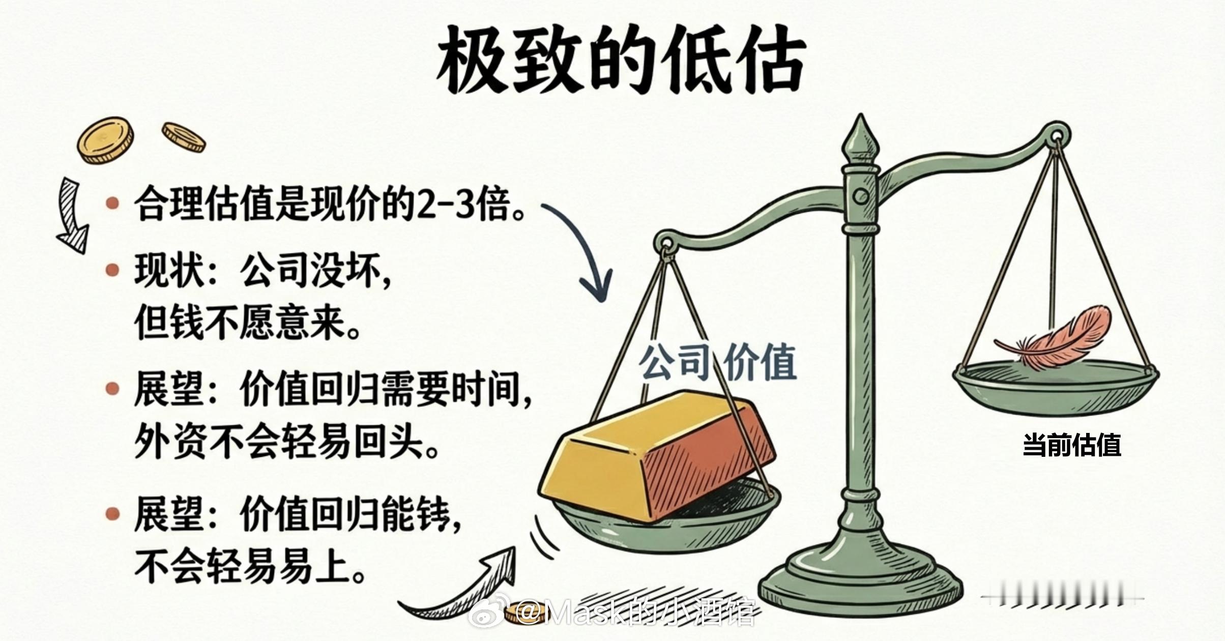 这说明这些互联网公司的AI能力,并没有被甩开,底子还在。所以现在的处境,是:公司没坏,但钱不愿意来。估值已经压到了极低的位置,合理估值大概是现价的两到三倍。但那些被吓跑的外资,不会轻易回头,价值回归需要时间。
