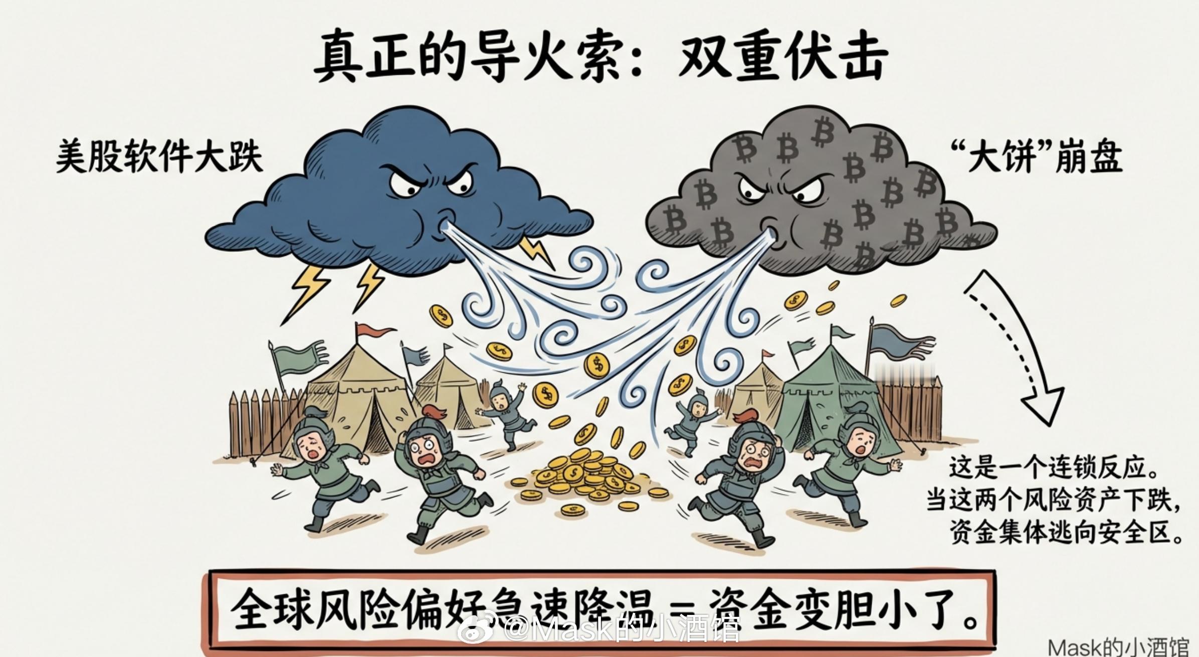 我只能说,这个逻辑根本站不住脚。你回想一下,之前恒生科技大涨那段时间,字节在AI这块同样把一众老牌互联网公司打得找不到北。但那会儿恒生科技是跌还是涨?是涨的。而现在,那些和字节深度绑定、基本面扎实的公司,照样跌得稀里哗啦。字节概念这么猛,为什么概念相关股还跌成这样?字节就是这轮下跌的背锅侠,真正的原因,得往更深处找。那真正的导火索是什么?先说最表层的触发原因。这一轮恒生科技暴跌,导火索是两件事同时发生:美股软件股大跌,加上大饼崩盘。