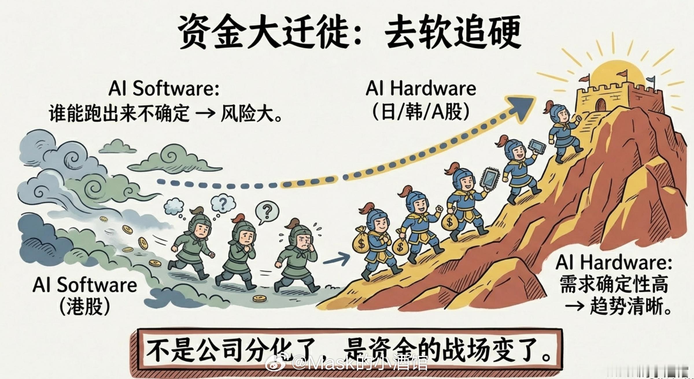 这意味着什么?意味着每次全球风险偏好下降,外资优先砸的就是这类资产。不管公司基本面怎么样,先跑再说。这是外资的系统性反应,跟公司好不好没太大关系。而这种偏见,从2021年就开始了。那之后,哪怕这些互联网巨头的业绩还在增长,成长性还在,外资就是不愿意给高估值。价格被压着,不是因为公司不行,是因为外资集体不愿意给这个溢价。所以这轮跌,导火索是大饼和美股软件,放大器是外资的风险情绪,恒生科技只是第一个被殃及的池鱼。那些出走的资金,去哪了?外资在卖恒生科技,但钱不会凭空消失,它去了别的地方。你去看这段时间日本、韩国的股市,走势明显强于港股。这背后有一个很清晰的资金逻辑:全球资金正在从AI软件方向,悄悄迁移到AI硬件方向。