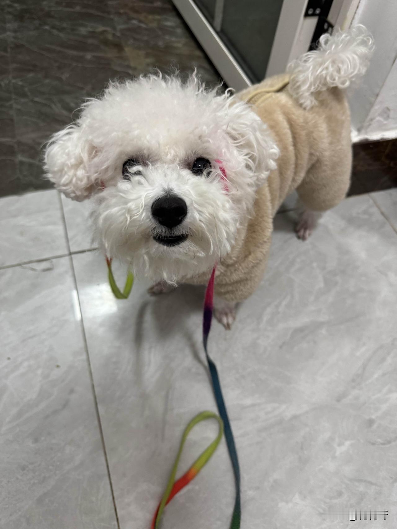 我家小比熊超级可爱,这不我带它遛弯儿回来,让它等着擦脚擦嘴,它就在那乖乖的等着,一不小心把绳子还甩它头上了,它也不生气还乐呵呵的,看来带它走一圈高兴了看它那憨态可掬的模样,湿漉漉的小爪子在地上轻轻动了动,眼睛还时不时地瞅瞅我,好像在催促我动作快些,好让它赶紧去撒欢儿。擦完脚后,我又拿起毛巾给它擦嘴,它乖乖地仰着头,温热的小舌头偶尔调皮地舔一下毛巾。 擦完后,我刚把牵引绳解开,它就像脱缰的小野马,在客厅里欢快地跑起来,一会儿钻到沙发底下,一会儿又蹦到沙发上,把它的小玩具叼在嘴里,甩来甩去。玩累了,它就跑到我身边,趴在我的脚边,吐着小舌头,呼哧呼哧地喘着气,那模样别提多招人喜欢了。 晚上睡觉的时候,它还会乖乖地跳到我的床上,找个舒服的位置,蜷缩成一团,像个毛茸茸的圆球,不一会儿就发出了轻轻的呼噜声。有这么可爱又乖巧的小比熊陪伴,生活真是充满了欢乐呢。