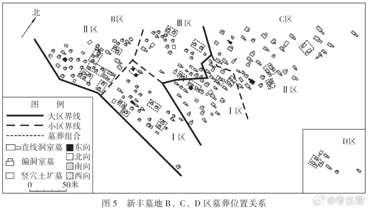 考古发现陕西新丰秦汉墓地的结构研究 陕西新丰秦汉墓地挖了近六百座墓,时间跨度从战国到秦汉。令人惊讶的是:墓地明显分成好几个区,每个区葬俗高度一致,但区跟区之间差别挺大。有的区清一色屈肢葬,有的区就是直肢葬;有的区出三晋风格的陶器,有的区就是纯纯的秦式茧形壶。说明这片墓地不是随便乱埋的,每个区很可能代表一个不同的群体——可能是不同的家族,甚至可能是来自不同地方的人。这是考古最迷人的地方——一铲子下去,挖出来的是活生生的社会图景。