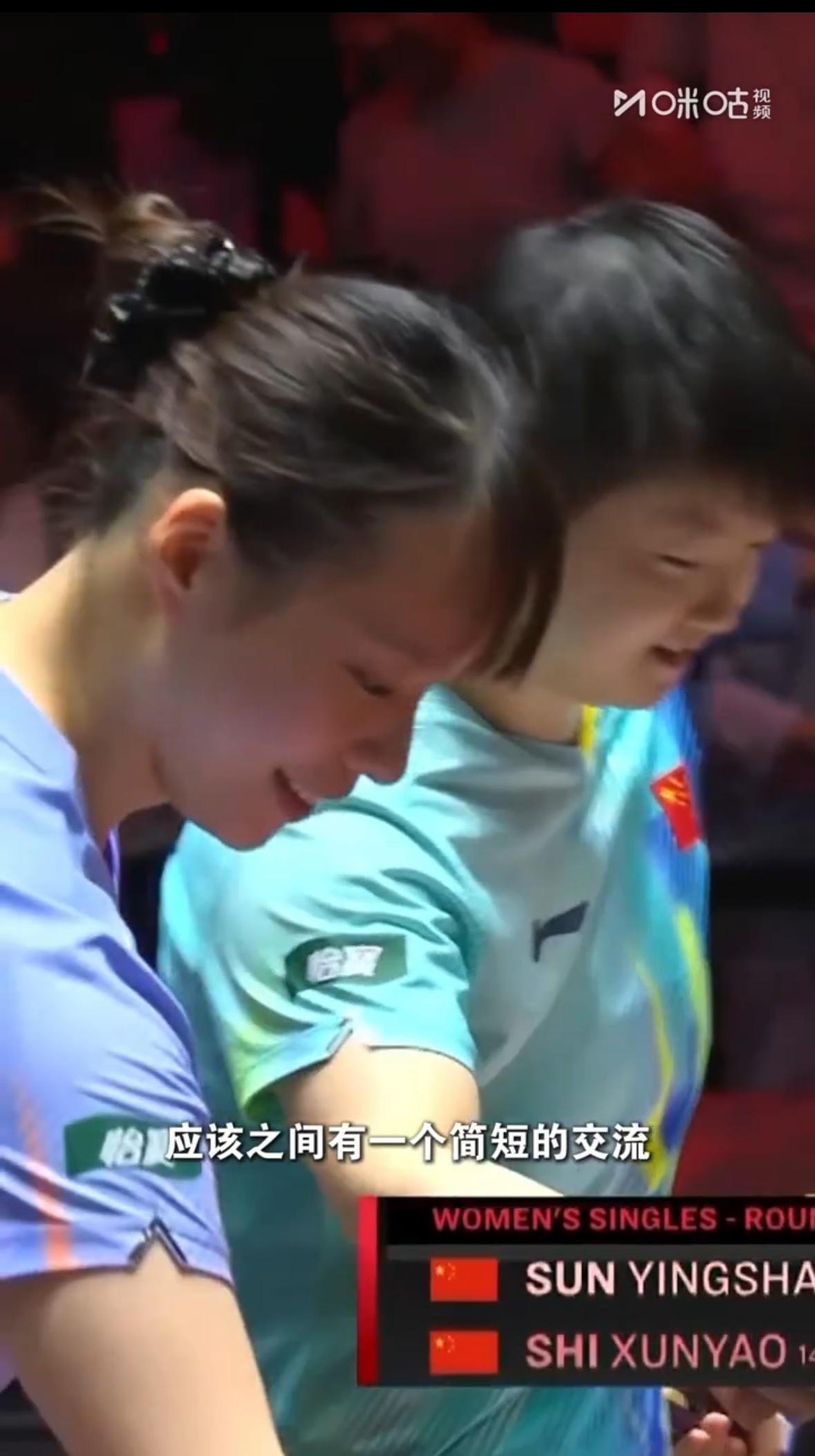 莎莎力赞瑶瑶,两个人还说悄悄话沟通,真的很棒,让人很喜欢两位小姑娘! 一笑小酒窝就出来了,自然发自内心得笑,这才是赛场遇见里相互尊重和鼓励的对手,英雄之间的惺惺相惜,见识到了,真的让人觉得小女孩如此强大并且美好!