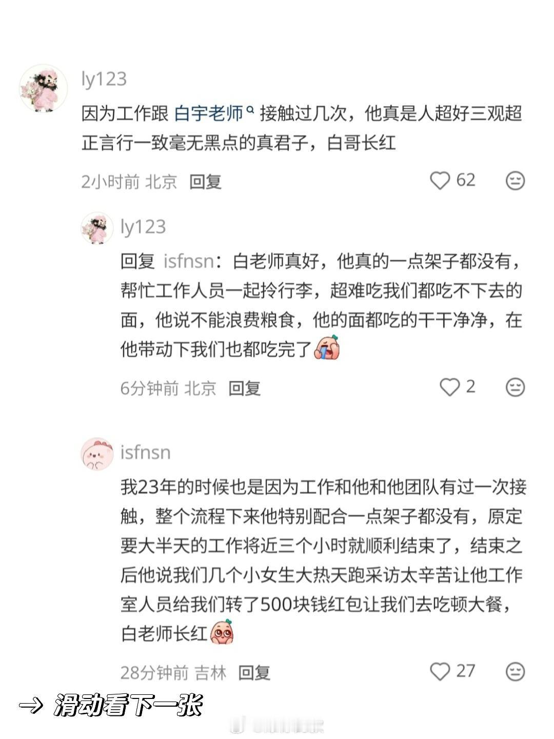 白宇人真挺好,以前就有送工作人员去公司以前就有一次工作人员迷路迟到了,白宇得知后直接开车接他们到工作的目的地。
