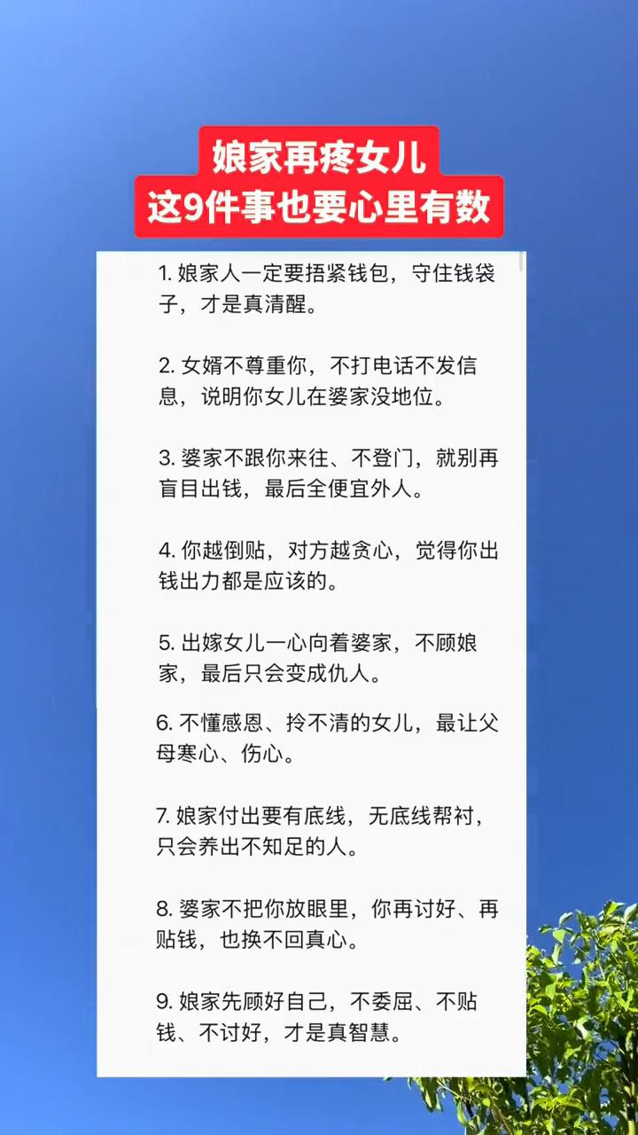 娘家再疼女儿,这9件事也要心里有数。 ·1.娘家人一定要捂紧钱包,守住钱袋子,才是真清醒。 ·2.女婿不尊重你,不打电话不发信息,说明你女儿在婆家没地位。 ·3.婆家不跟你来往、不登门,就别再盲目出钱,最后全便宜外人。 ·4.你越倒贴,对方越贪心,觉得你出钱出力都是应该的。 ·5.出嫁女儿一心向着婆家,不顾娘家,最后只会变成仇人。 ·6.不懂感恩、拎不清的女儿,最让父母寒心、伤心。 ·7.娘家付出要有底线,无底线帮衬,只会养出不知足的人。 ·8.婆家不把你放眼里,你再讨好、再贴钱,也换不回真心。 ·9.娘家先顾好自己,不委屈、不贴钱、不讨好,才是真智慧。