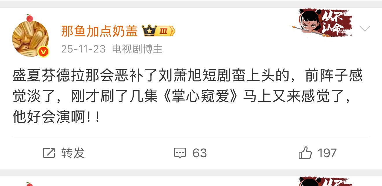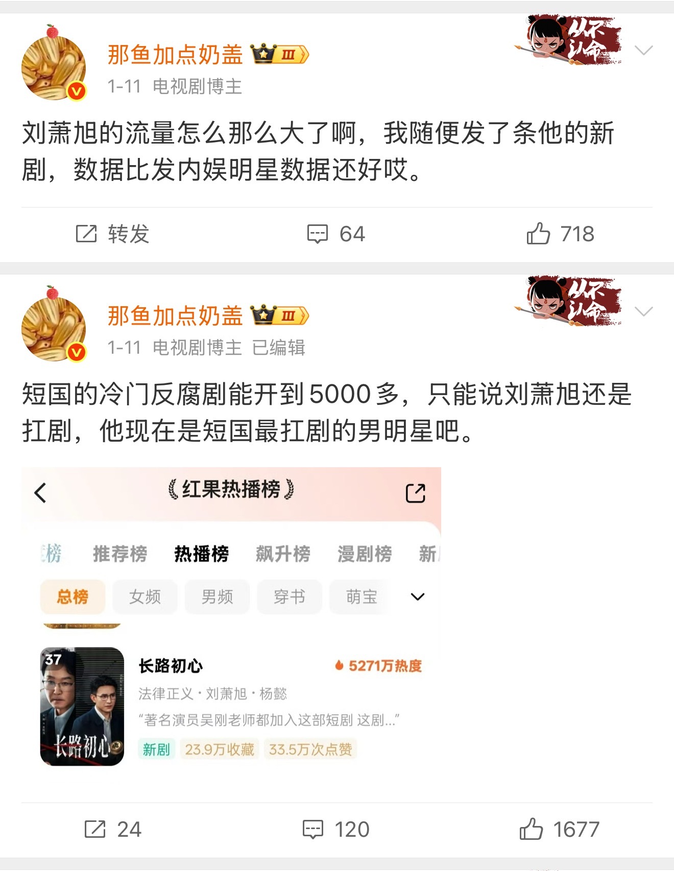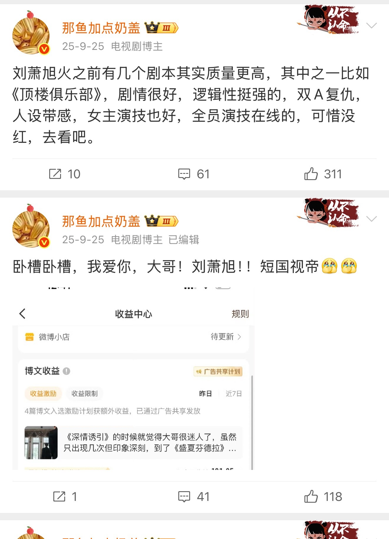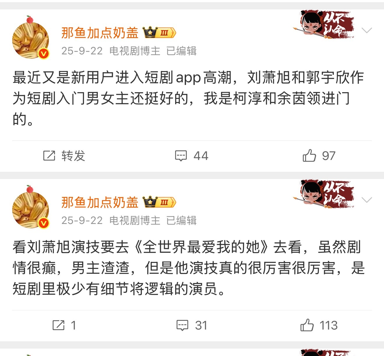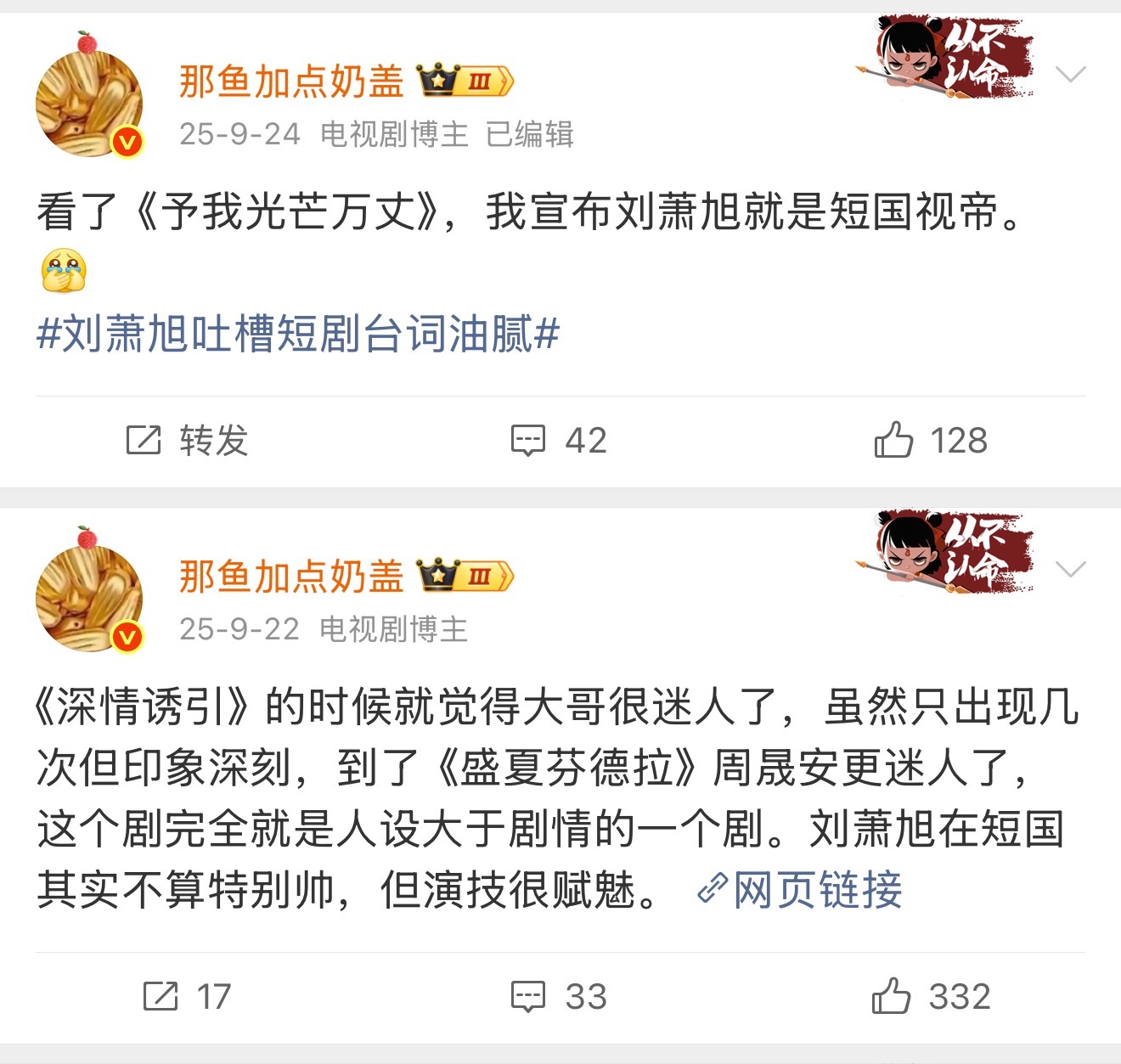 我夸刘萧旭好多次,我眼光真好,话放这儿,98会是最有前途的短剧男演员,因为能明显感受到即便演短剧,他也是带脑子的,选剧本,演戏都有脑子。