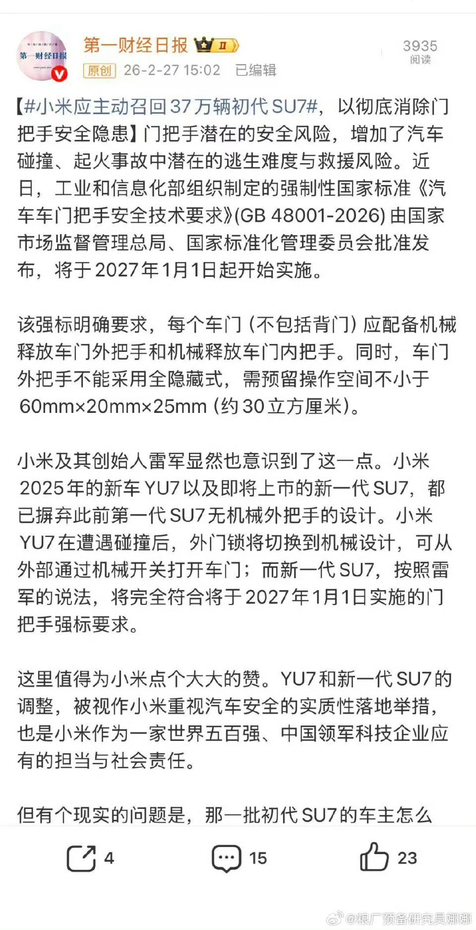 同样一个媒体,面对车门打不开的事故,写小米就写“应召回”,写友商就知道援引某车企人士的说法“但那是有车速要求的,目前实验速度是50km/h,115km/h已经超出国标的碰撞测试车速了。”