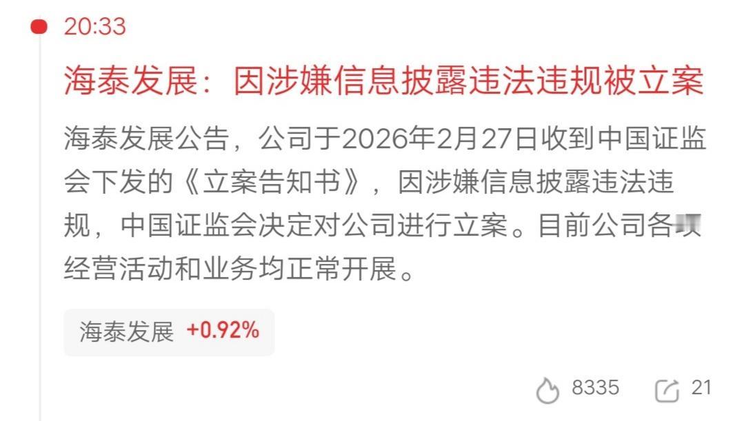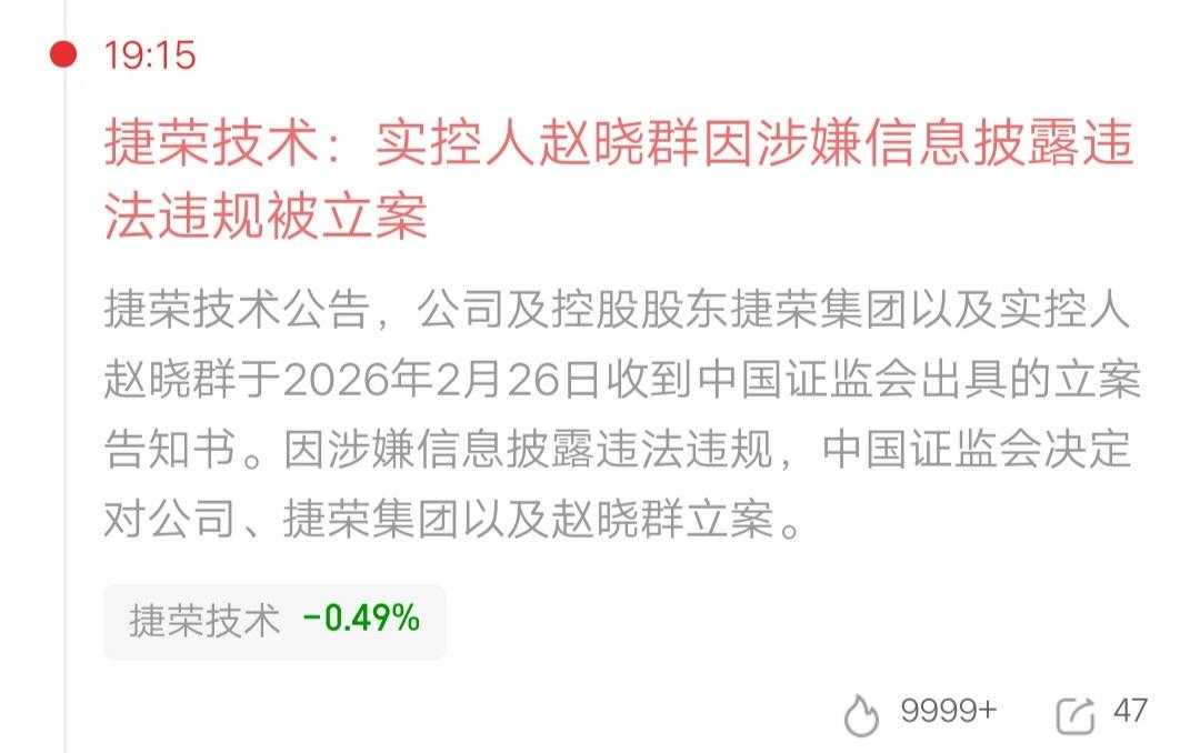 17万股民的天塌了,公司被证监会立案调查,这可是核弹级利空呀,周一要吃大面了。双良节能:因涉嫌信息披露误导性陈述等违法违规行为,公司收到中国证监会立案告知书。本月12号,公司公众号发《再获海外订单,助力商业航天太空探索》,称获3单12台换热器用于SpaceX星舰基地,引发股价涨停。 两个关键事实没有说明,一是订单金额,二是非独家间接供应商。 今天股票开盘后,快速拉升封板,后面炸板了。全天成交了30.59亿,周五进的资金太倒霉了,周一全部闷杀。 捷荣技术:实控人赵晓群因涉嫌信息披露违法违规被立案。 海泰发展:因涉嫌信息披露违法违规被立案。 人倒霉起来喝凉水都塞牙,这话一点没错呀。咱们小散户最怕黑天鹅了。持股很长时间,没等来主升浪,却等来了利空,别提多糟心了。事已至此,保持乐观心态吧。