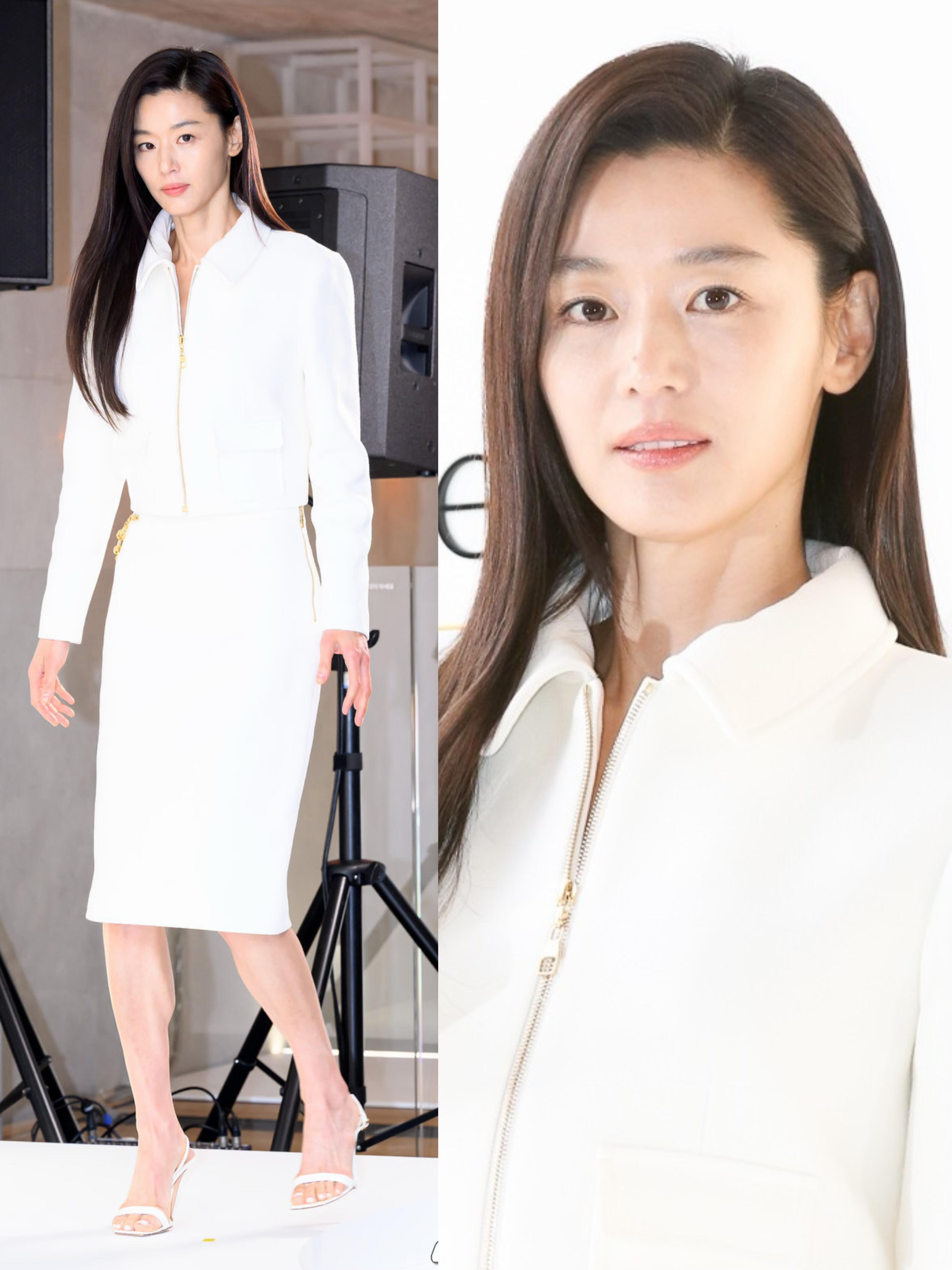全智贤今日活动造型!一身白色套装,状态还不错!