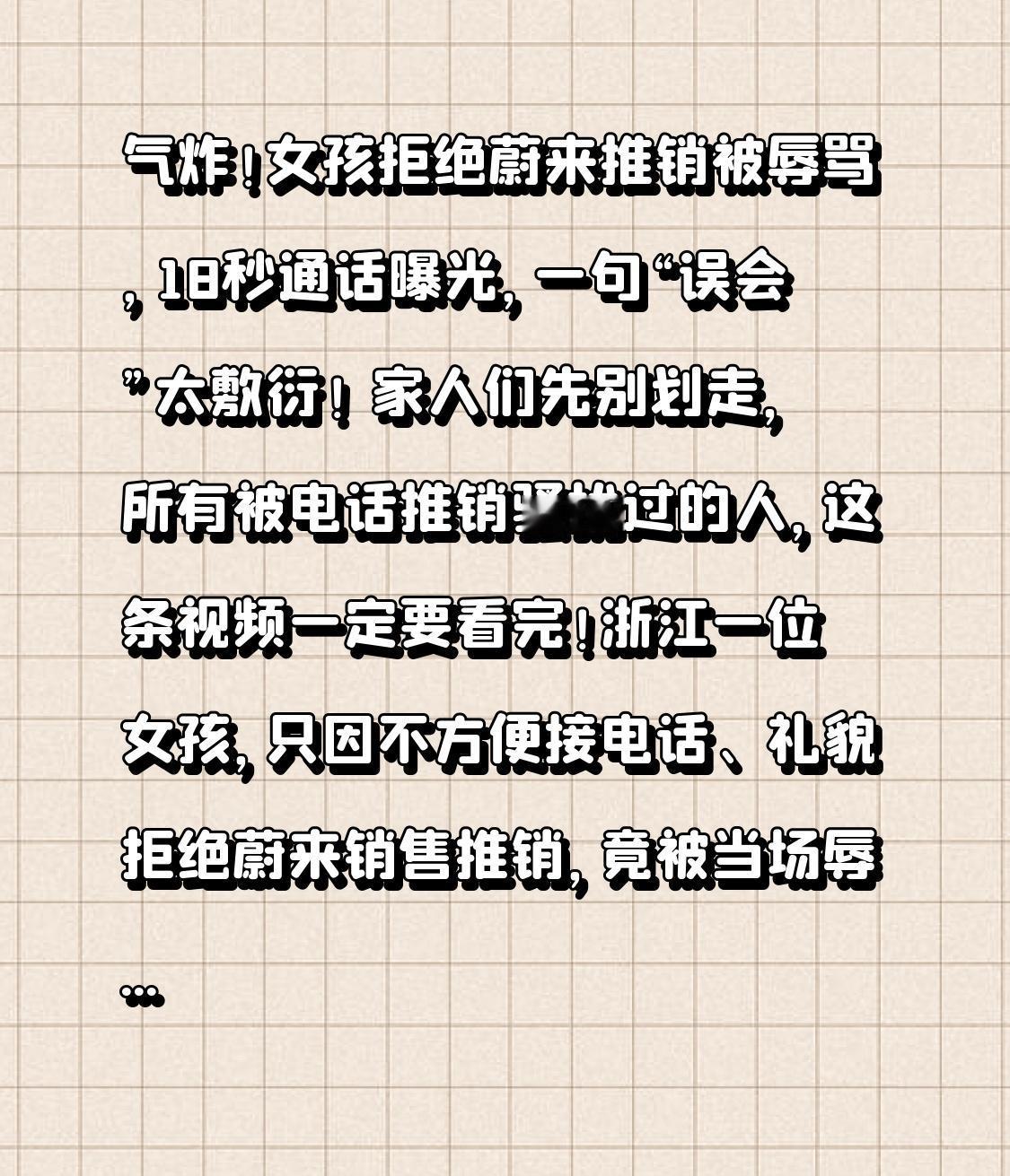 气炸!女孩拒绝蔚来推销被辱骂,18秒通话曝光,一句“误会”太敷衍! 家人们先别划走,所有被电话推销骚扰过的人,这条视频一定要看完!浙江一位女孩,只因不方便接电话、礼貌拒绝蔚来销售推销,竟被当场辱骂,后续处理更是让全网愤怒,彻底戳中打工人的委屈! 事发当天,女孩拖着两个行李箱、背着十斤重的背包,忙得腾不开手。接到蔚来销售的推销电话,她客气说“现在不方便”,没想到通话仅18秒,对方直接爆出脏话,狠狠挂断电话! 女孩又气又懵,多次回拨都被拒接。直到她发短信说已保留录音,对方才勉强回电。可转折点来了:销售不仅不道歉,反而甩锅狡辩,说自己是在骂同事,是女孩“误听”,说完又粗暴挂电话,态度嚣张到极点! 事情闹大后,门店店长轻飘飘甩来一句**“这是误会”**,只说对销售批评教育,不肯公开处罚,连正式道歉都没有。官方客服虽称“属实会严肃处理”,却迟迟没有实质动作,全程冷处理、和稀泥,把消费者的尊严踩在脚下。 网友彻底炸了:礼貌拒绝有错吗?不方便接电话有错吗?买卖不成仁义在,就算不买车,也不该被辱骂、被轻视!多少人都被骚扰电话烦透,不敢拒接、怕被怼,忍气吞声只求不惹事,可越是退让,越有人得寸进尺。 高端品牌拼的不是车价,是服务;销售拼的不是业绩,是人品。一句“误会”掩盖不了傲慢,冷处理更消耗信任。消费者可以不买车,但必须被尊重;打工人可以不成交,但不能没底线。 我们拒绝骚扰,不是挑刺;维护权益,不是矫情。消费是双向选择,人格没有高低,不管你有钱没钱、买车不买车,都不该被恶意对待。 也希望所有品牌记住:口碑不是广告堆出来的,是尊重换来的。别让一颗老鼠屎,坏了一锅粥;别让傲慢,寒了所有人的心。 愿每一次拒绝都不被报复,每一次沟通都带着尊重,人人都能硬气维权,不被欺负、不被冒犯!