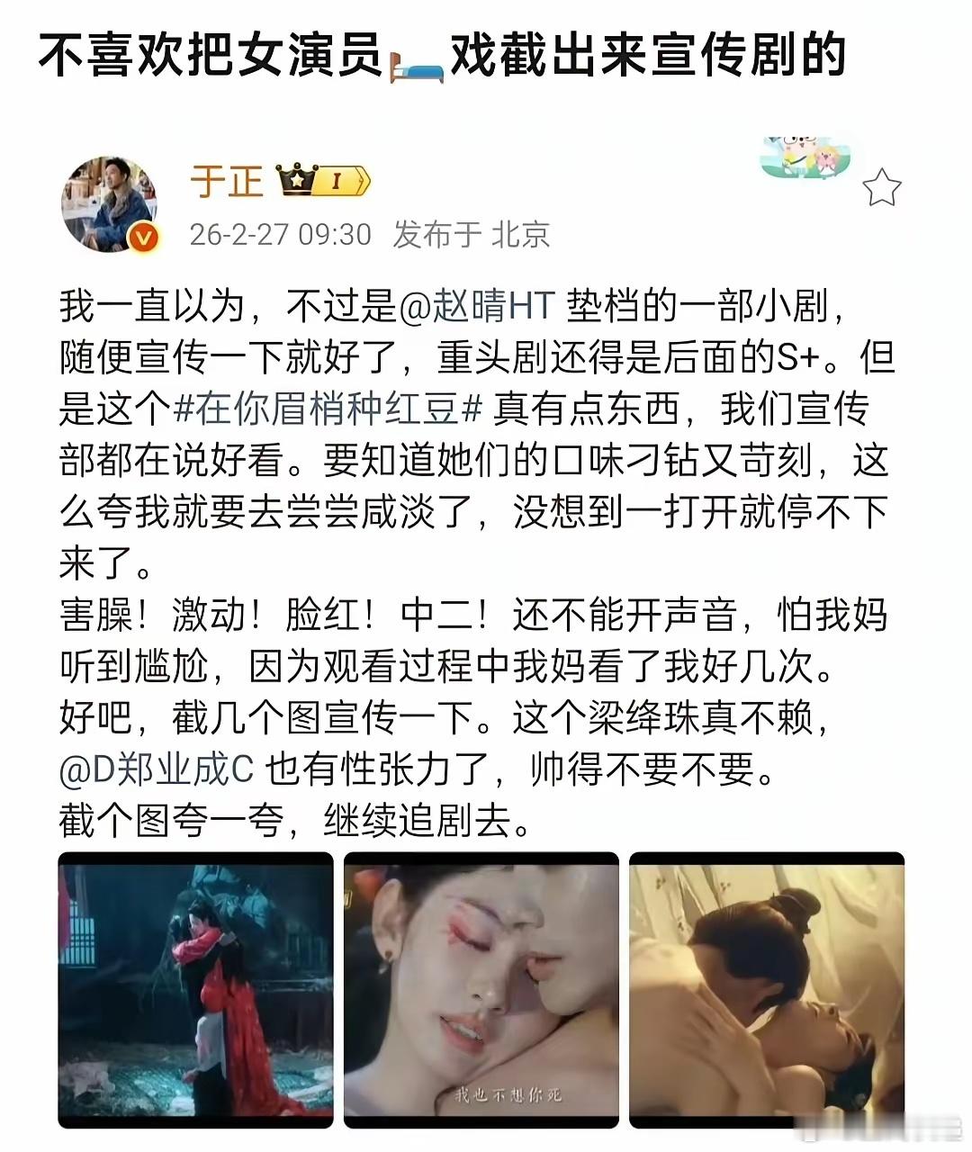 于正为了推《在你眉梢种红豆》,他直接放了好几张剧里的亲密戏截图。