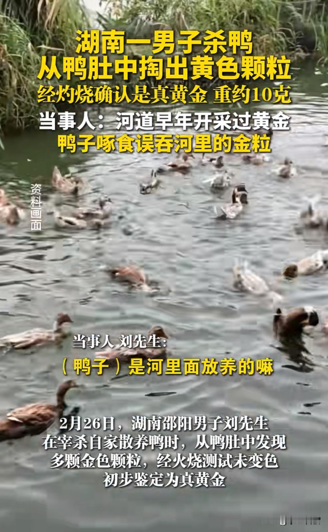 人有时候运气来了,财运那真是挡都挡不住! 2月26日,湖南邵阳的刘先生宰杀自家散养的鸭子时,竟在鸭肚子里发现了许多黄色颗粒。之后,刘先生用火煅烧,确认这些黄色颗粒是真黄金,总重约10克,价值1万多元。 据当事人刘先生称,这条河道早年开采过黄金,估计鸭子啄食了河里的金粒,无法消化,便留在了鸭肚子里。 不得不说,刘先生运气实在太好了,杀只鸭子就白得了价值一万多的黄金。 对此,大家怎么看?欢迎在评论区交流。