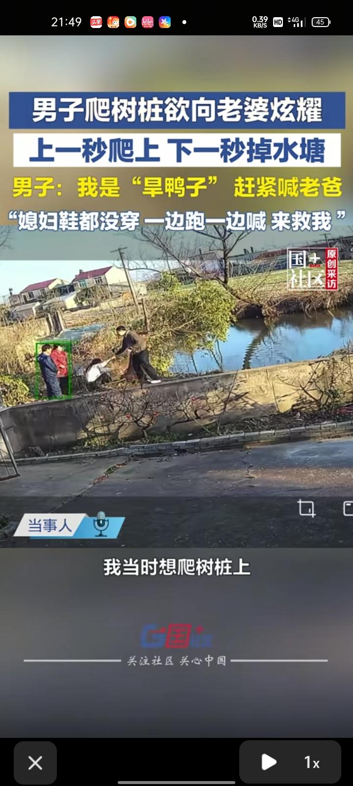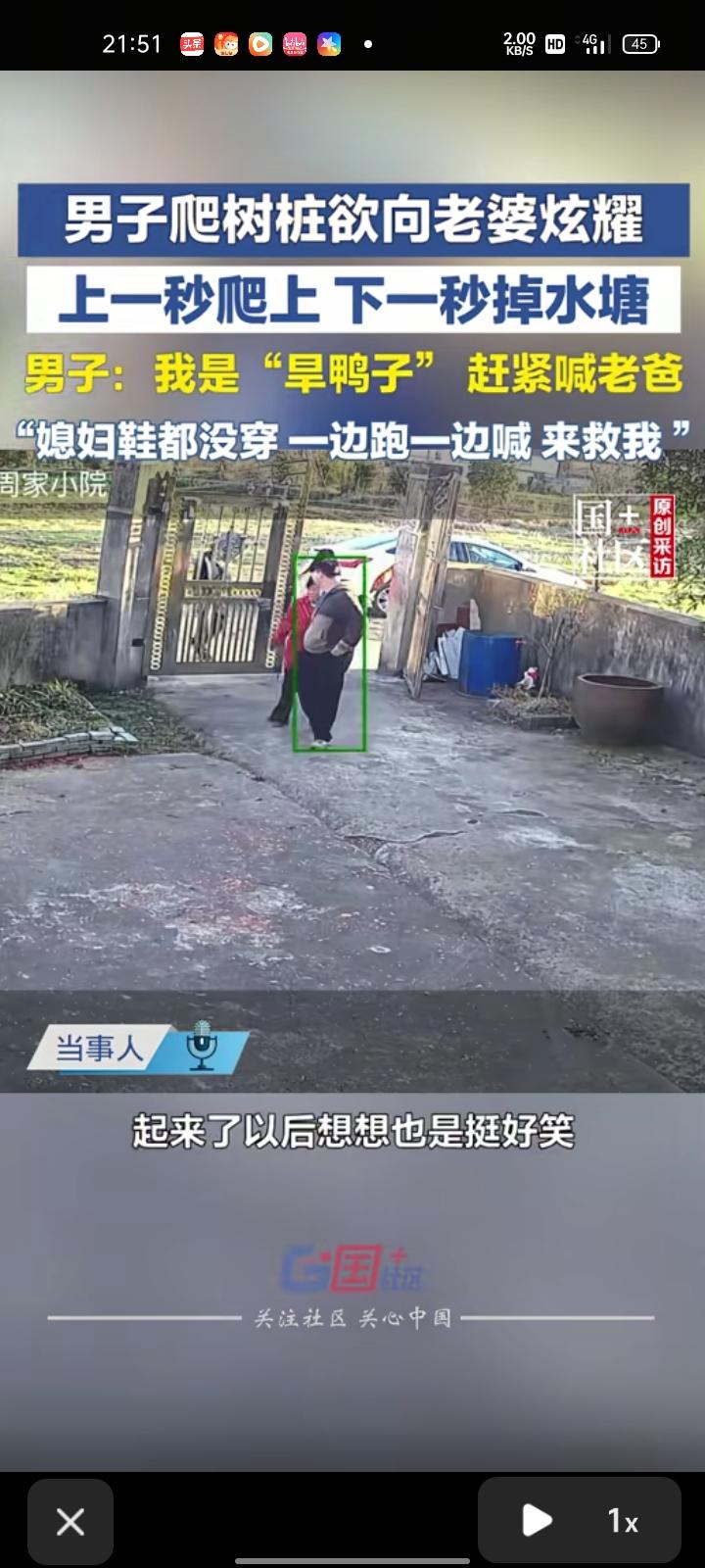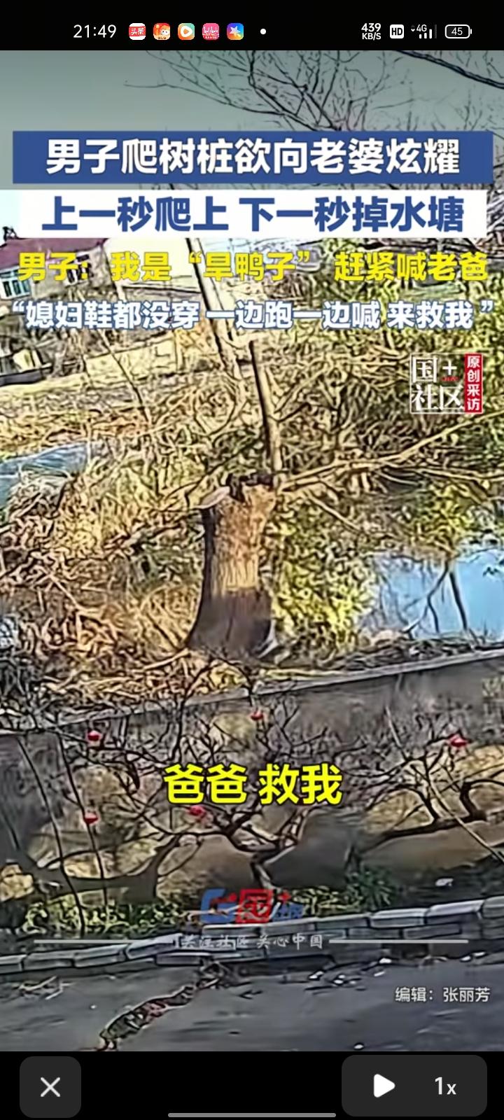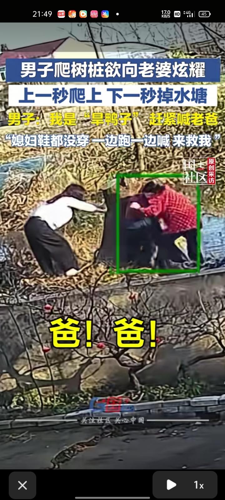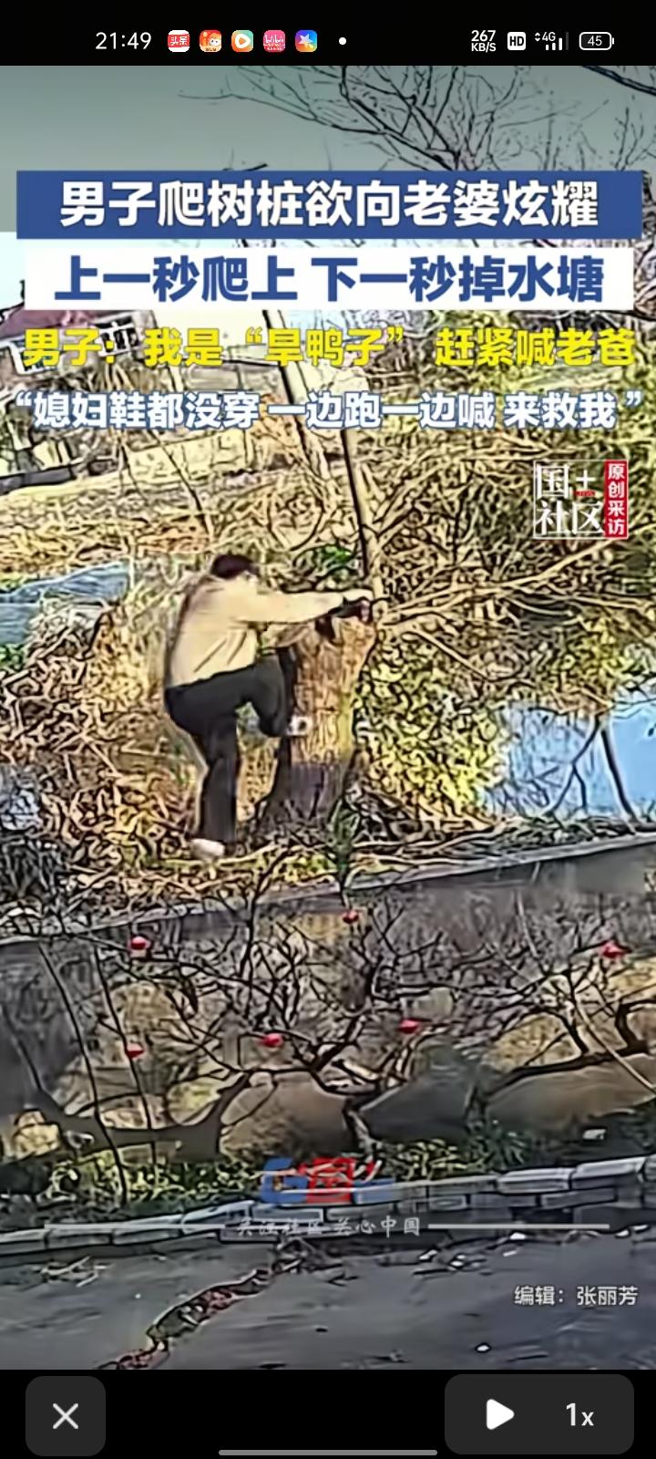 2月21日,安徽芜湖。监控画面显示,男子爬树桩欲向老婆炫耀,刚爬上去,下一秒就掉水塘了。老婆看到后吓坏了,带着孩子到水塘边把他救出来,连鞋子都没穿。 当事人称,除了裤子破了,没啥大事,就是吓到了起来以后想想都挺好笑