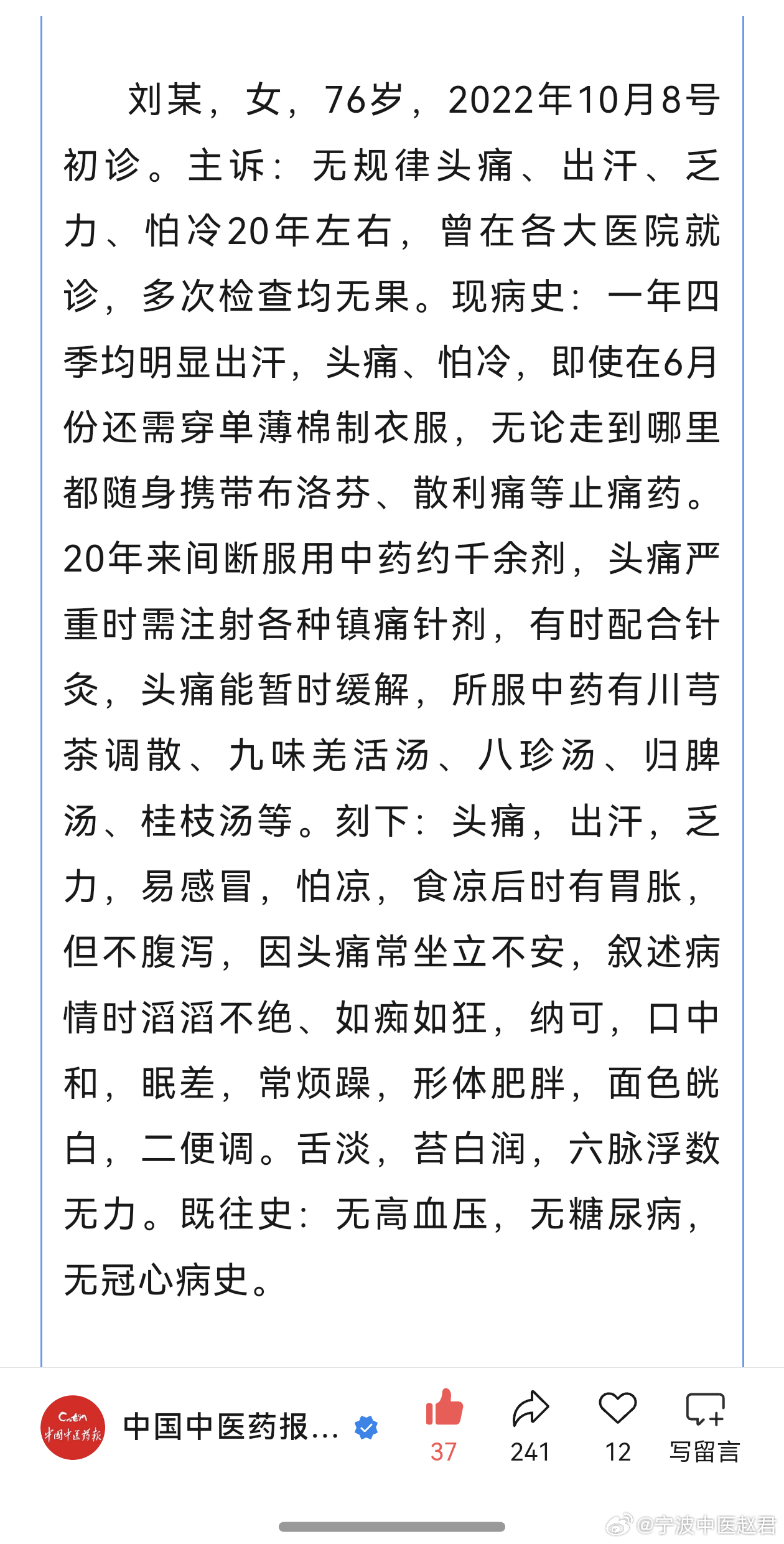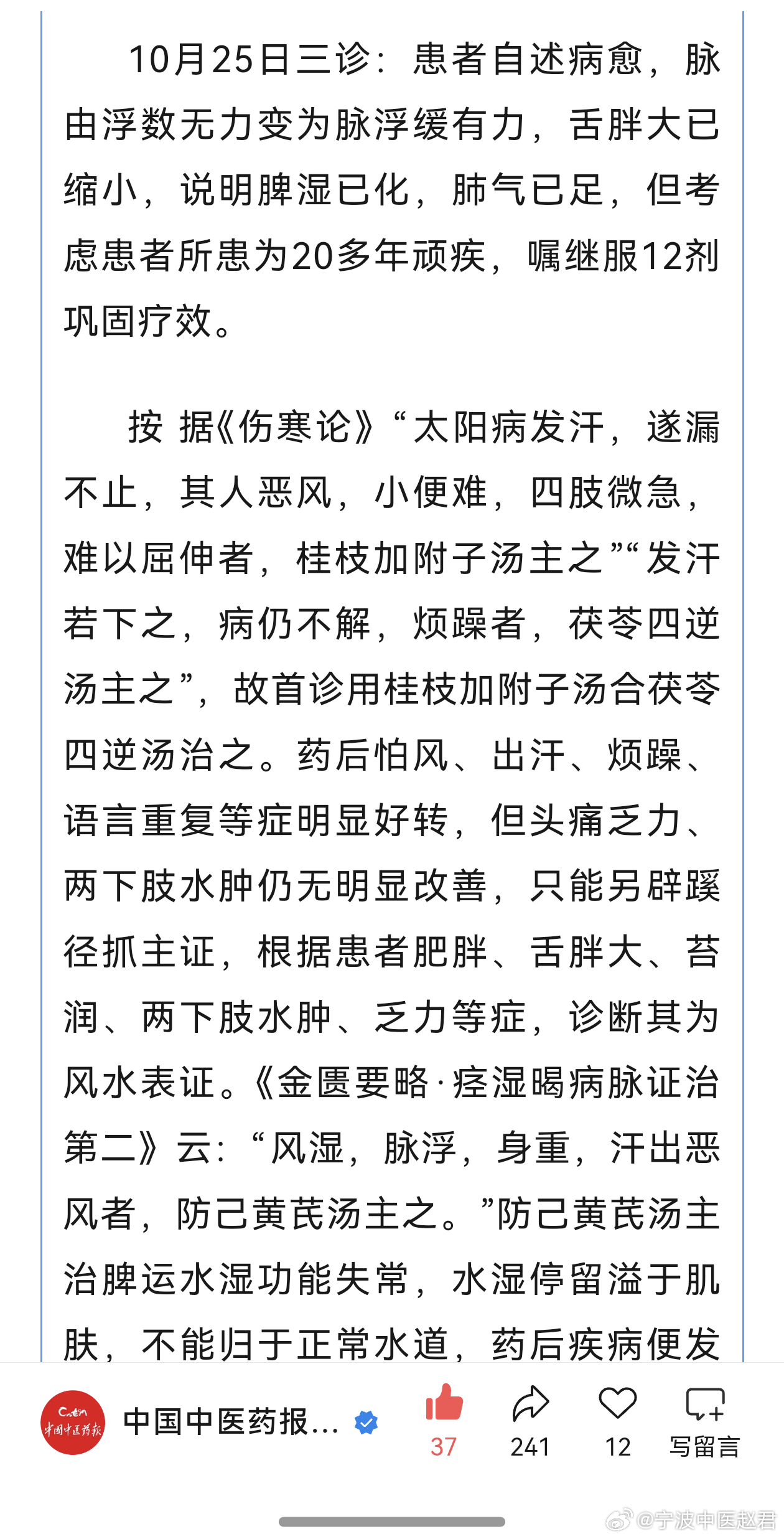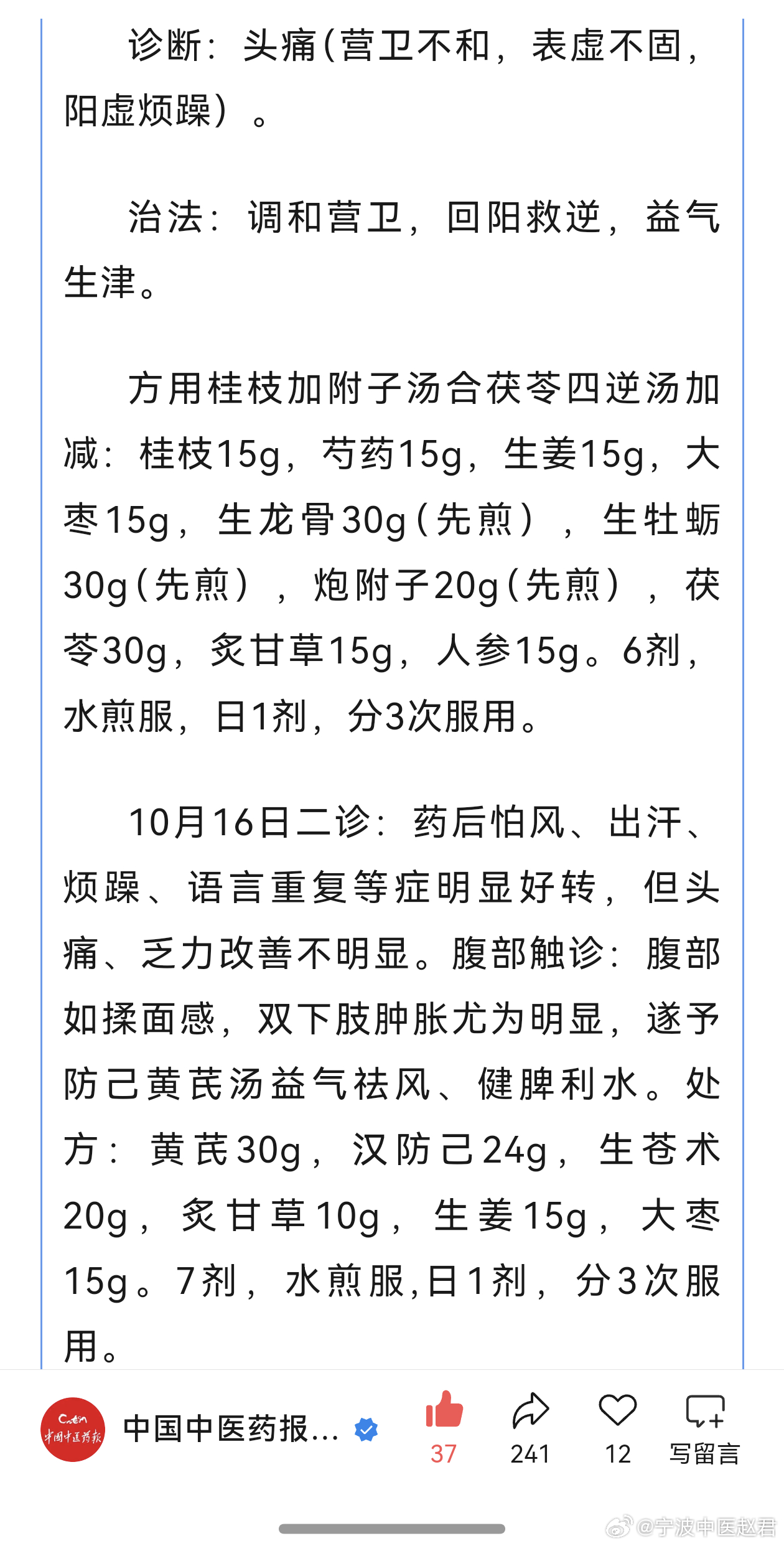 今天从早到晚继续听经典经方的讲座,看到治疗风水的防己黄芪汤,我搜索方剂组成,忽然发现中国中医药报公众号刊登了山东省济南市平阴县石桥口卫生室石善林先生的一则医案。他用防己黄芪汤治愈了顽固头痛20年的患者