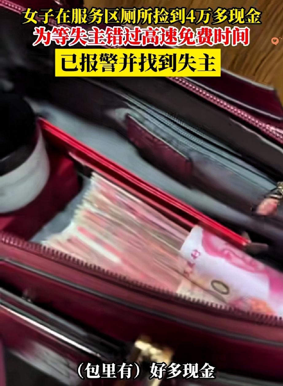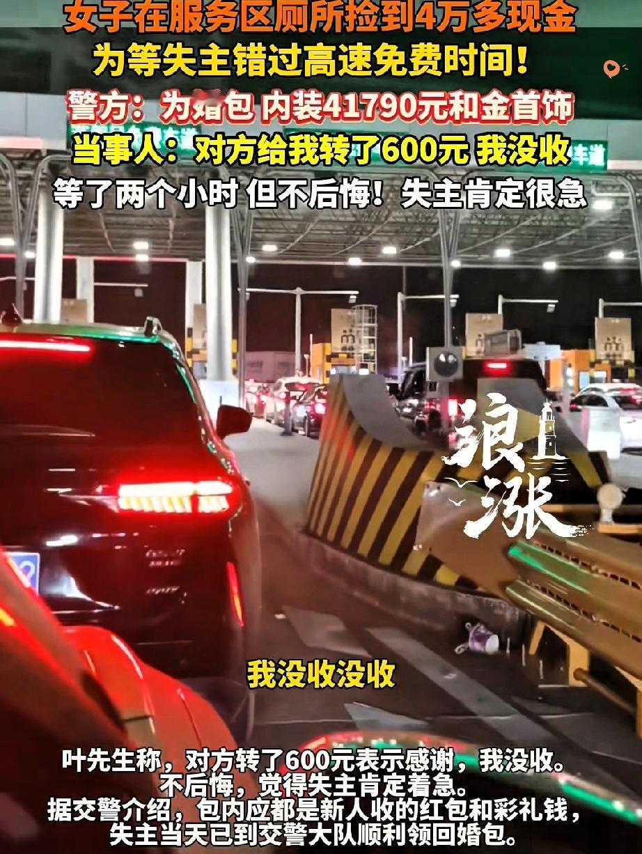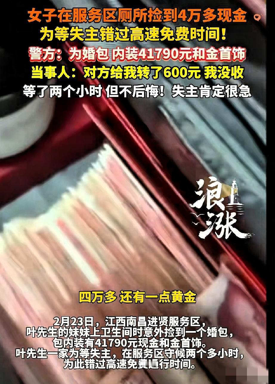 4万现金+金饰遗落服务区,女子等失主错过高速免费! 拒绝600感谢费的样子,才是最珍贵的体面! 江西大姐一家返程途经服务区,在厕所捡到个婚包,里面装着4万多现金和金饰,却没找到失主联系方式。 为了当面归还,他们在服务区足足等了俩小时,最后不仅没等到人,还彻底错过了高速免费时段。 报警交包后,失主后来辗转联系上,转来600元感谢费,大姐一家直接婉拒,只说“我们的损失不要紧”。 很多人觉得这是傻,可《民法典》早就说拾金不昧是义务,大姐却把义务做成了善意。 比起那些为几秒高速费纠结的人,她错过的是蝇头小利,守住的是心里的光。 善良从不是理所当然,而是主动选择的温暖。 你要是遇到这种情况,会愿意为了归还失物付出额外成本吗?