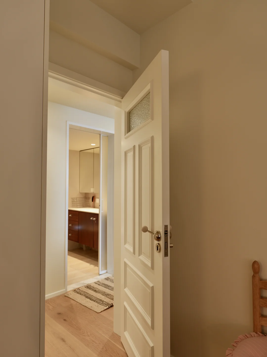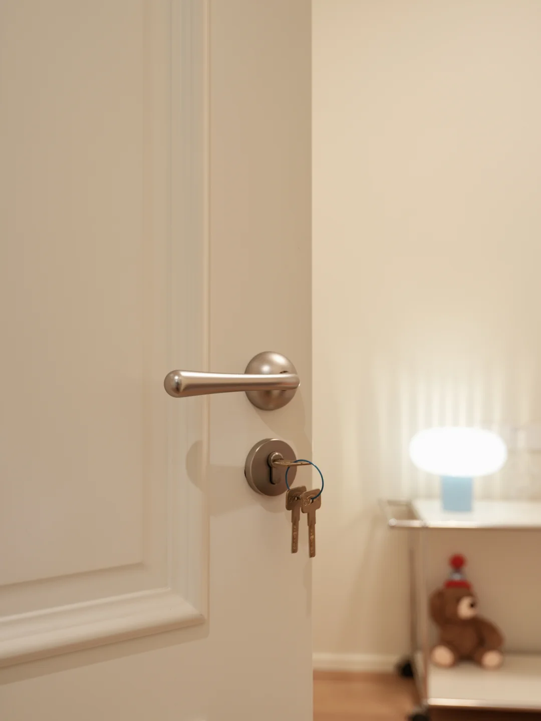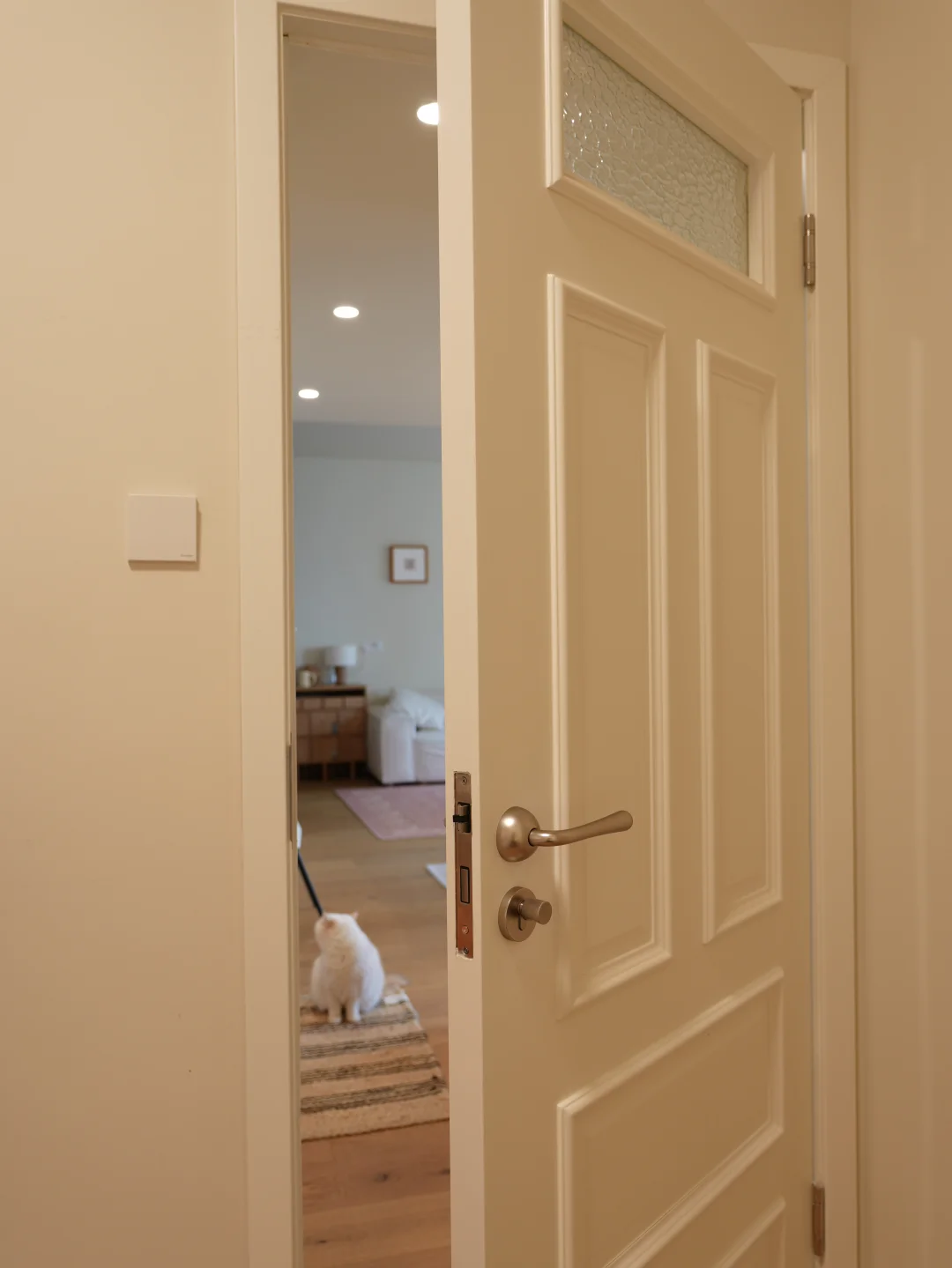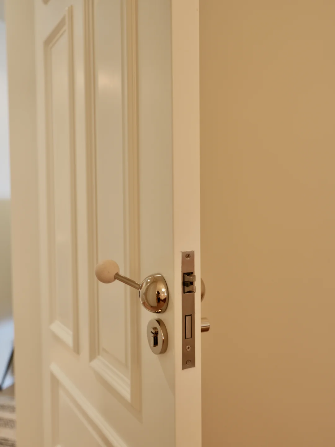 我家门是在线下订的 但门锁还是网购比较合心意🫶 家里所有五金我都是选的银色 主卧门是做的白色实木烤漆 拿了踢脚线的样板定的同色木门 所以色系很和谐 - 主卧门搭配银色镜面门锁 像哆啦A梦的小手很可爱😻 次卧则选了哑光镍色中古风门锁 更简约低调 再搭配上可爱的挂件 新年的气氛更活跃一些~