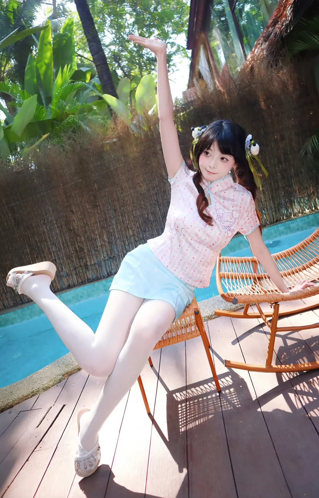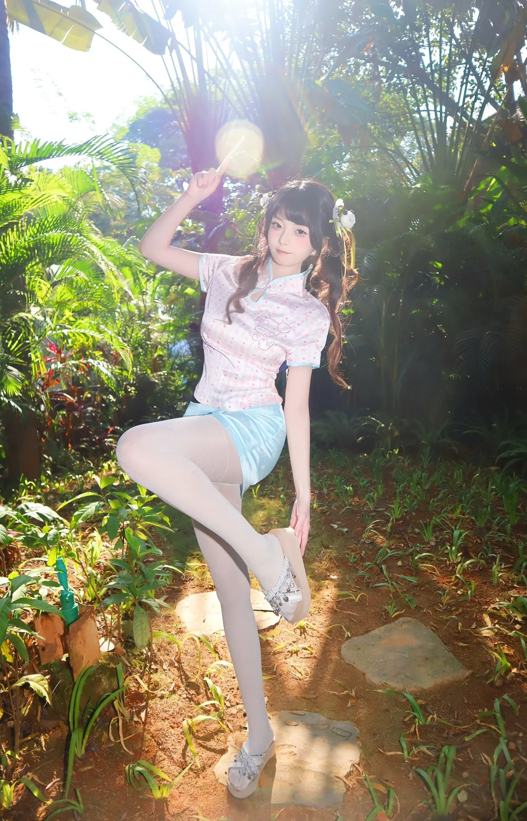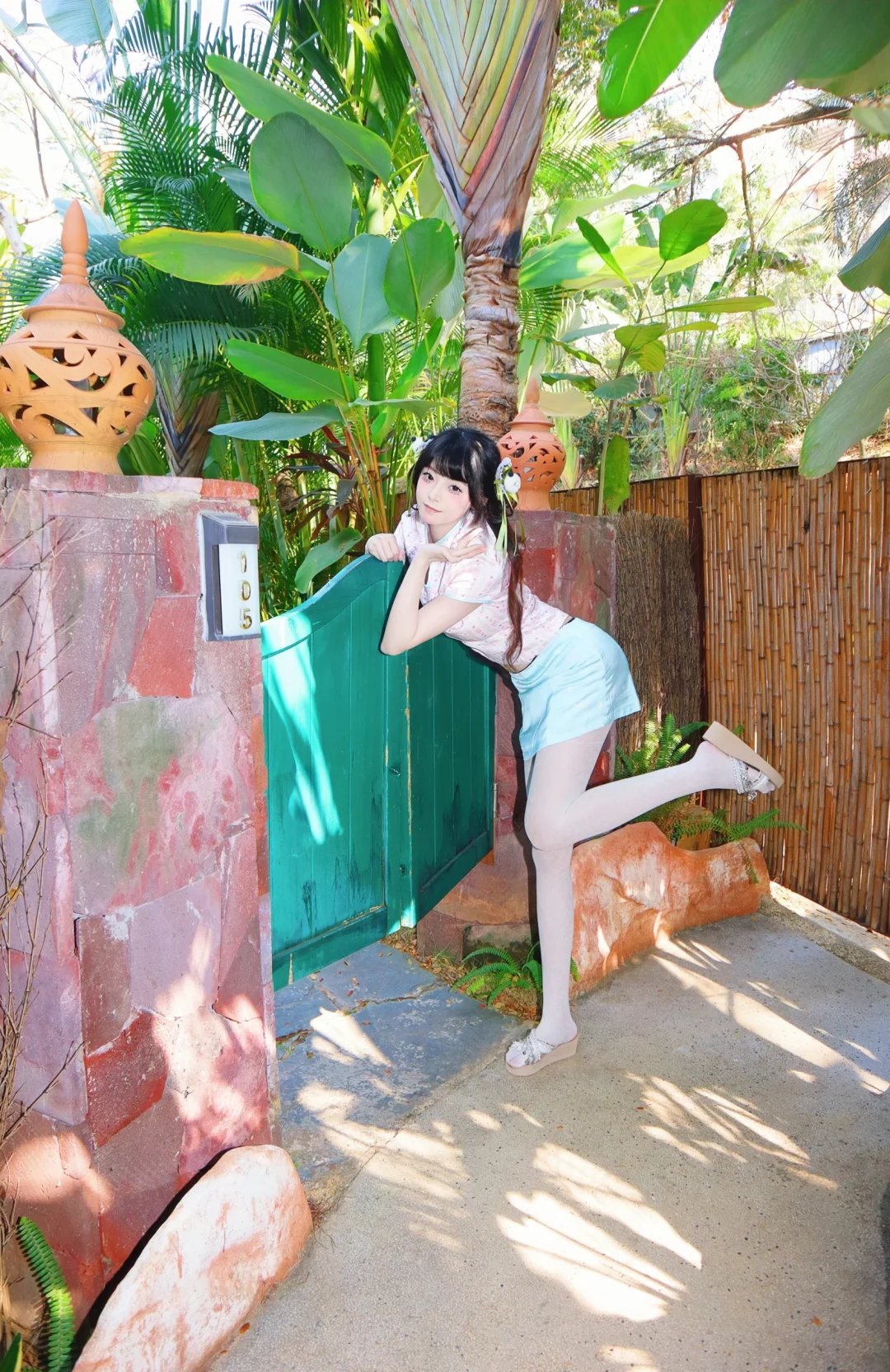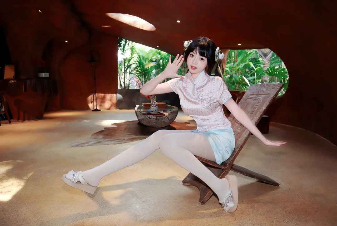 风拂柳,粉樱绽放,我身着浅粉蕾丝旗袍,立于古栏之下。长袖轻笼,盘髻缀珠,耳坠摇曳