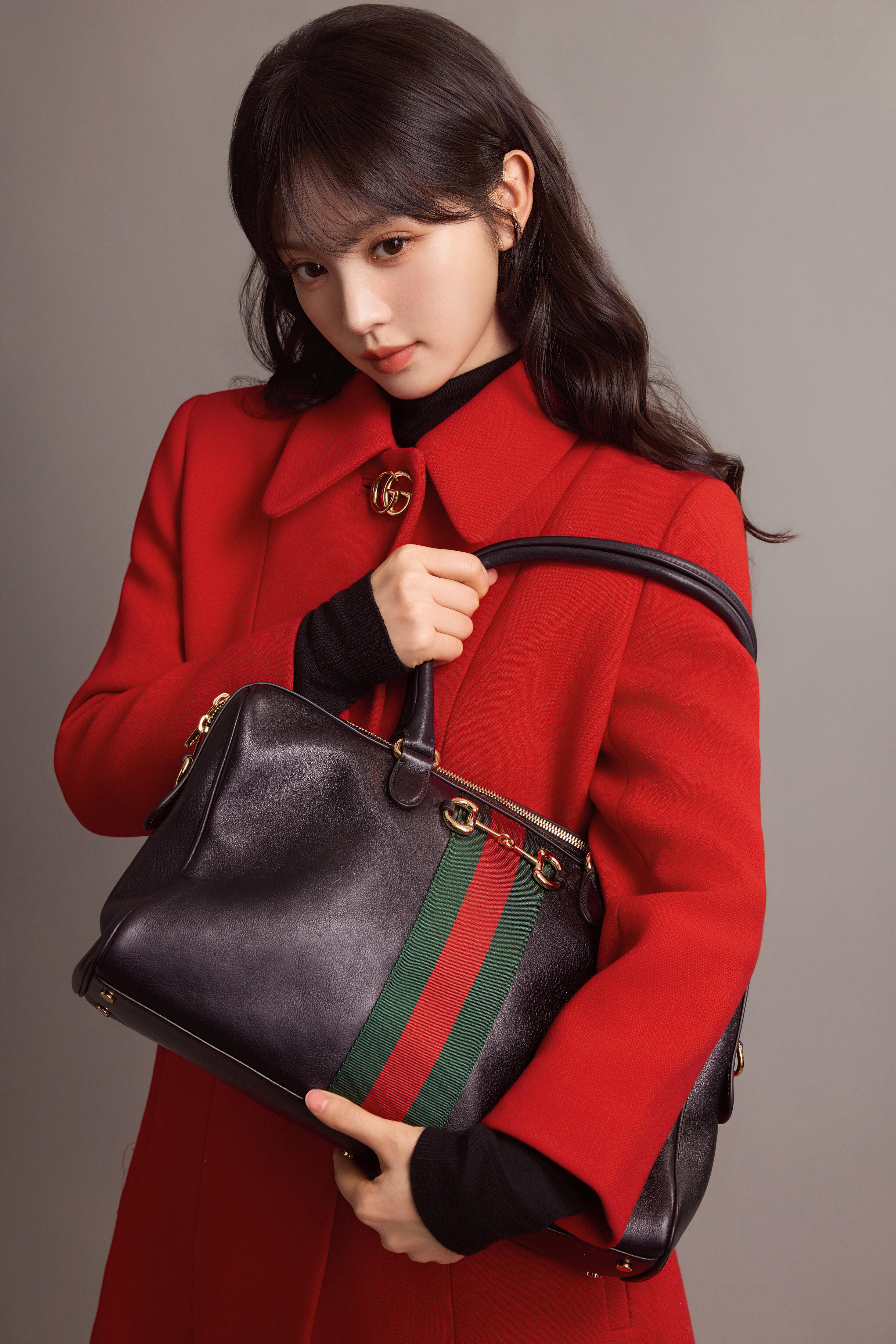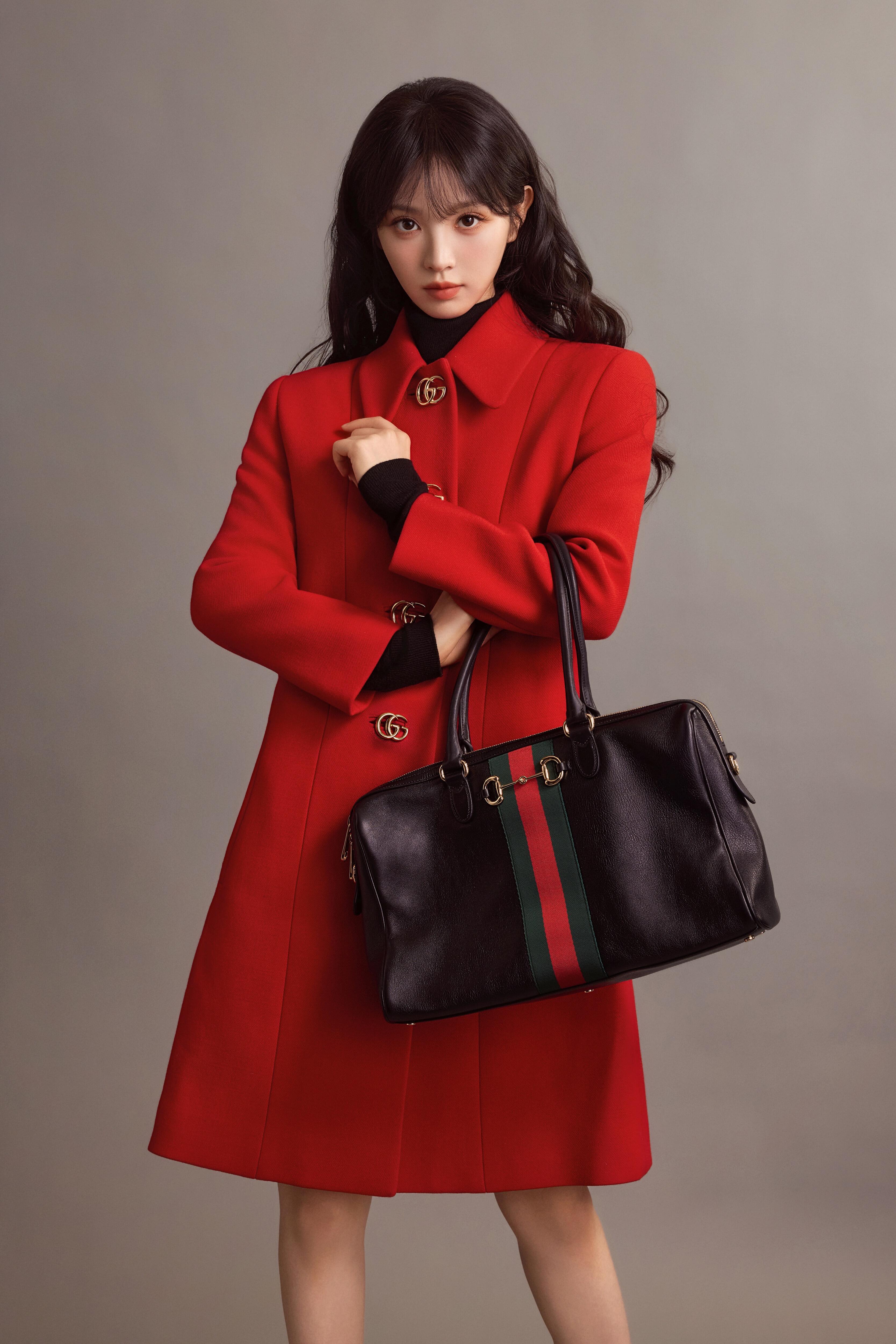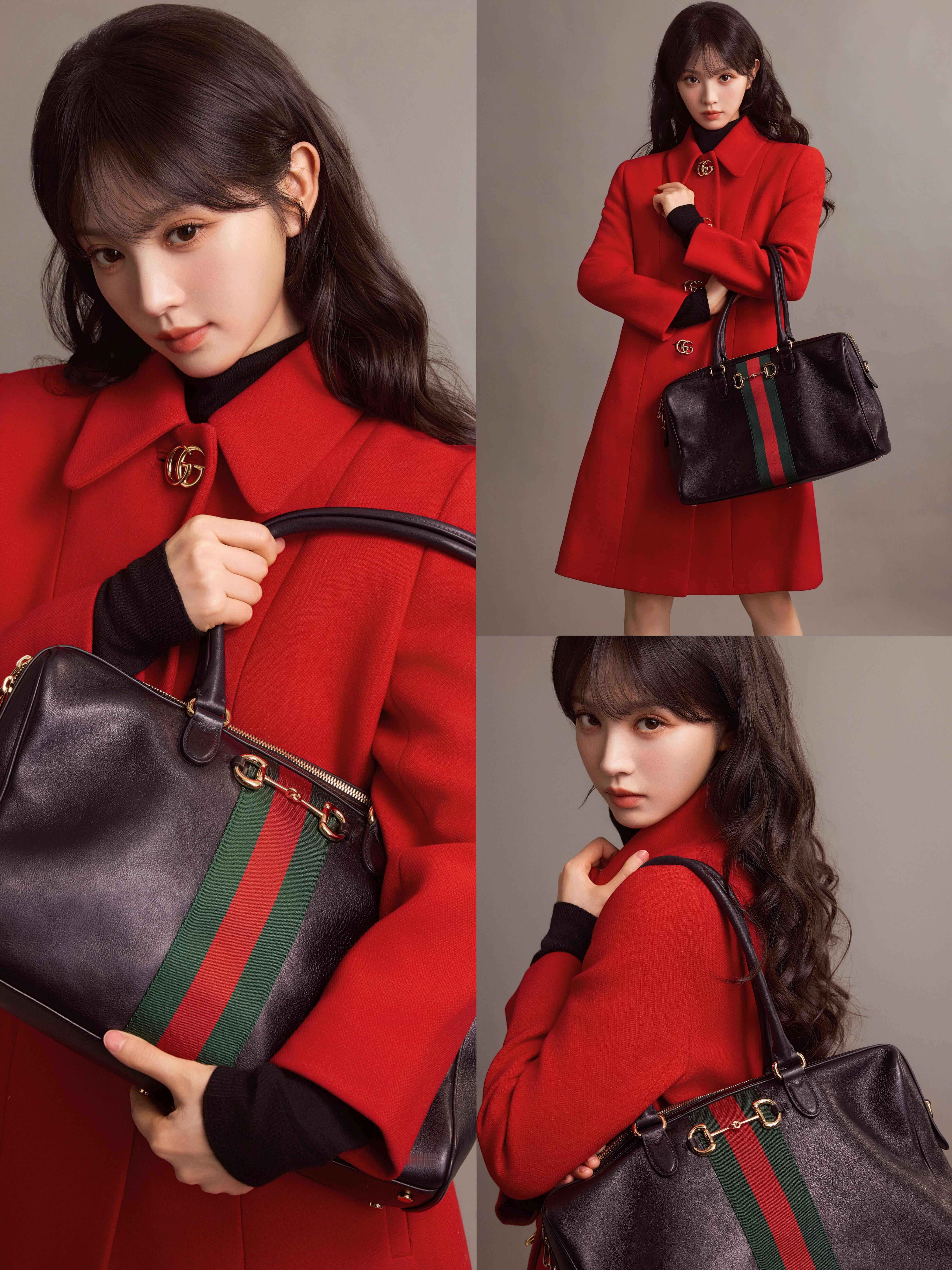 时尚灵感解读 田曦薇Gucci《La Famiglia》系列正红色大衣,搭配标志性Borsetto手袋,利落剪裁勾勒优雅轮廓,复古金扣点亮,摩登大气。