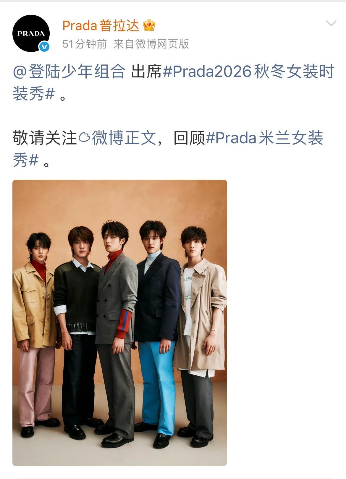 Prada微博第一个认领了TOP登陆少年团朱志鑫、张泽禹、张极、左航、苏新皓看秀