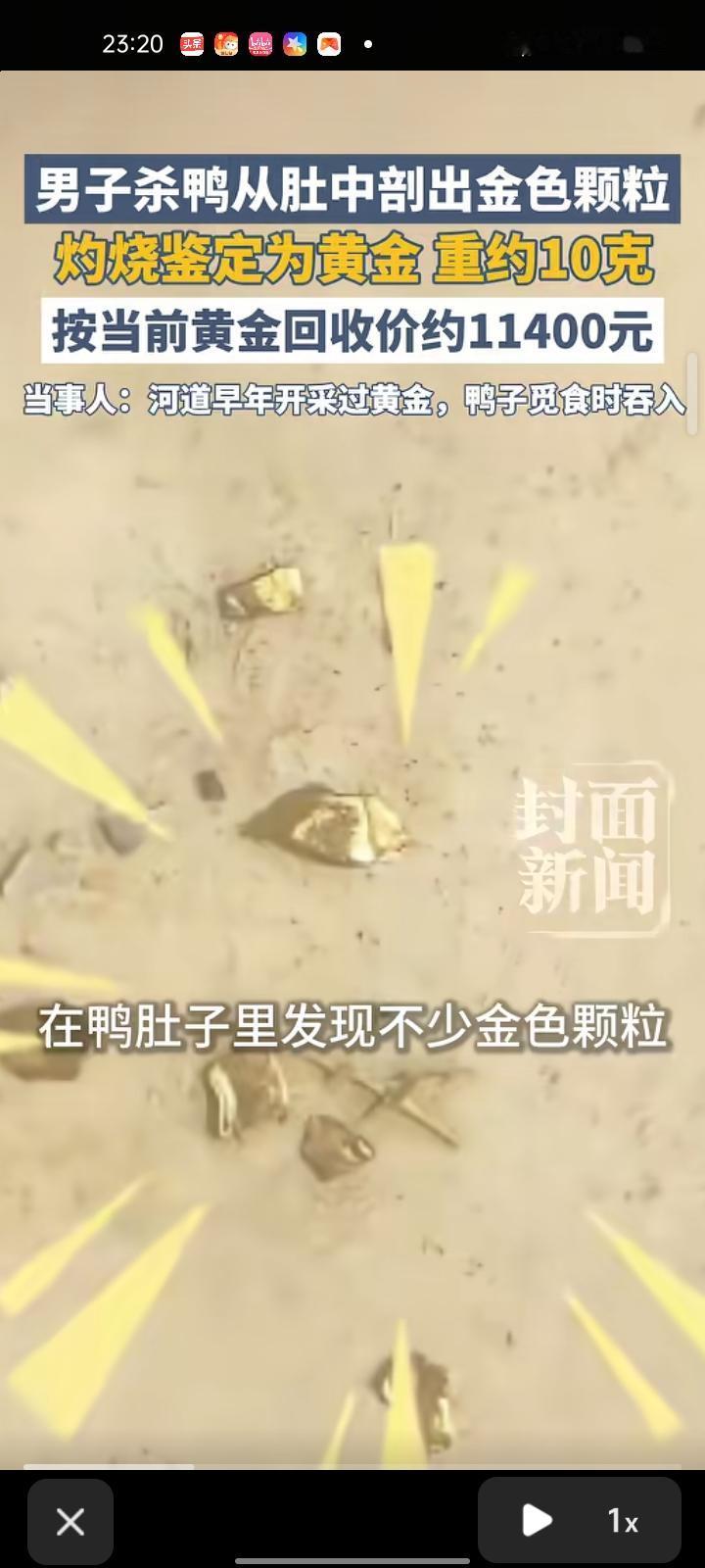 2月26日,湖南邵阳。男子过年宰杀自家散养鸭子时,在鸭肚子里发现不少金色颗粒,用火一烧,确认是真黄金,总重约十克,按当前黄金回收价约11400元。 当事人刘先生称,当地河道早年开采过黄金,鸭子常年在河里散养,金子就被吃进肚子里了。当地老人说这事见怪不怪了,其他人遇到过类似情况,只是没有我发现的多。 平凡生活里藏着不期而遇的惊喜,这我只能说这只鸭子是真正的 “招财鸭”,养它等于养了个小金库。这既是大自然的温柔馈赠,也是日子里最动人的小幸运。