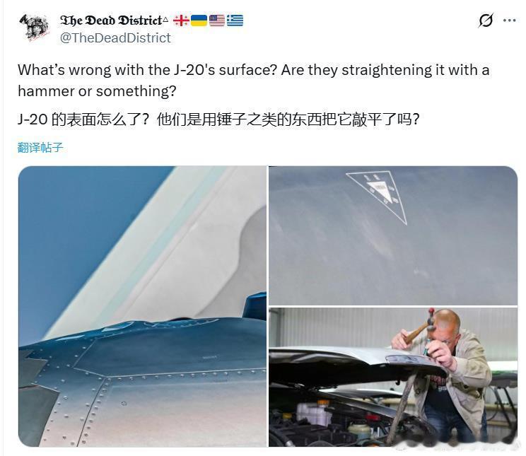 各种要素拉满的老外嘲讽歼20的蒙皮是用锤子敲平的。