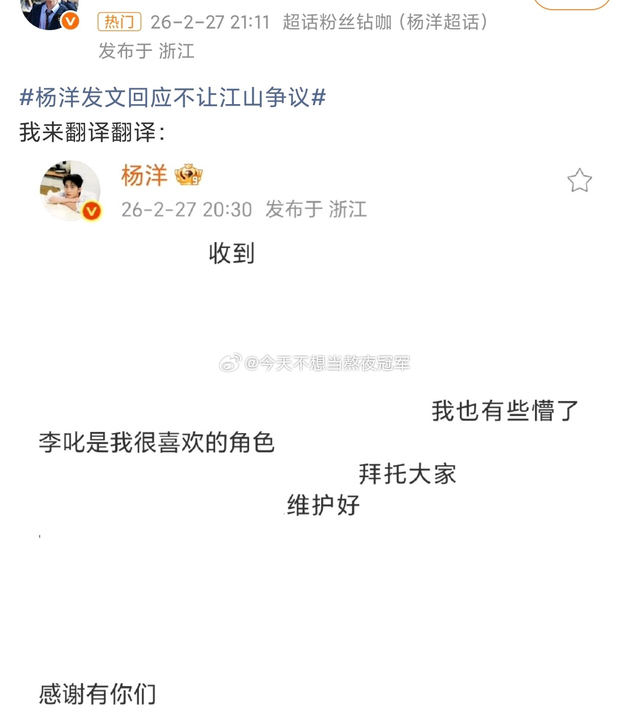 杨洋《不让江山》最新🍉一是剧方没有让步,只是装模作样发了个回应,平台打配合直接向杨洋团队放了狠话,让两天之内回组继续拍。二是平台开机前才发现阴阳剧本,派了自己人去和剧组谈。无论是哪一种,修改剧本和协议至少消耗个把月,现在影视寒冬,艺人话语权本来就低,yyls手上很可能没有更好的剧本,这个沉没成本对于双方来讲都是巨大的,后续估计只能继续拍,走一步看一步了。。。 ymls自求多福吧杨洋发文回应不让江山争议