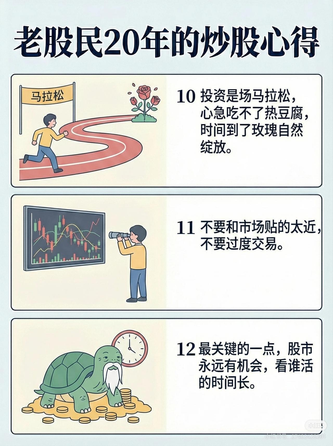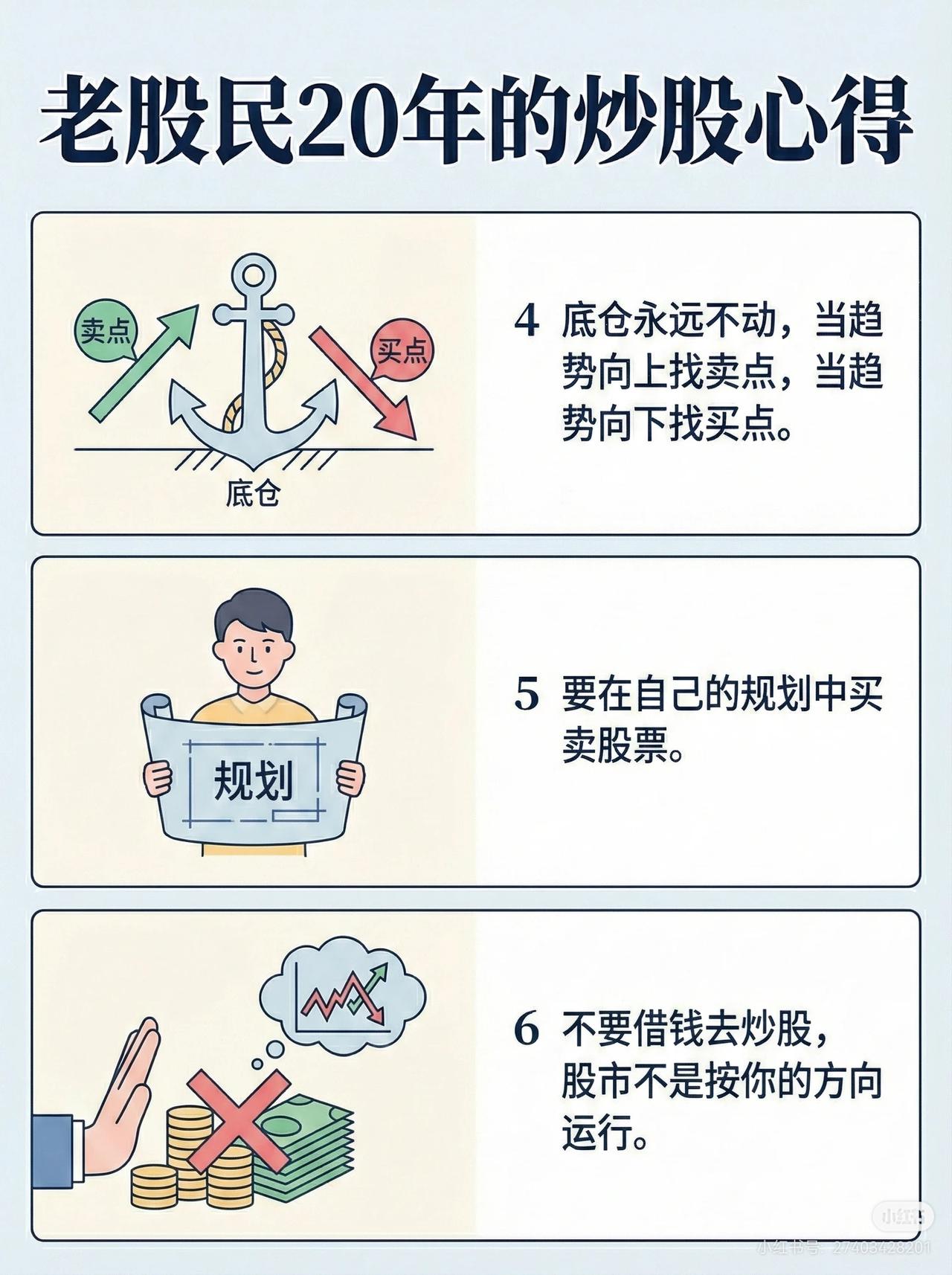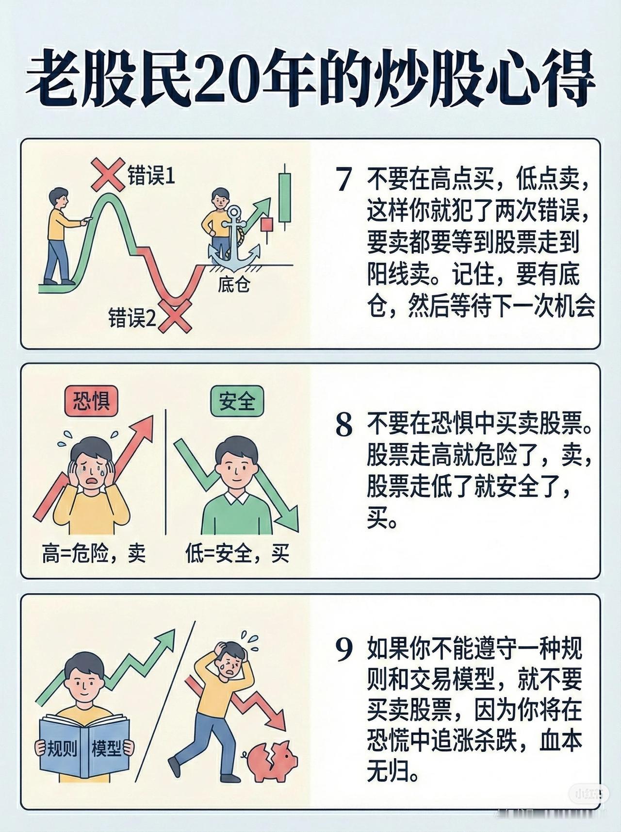 老股民20年炒股心得(合集) 1. 仓位控制 - 仓位分配:50% 长线,50% 波段。 - 长线部分稳定持有,波段部分低买高卖,灵活操作。 2. 持股周期与安全边际 - 看好一只股票,至少持有 6–9 个月。 - 选股必须考虑安全边际,降低风险。 3. 技术分析 - 技术指标不要过多,专注 60 分钟线。 - 阴线买入,阳线卖出。 4. 买卖点策略 - 底仓永远保留不动。 - 趋势向上时寻找卖点,趋势向下时寻找买点。 5. 计划交易 - 所有买卖必须在自己提前制定的规划内执行,不随意操作。 6. 风险控制 - 不要借钱炒股,市场不会按个人意愿运行。 7. 避免错误操作 - 不在高点买、低点卖,否则会犯两次错。 - 要卖时等阳线出现再操作,始终保持底仓,等待下一机会。 8. 情绪管理 - 不要在恐惧中交易。 - 股价高=危险→卖,股价低=安全→买。 9. 遵守规则 - 必须有可执行的交易规则与模型,否则容易在恐慌中追涨杀跌,血本无归。 10. 长期视角 - 投资是马拉松,心急吃不了热豆腐,时间到了回报自然会来。 11. 与市场的距离 - 不要过度贴近市场波动,减少频繁交易。 12. 生存至上 - 股市永远有机会,关键在于谁能活得久、坚持到机会来临。 这份心得融合了仓位管理、技术分析、情绪控制、风险管理与长期投资的理念,非常适合作为个人交易纪律的参考。