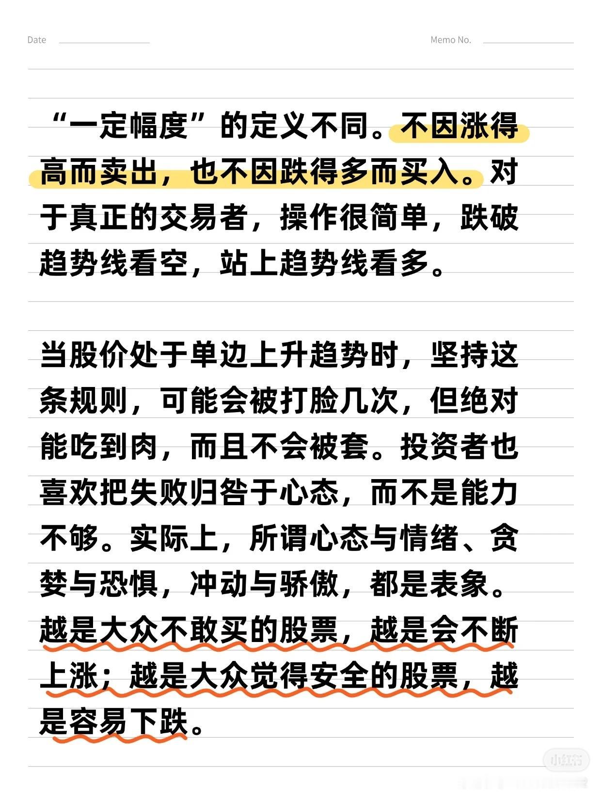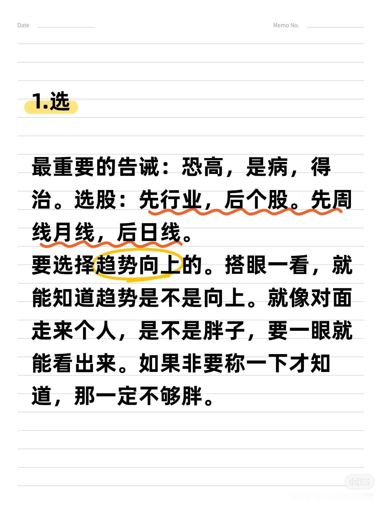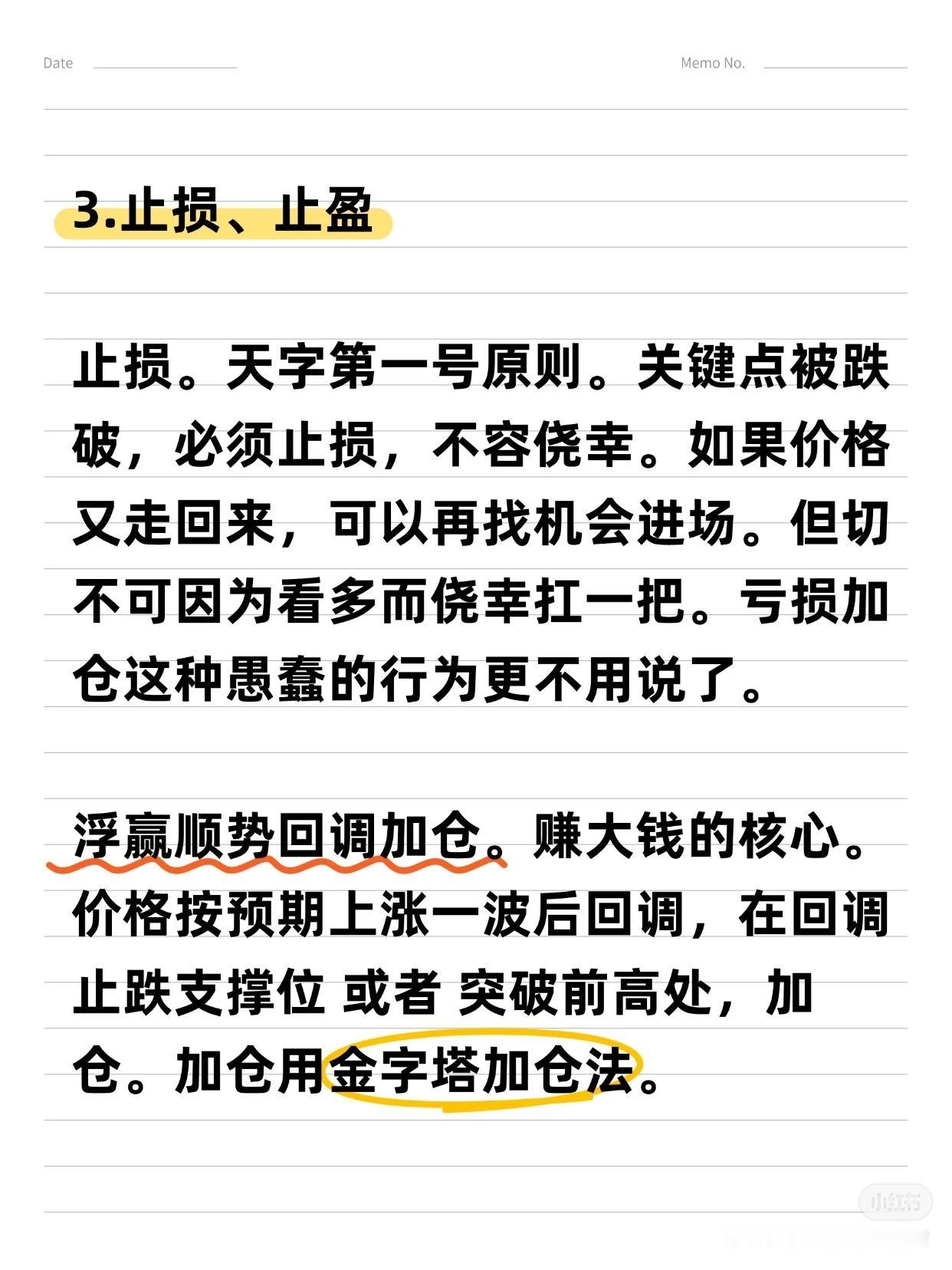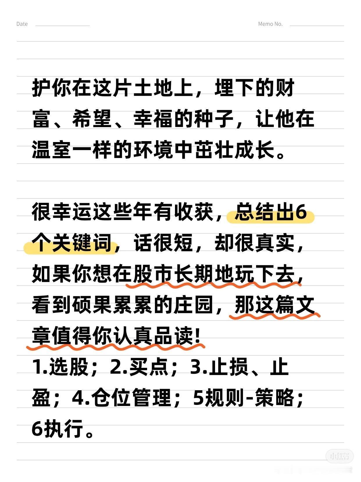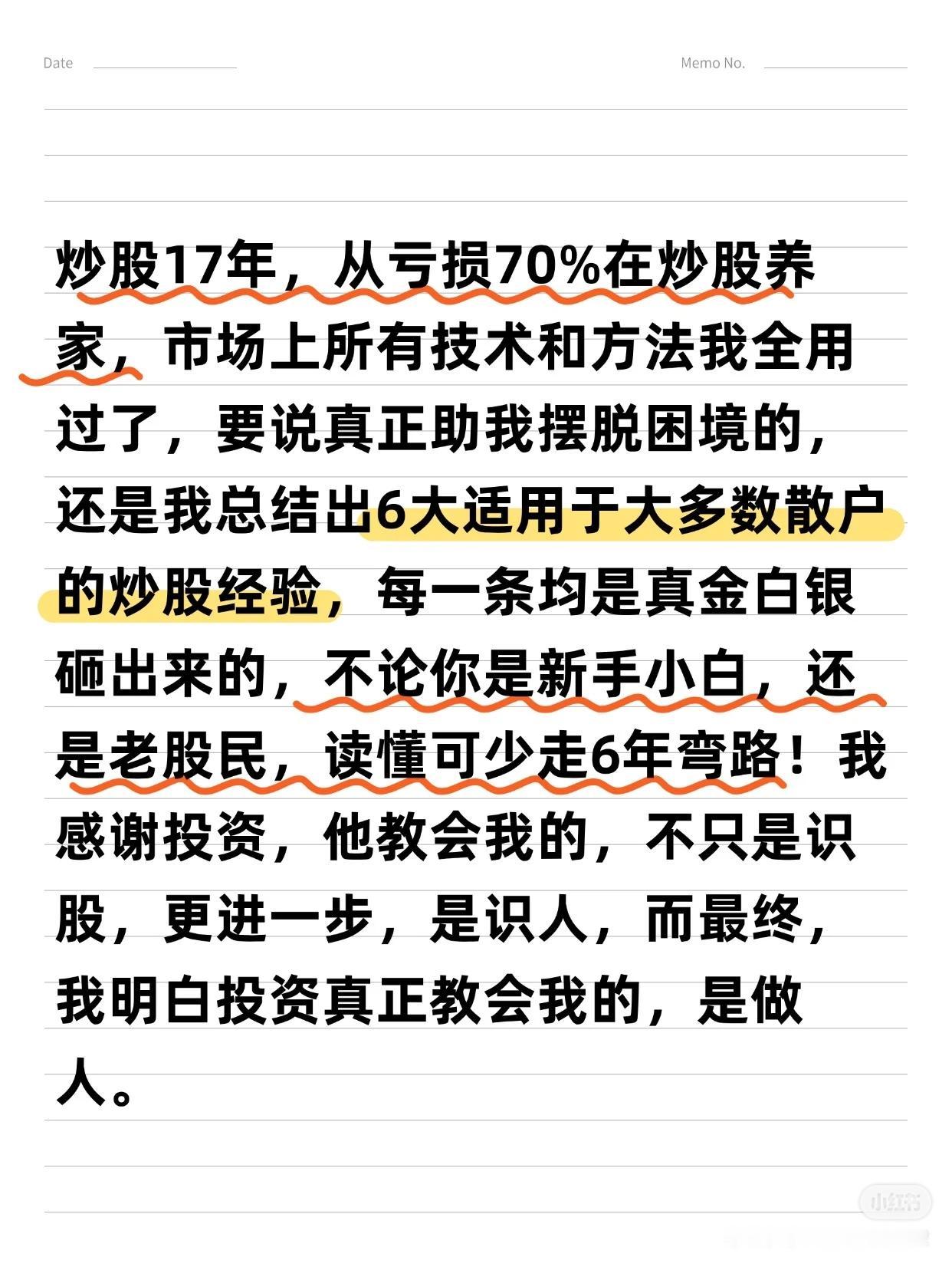 从亏损到“炒股养家”的6大关键词 作者拥有17年炒股经历,从亏损70%到实现稳定盈利,总结出6条用真金白银换来的经验,适用于大多数散户,能帮助您少走6年弯路。 6大关键词:选股 → 买点 → 止损/止盈 → 仓位管理 → 规则/策略 → 执行 一、 选股:趋势为王,克服“恐高” * 核心理念:“恐高,是病,得治。” 选择趋势向上的股票,要像判断一个人是否胖子一样,一眼就能看出来,不需要精确计算。 * 方法论: 1. 先行业,后个股:先选好赛道,再选其中的公司。 2. 看长做短:先分析周线、月线确定大趋势,再关注日线寻找入场点。 二、 买点:勇于试错,拥抱趋势 * 核心策略:在股价突破时勇敢试错,抓住趋势。 * 关键心态:脸皮要厚,随时准备纠错。不要羡慕别人的策略,想好自己的策略——明确何时可能亏损,何时才能赚钱。 * 趋势要义:一定幅度的上涨就是买入的理由,一定幅度的下跌就是卖出的理由。 三、 止损与止盈:截断亏损,让利润奔跑 1. 止损(天字第一号原则): * 原则:关键点位被跌破,必须止损,绝不容许侥幸。 * 禁忌:绝对禁止“亏损加仓”。 2. 止盈与加仓: * 加仓:浮赢顺势回调加仓是赚大钱的核心。在回调止跌或突破前高时,采用金字塔加仓法。 * 移动止损:加仓后,将止损位移动至新的关键点。若失败则止损,若继续上行则持仓并继续移动止损,直到被止损或出现头部信号。 * 止盈:绝不轻易出场。耐心等待经典的头部信号或背离现象出现后再离场,最好一次性清仓。 四、 核心交易思维与市场认知 * 定义“一定幅度”:不因涨得高而卖出,也不因跌得多而买入。 * 操作极简主义:对于真正的交易者,操作很简单——跌破趋势线看空,站上趋势线看多。 * 反人性思维: * 越是大众不敢买的股票,越是会不断上涨。 * 越是大众觉得安全的股票,越是容易下跌。 * 坦然面对回撤:浮盈肯定会回撤,必须接纳。不要追求卖在最高点,坦然接受V型反转带来的利润回吐,因为这本就不是你计划捕捉的行情。 五、 投资的终极感悟 投资最终教给作者的,不只是识别股票和市场,更是识人与做人。成功的投资者能在心中构建一幅图景:资本市场是一片肥沃的土地,宏观、政策、行业和经营如同阳光雨露,滋养着播下的财富种子。 总结:这套方法的本质是建立一套完整的、可执行的规则与策略,并通过强大的执行力将其贯彻到底。它需要您克服人性的弱点,用理性和纪律去换取长期的生存与盈利。