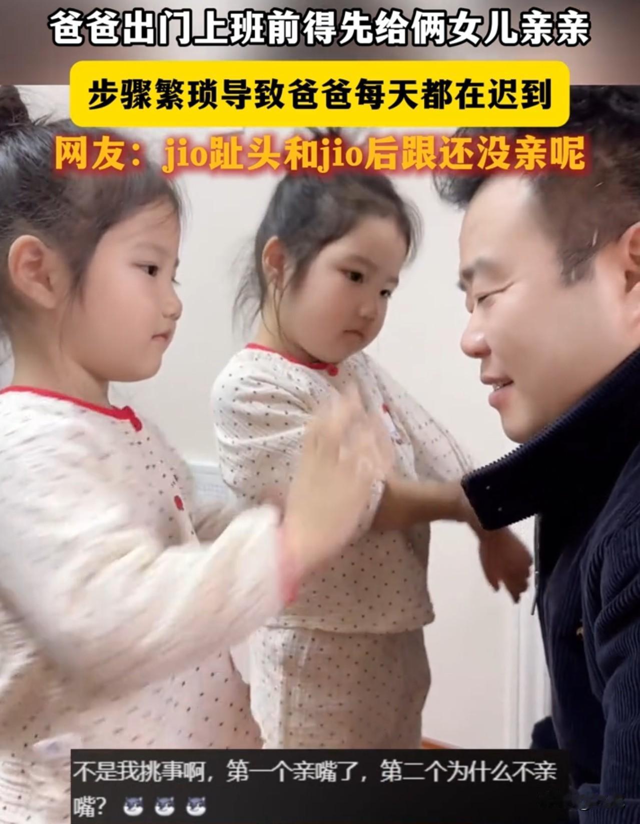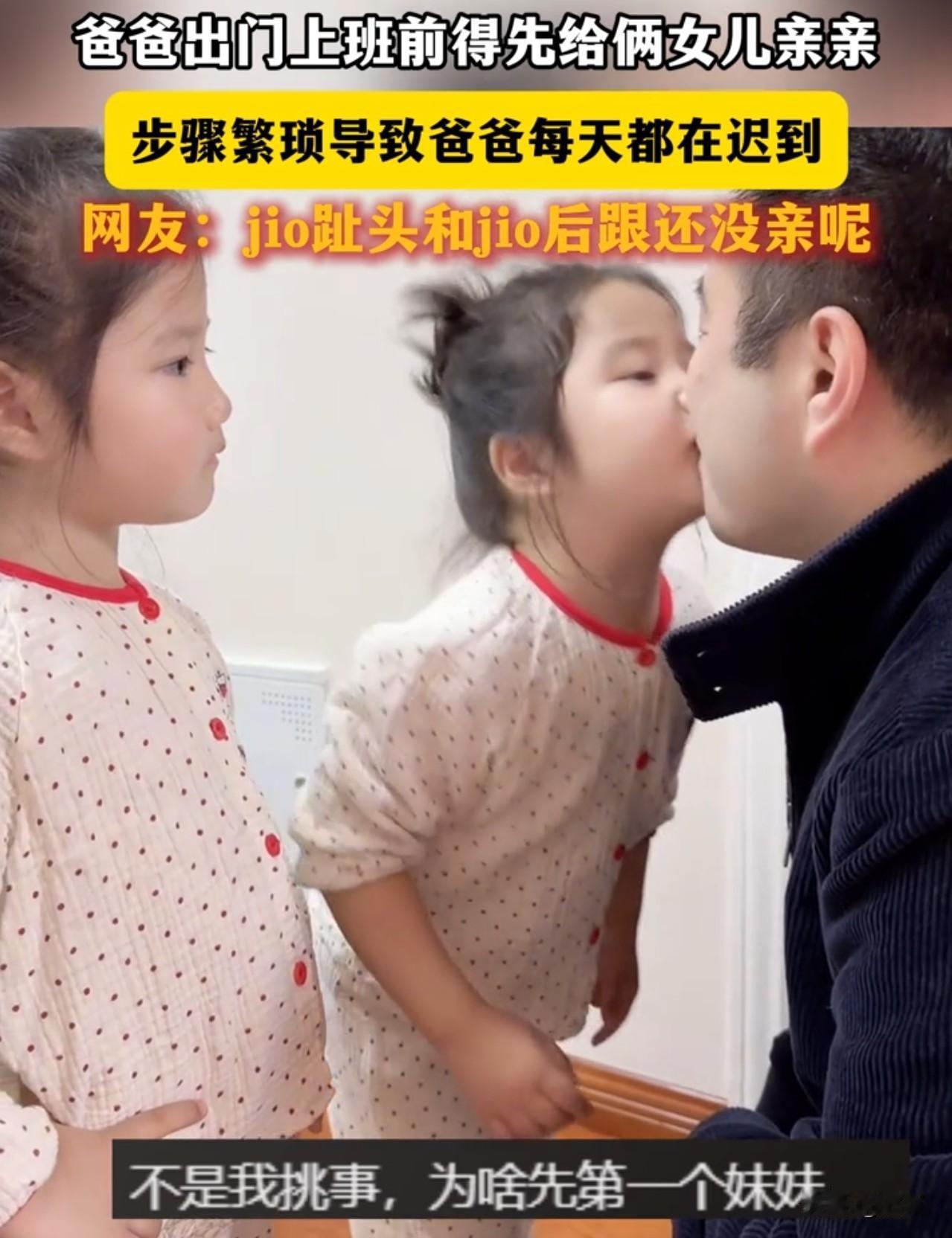 这幸亏是人,要是蜈蚣,亲完都能下班! 一爸爸出门上班前得先亲亲俩女儿,从手心到手背,额头到脸颊,再来嘴巴。亲完第一个,还有第二个,步骤繁琐,一套流程下来,爸爸嘴巴亲麻了不说,还上班迟到了。 当然,这爸爸,出轨的可能性降低很多,心被家里栓死了,没工夫想那些乱七八糟的了。 这幸福的负担,让没女儿除了羡慕了就是酸。不过安全起见,亲嘴巴还是算了,万一细菌感染就不好了。毕竟孩子的免疫力相对较弱,大人携带的一些病菌可能会对孩子健康造成影响。 而且随着女儿慢慢长大,这种亲密的接触方式也需要适时调整。可以用拥抱、摸摸头这些更合适的方式来表达爱意。 爸爸宠溺的眼神,甜蜜的亲吻,对女儿们的爱溢于言表。这温馨的互动画面,会成为孩子们童年最美好的回忆。 工作很重要,家庭也很重要,希望这位爸爸能在工作和家庭之间找到更好的平衡,既能好好陪伴女儿们,又能顺利完成工作,毕竟生活就是要在幸福的小烦恼不断前行。