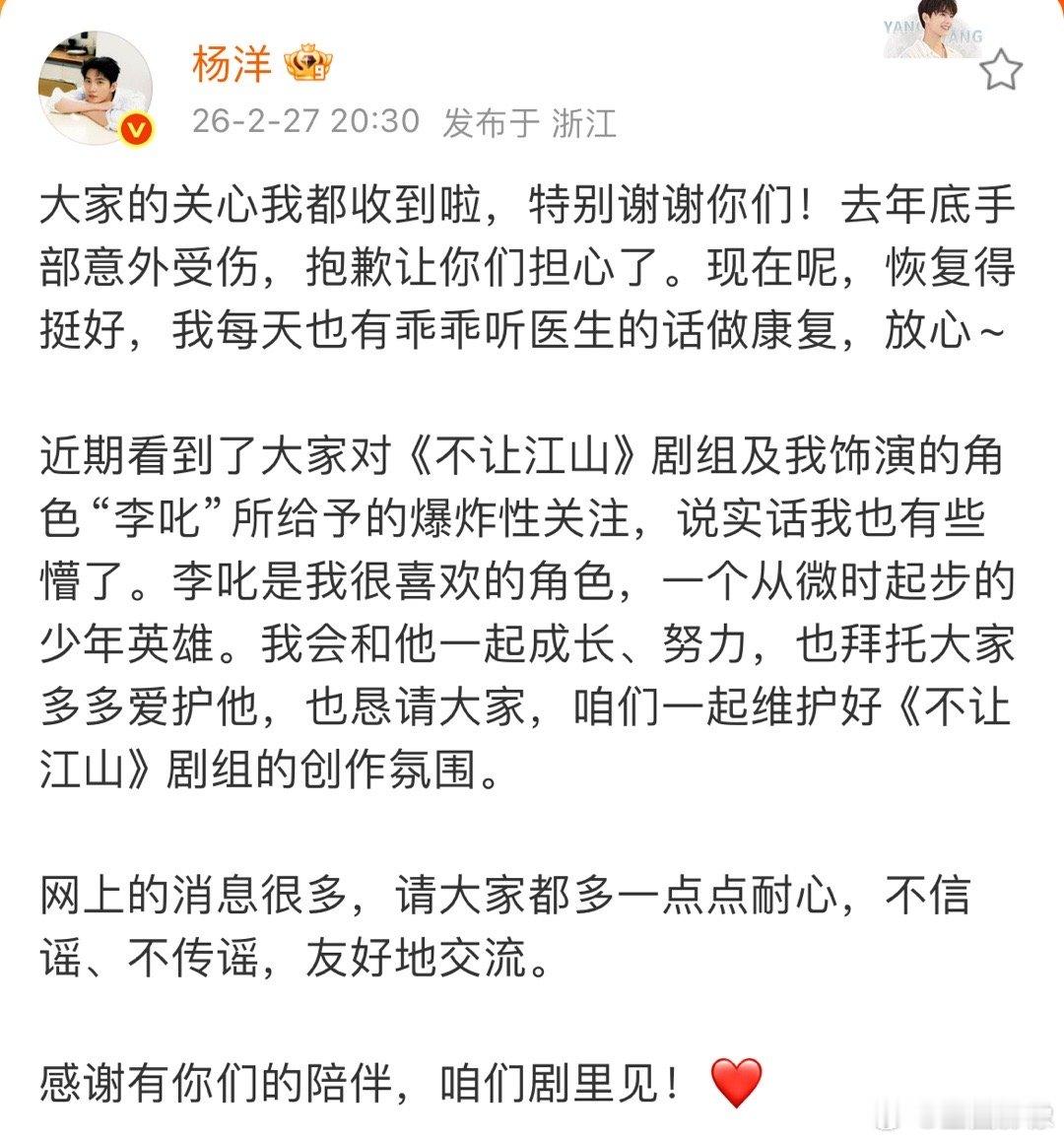 杨洋发文回应不让江山争议翻译第一段:手不是剧组弄伤的是我自己弄伤的。