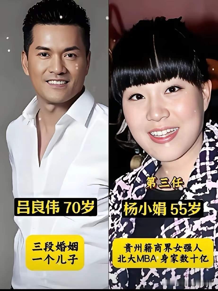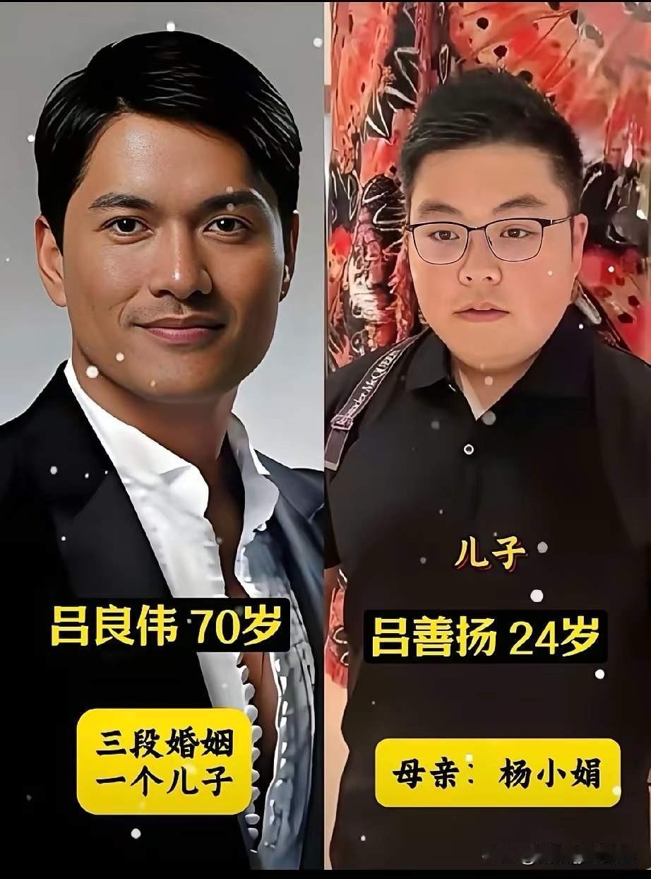 70岁的吕良伟三段婚姻,一个儿子,如今年逾古稀,依然像一个年轻小伙子,真是让人佩服。 周海媚是他的第一任妻子,两人颜值都绝绝子,郎才女貌只羡鸳鸯不羡仙,也曾恩爱甜蜜太幸福。 邝美云是第二任,颜值很是很高,像老牌明星,非常耐看,也很有辨识度,遗憾的是没有走到最后。 杨小娟是第三任,颜值比不上前两任,看起来更像一个普通女生,不过有一种温婉有气质,看起来挺体贴人的那一款。 最关键的是,她给吕良伟生了一个儿子,也是吕良伟唯一的一个儿子,也相当于有了爱情的结晶,两人平时恩爱低调幸福,在吕良伟过生日的时候,给他安排的很体面,生活里也比较用心照顾他。 儿子吕扬善虽然颜值没有赶上父亲吕良伟,但是看起来很踏实可靠,也有他的三分像,是普通人里的小帅哥,以后的路肯定也不会差。