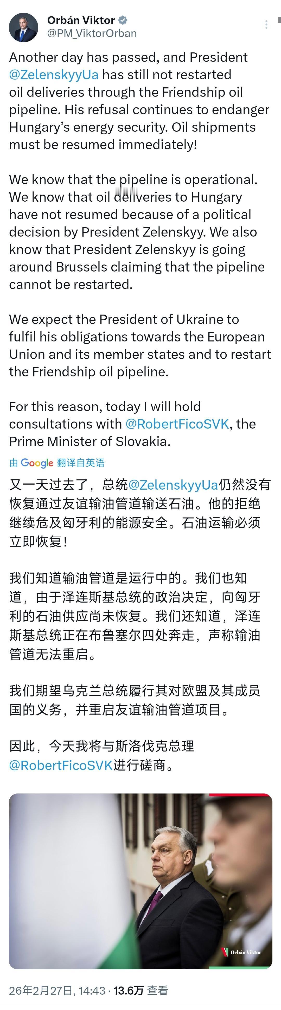 匈牙利总理欧尔班今天(北京时间2月27日)写道:“又一天过去了,泽连斯基总统仍然没有恢复通过友谊输油管道输送石油。他的拒绝继续危及匈牙利的能源安全。石油运输必须立即恢复! 我们知道输油管道是运行中的。我们也知道,由于泽连斯基总统的政治决定,向匈牙利的石油供应尚未恢复。我们还知道,泽连斯基总统正在布鲁塞尔四处奔走,声称输油管道无法重启。 我们期望乌克兰总统履行其对欧盟及其成员国的义务,并重启友谊输油管道项目。因此,今天我将与斯洛伐克总理菲佐进行磋商。” [机智]评几句:欧尔班的怒斥,彻底撕开了欧盟表面团结的假面具,更让匈斯与乌克兰之间的信任裂痕裂成鸿沟。泽连斯基一边在布鲁塞尔用技术借口欺瞒欧盟、索要援助,一边却执意以政治手段掐断友谊输油管道。而欧盟对此的和稀泥态度,恰恰暴露了其内部的深度分裂:一边是冯德莱恩等人强推对俄制裁、力挺乌克兰的政治正确,一边是匈斯为保本国能源利益否决制裁、叫停对乌援助的现实反击,这种政经撕裂让欧盟的所谓联盟规则沦为笑柄。欧尔班火速与菲佐磋商,正是匈斯抱团反制的明确信号,两国因能源安全遭威胁早已对乌失去信任,这场争端更是欧盟所谓“团结”遮羞布下,成员国立场对立、乌方毫无契约精神的真实写照。