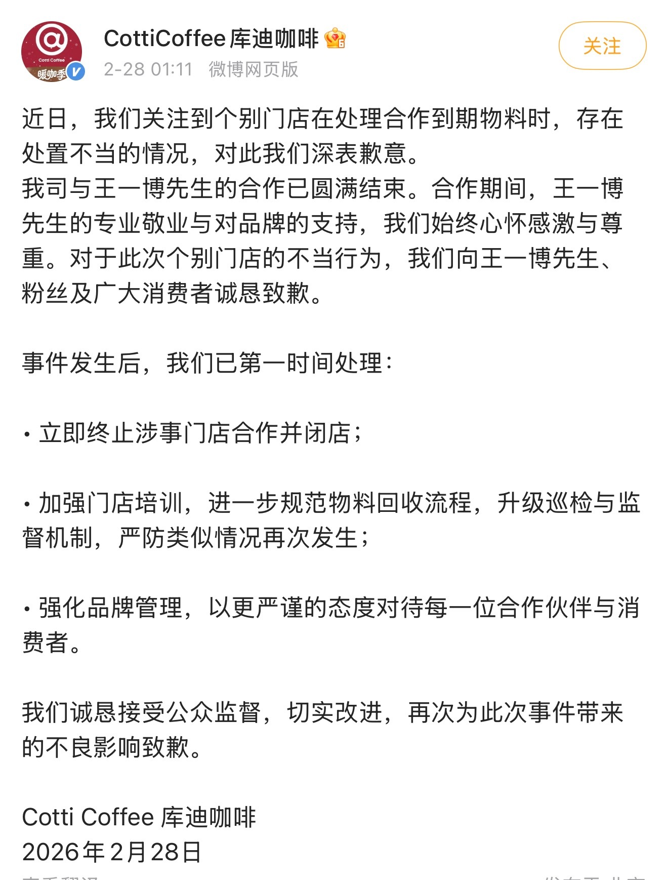 库迪 销毁王一博物料库迪咖啡给代言人王一博道歉了终止了门店合作并闭店加强培训和管理